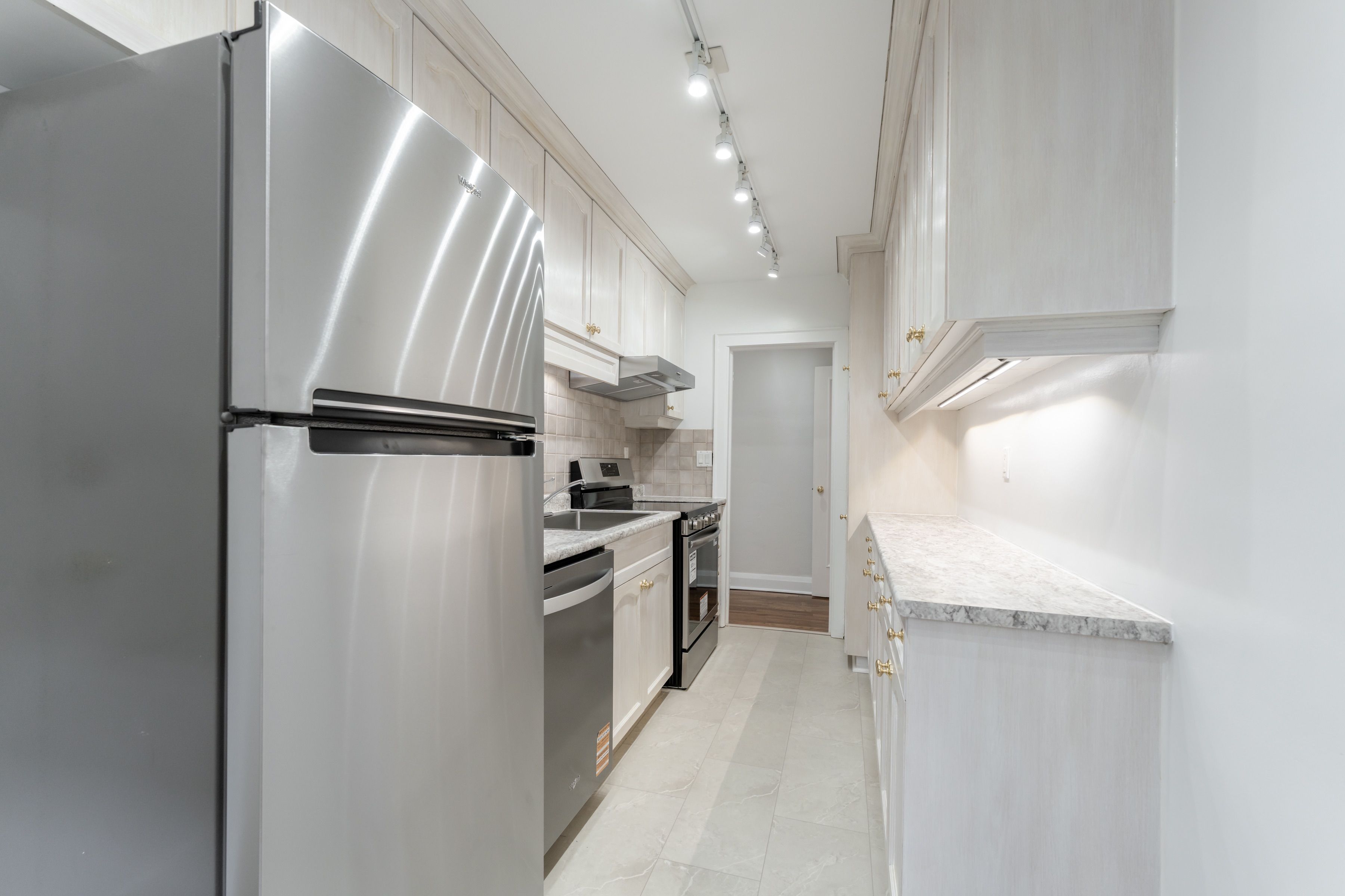• Spacious kitchen with new stainless steel appliances and ample cabinetry.