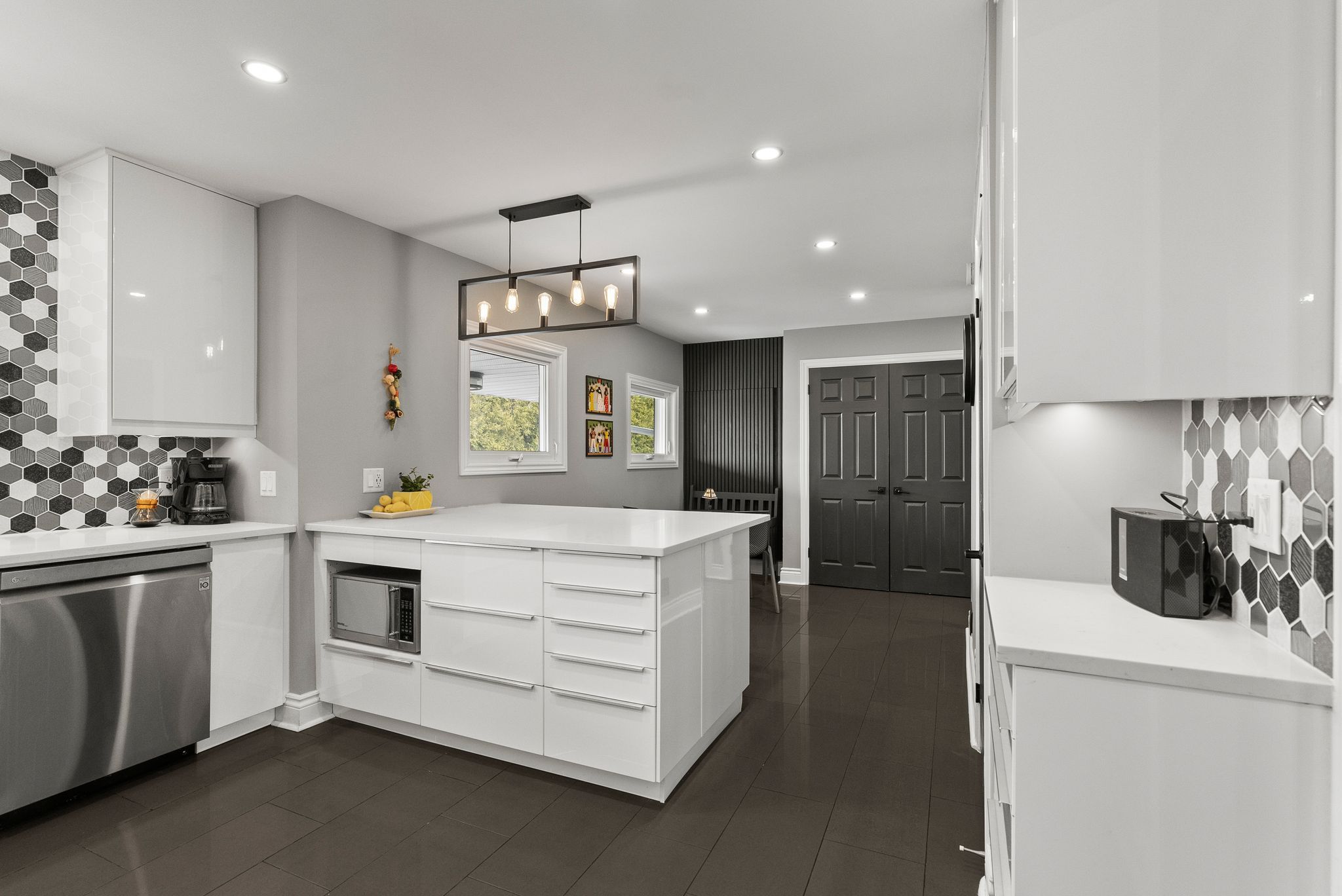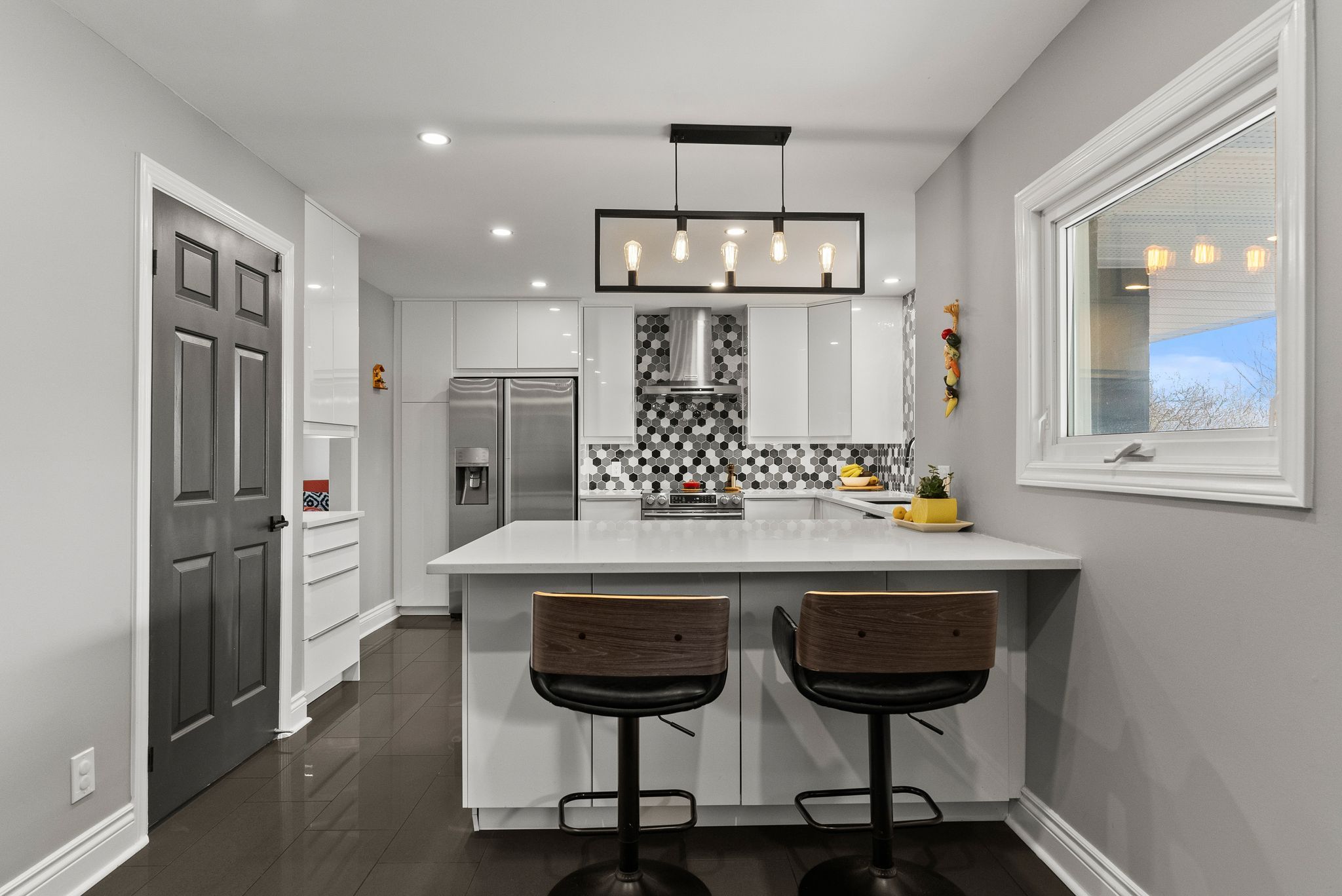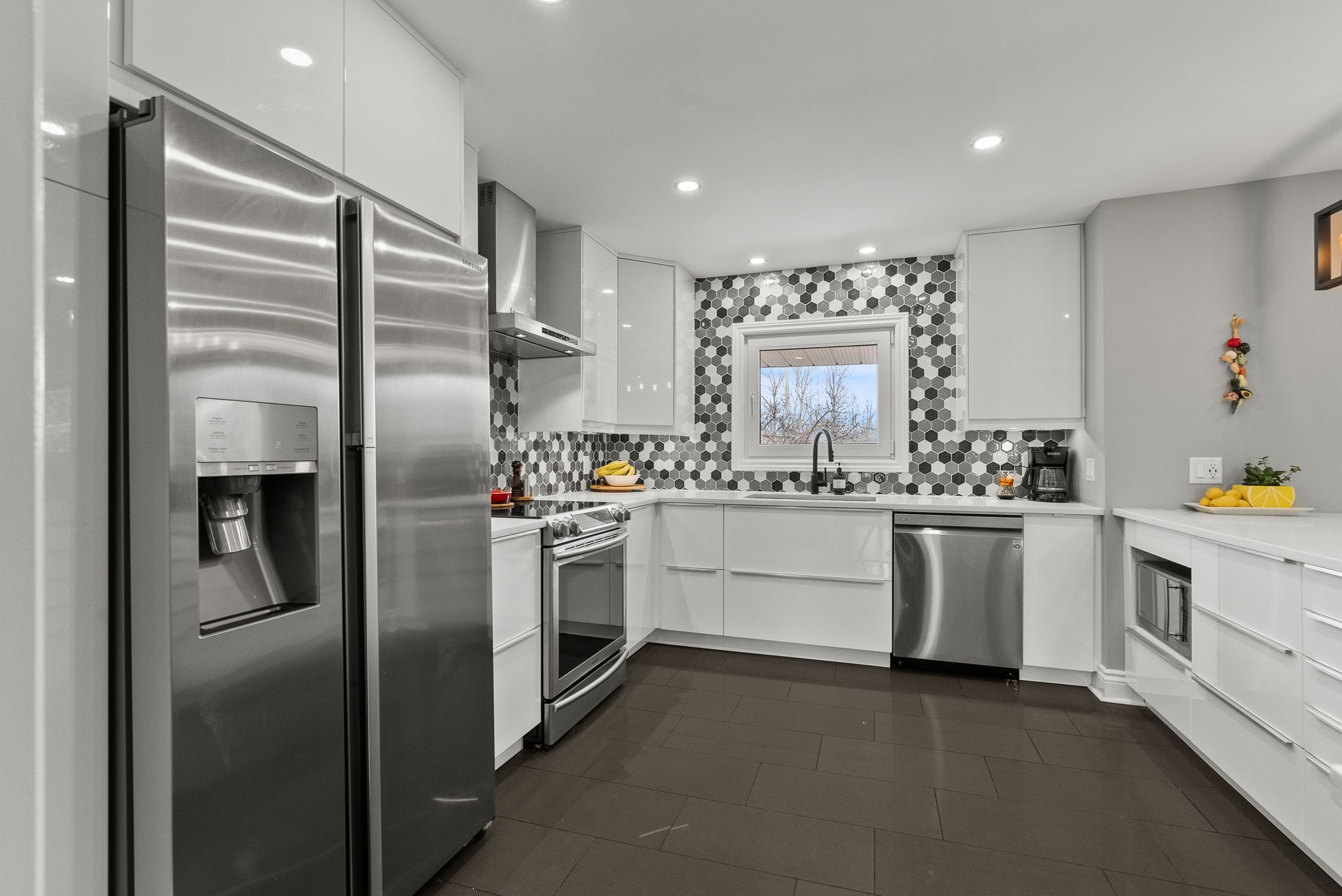 • Renovated kitchen with quartz countertops and stainless steel appliances.