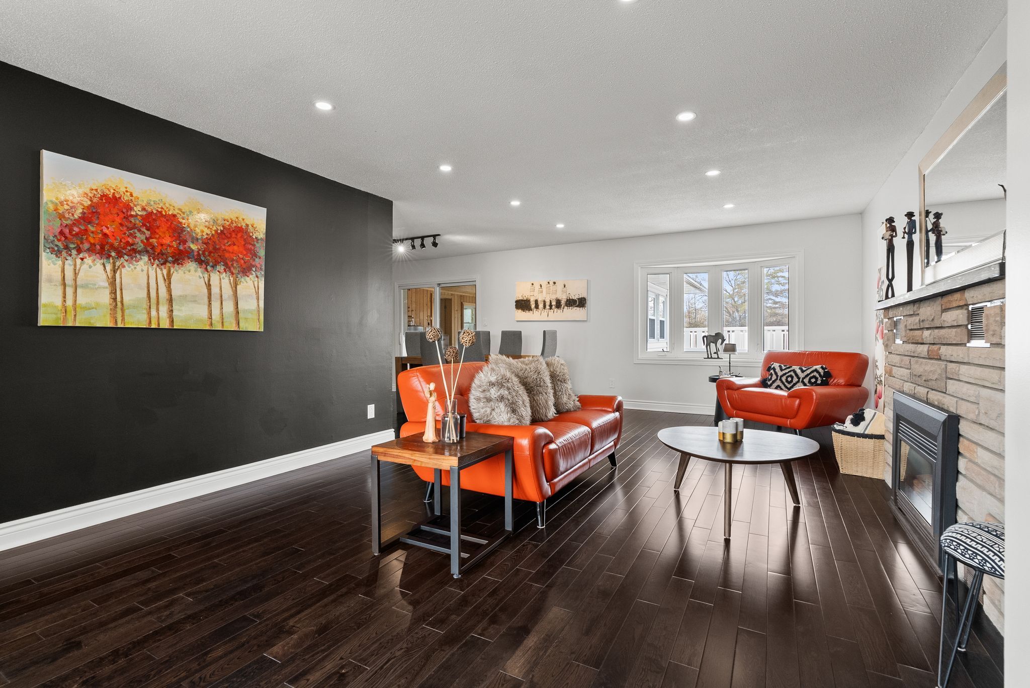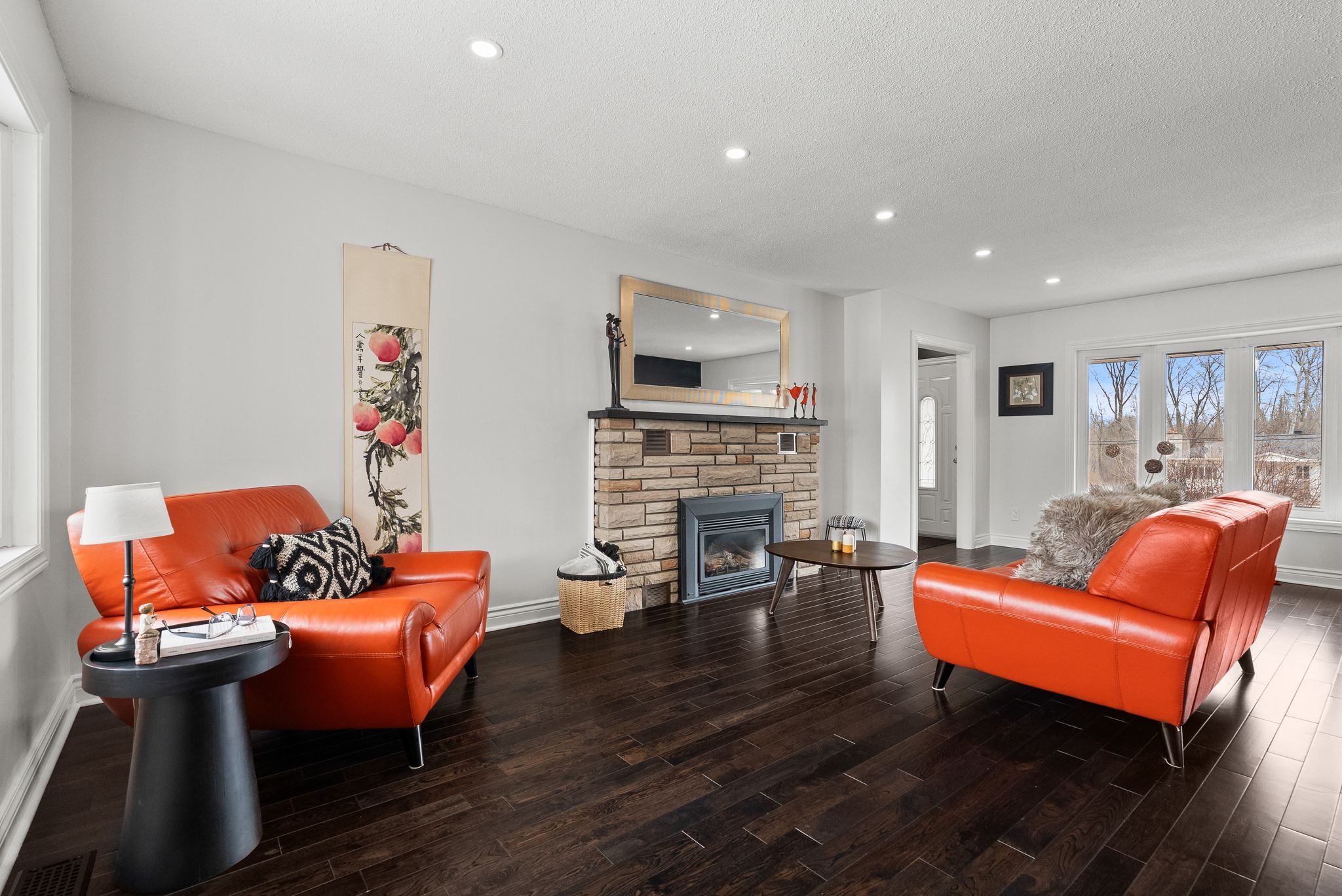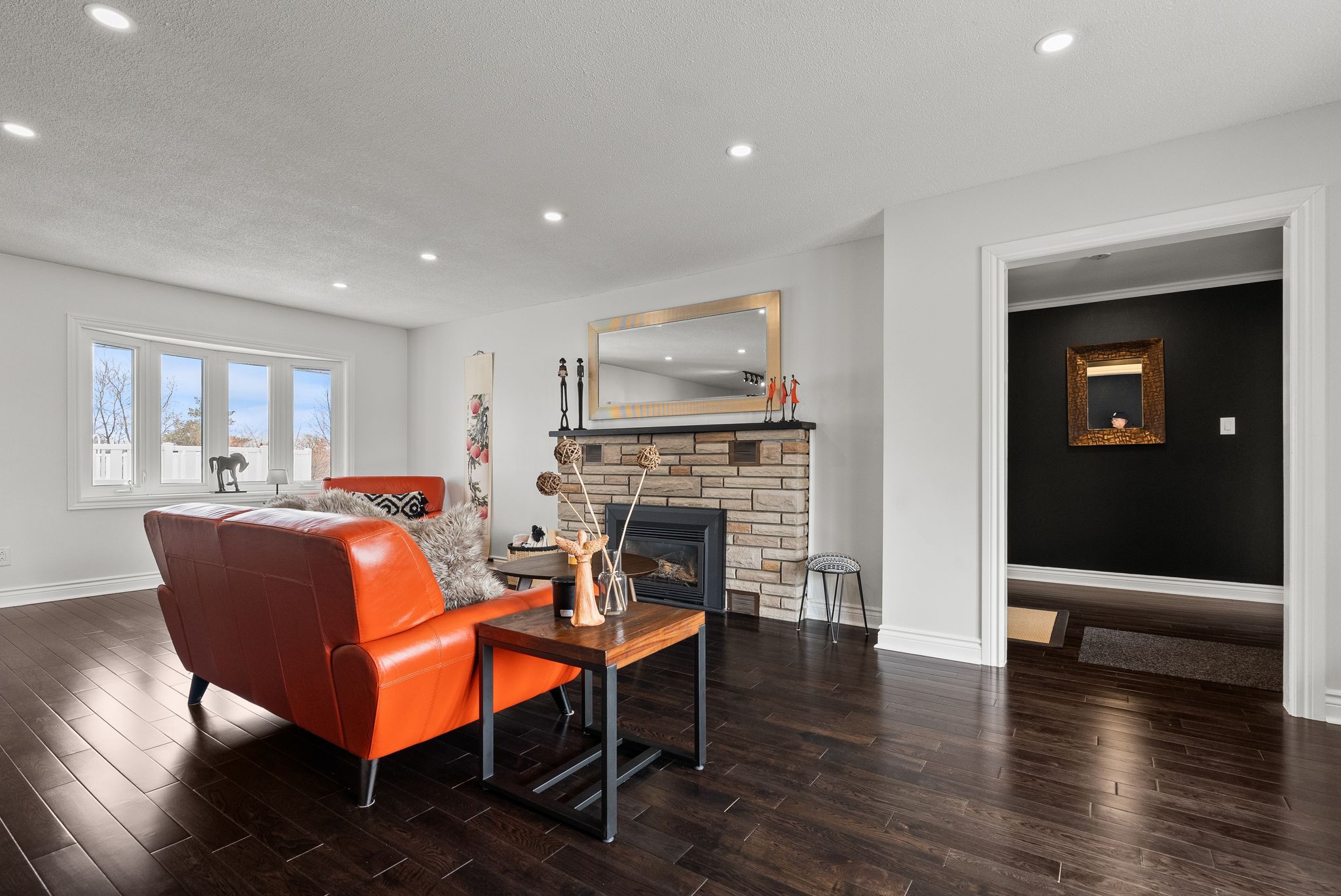 • Spacious living room with a cozy gas fireplace and hardwood floors.