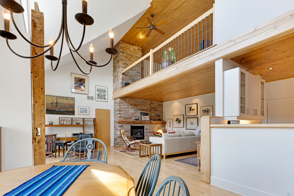 • Spacious open-concept living area featuring a dramatic stone fireplace.