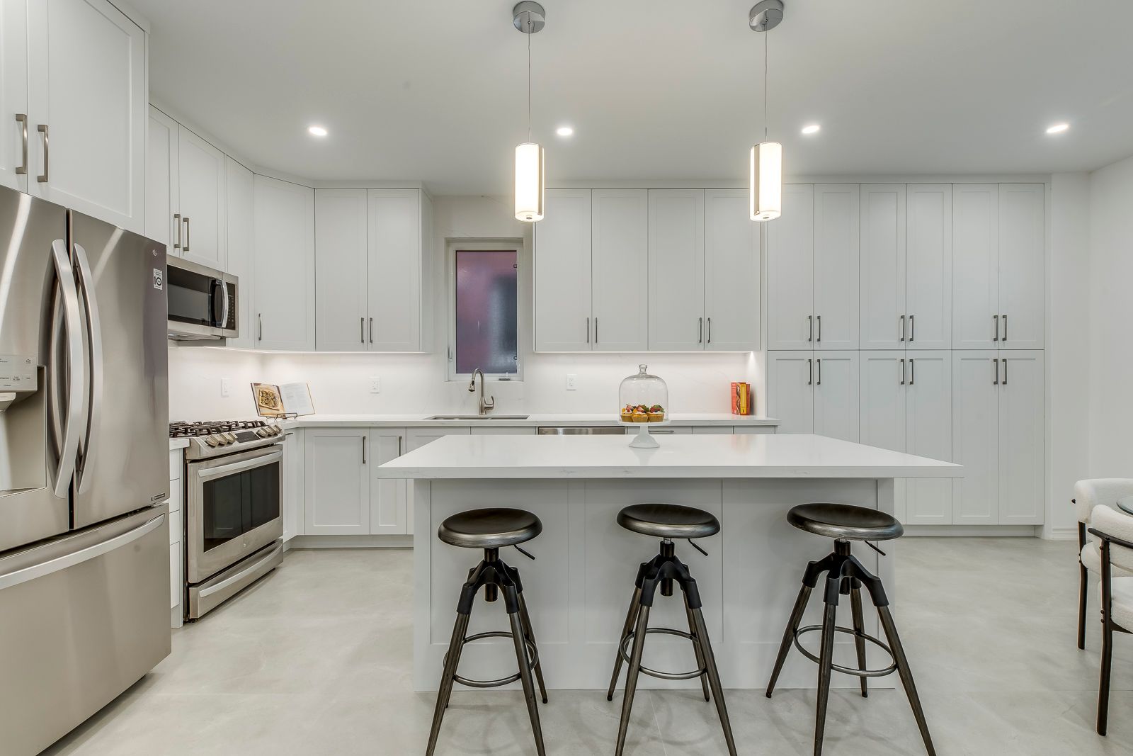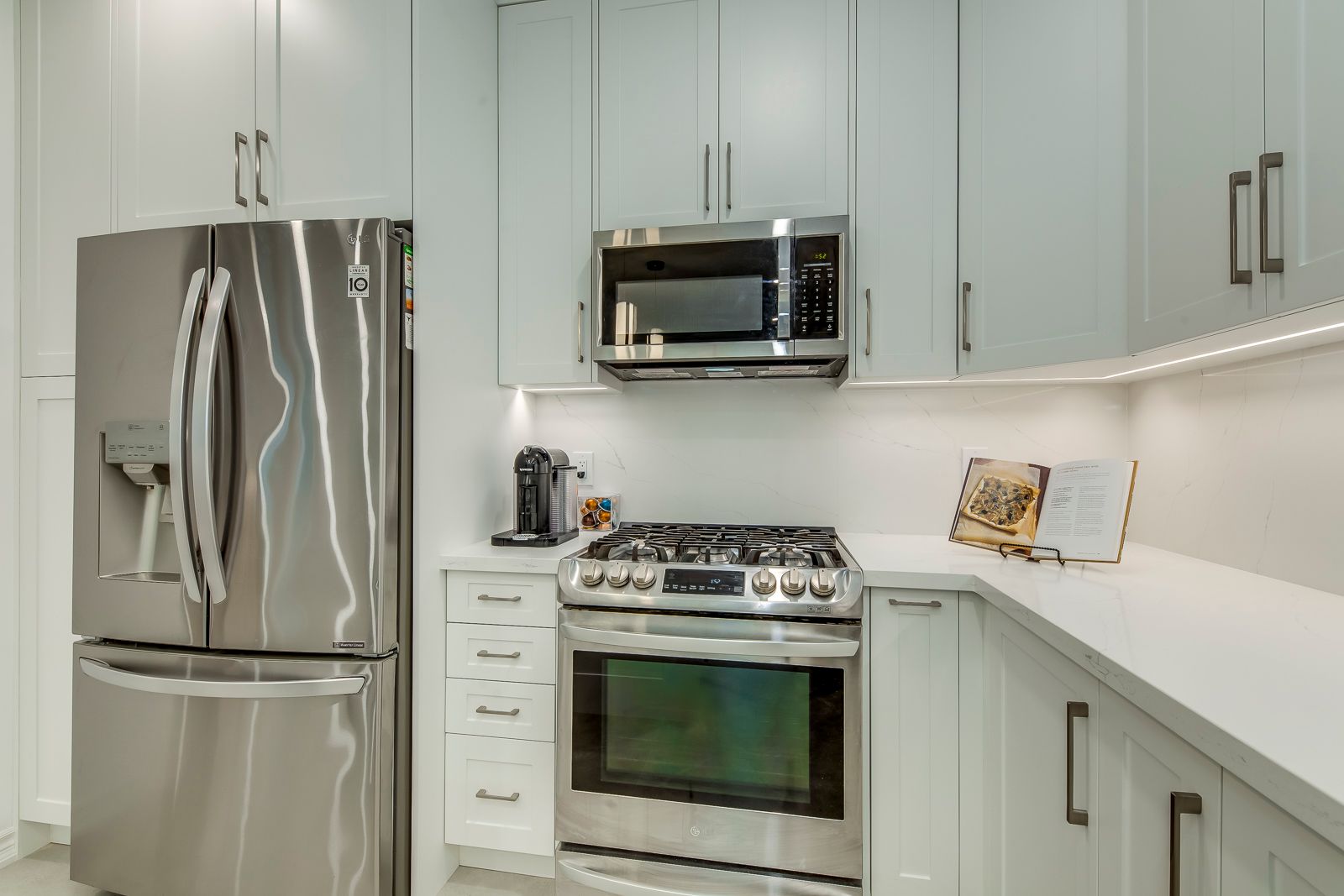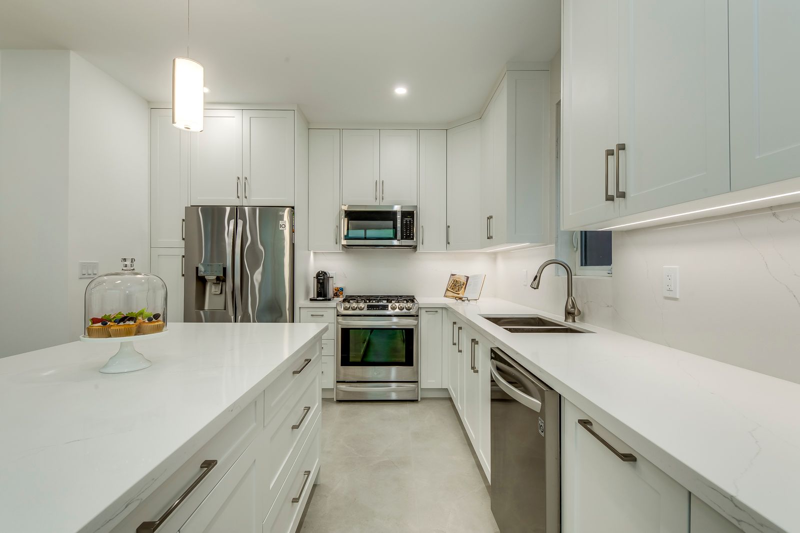 • Designer kitchen with custom cabinetry and polished quartz countertops.