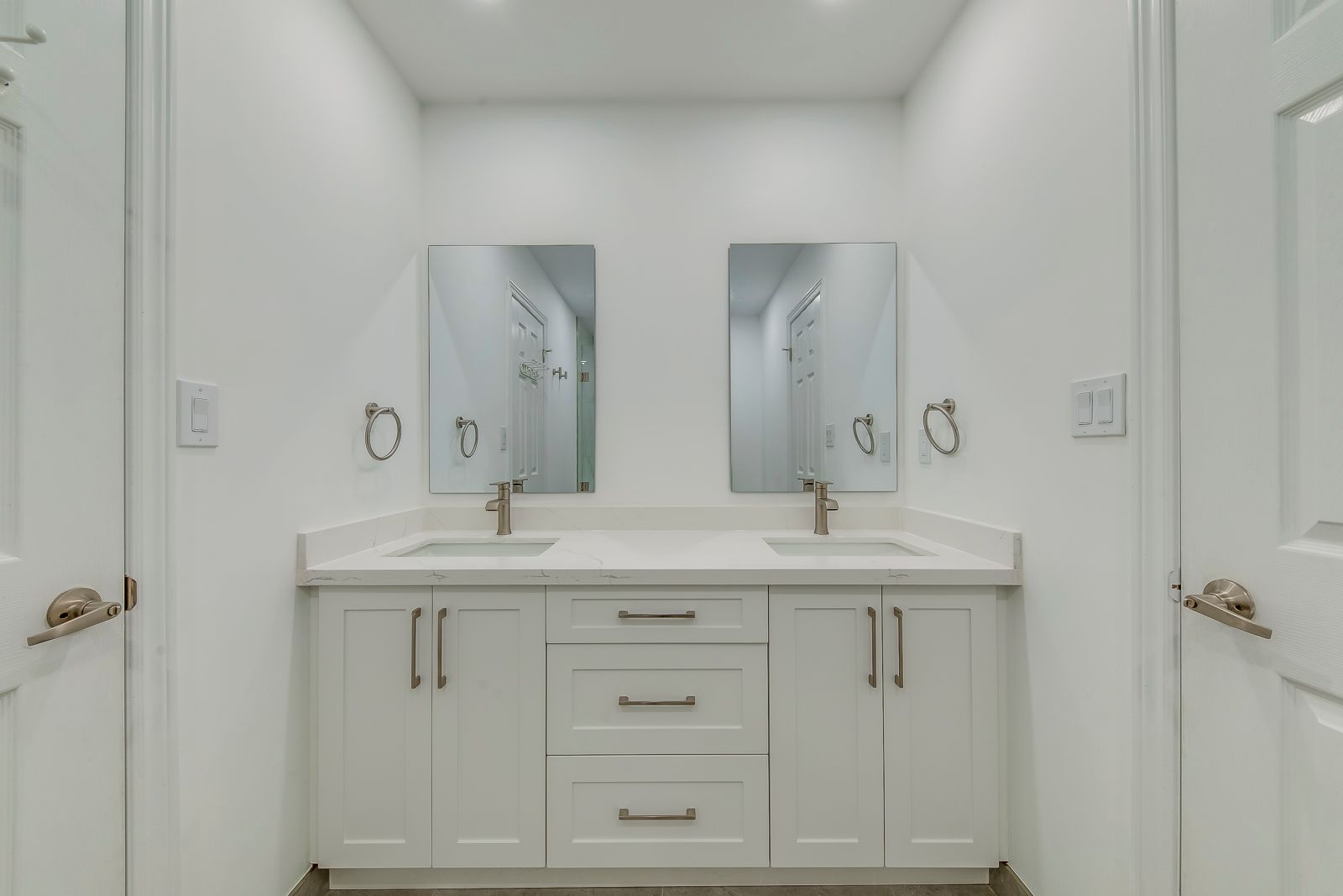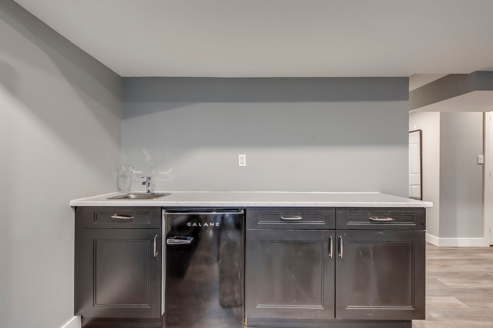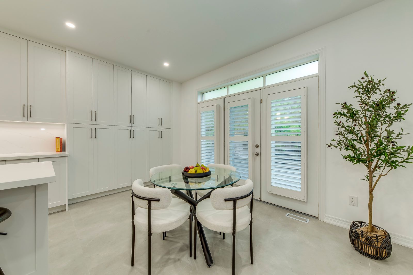 • Designer kitchen with custom cabinetry and polished quartz countertops.