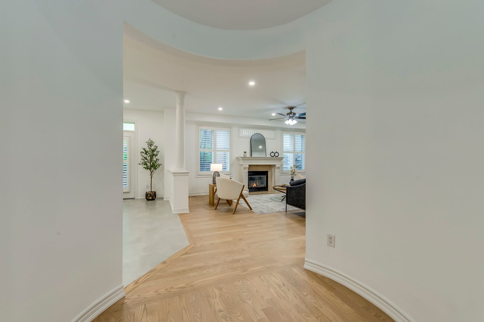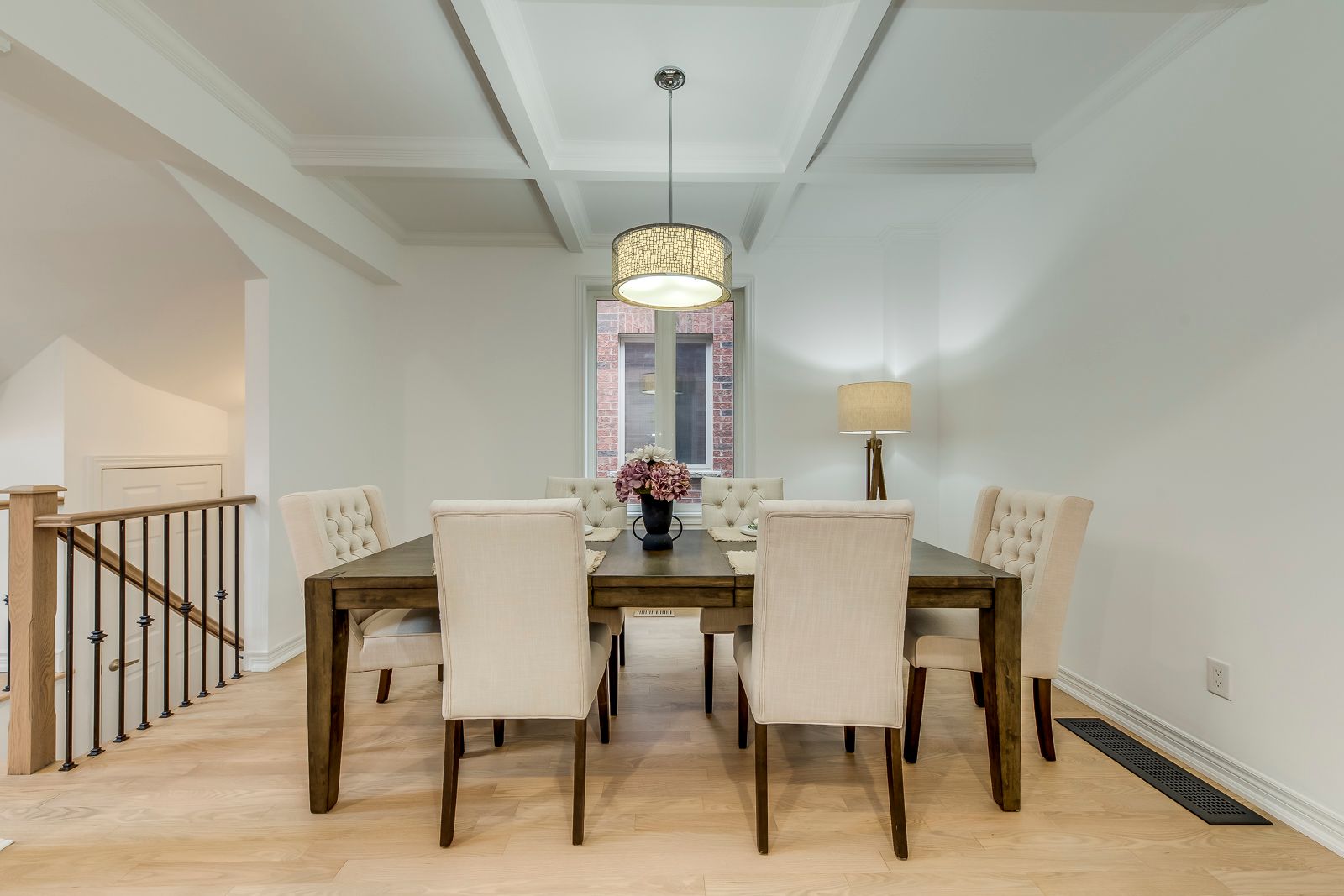 • Spacious open-concept layout with coffered ceilings and gas fireplace.