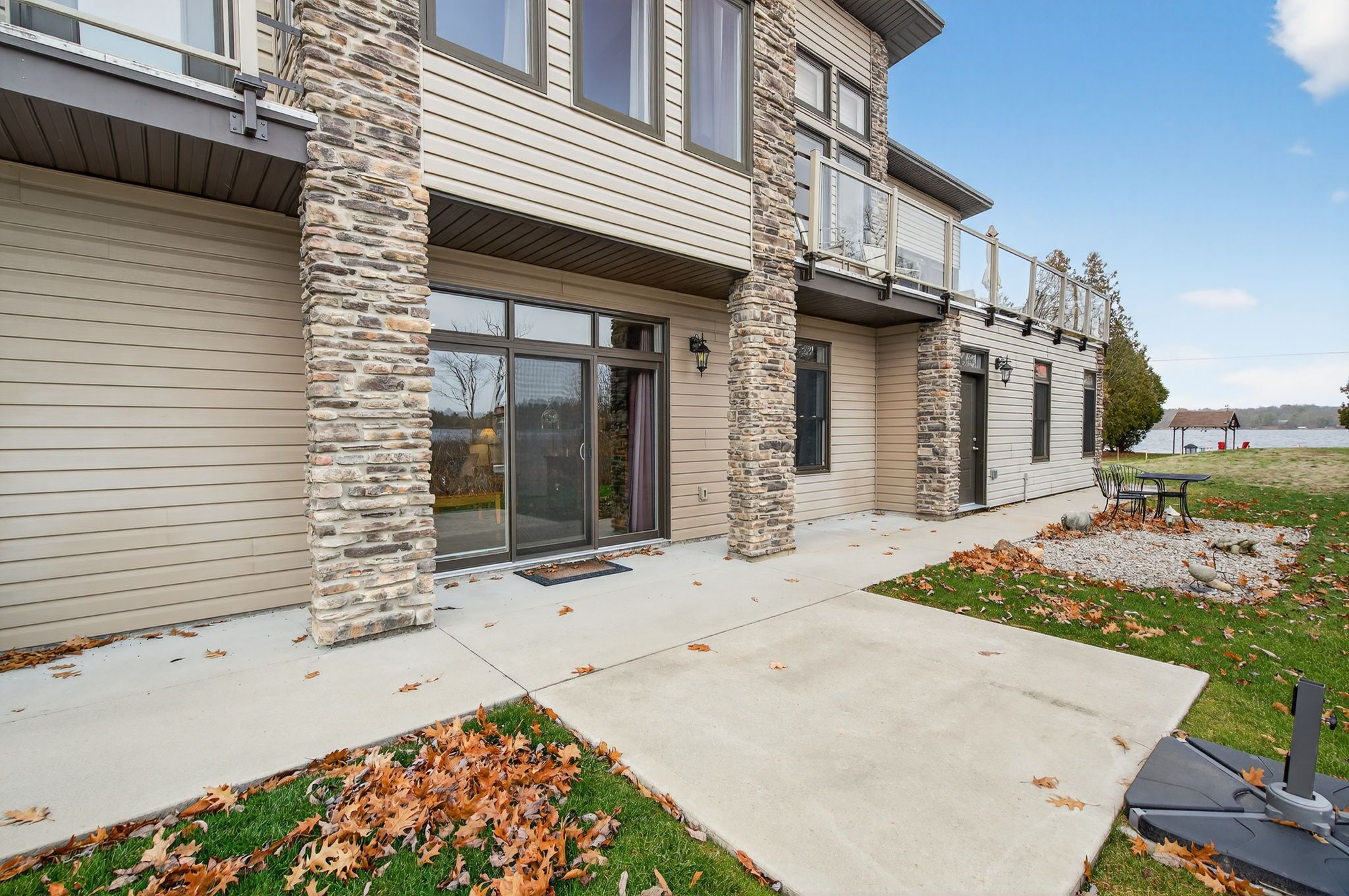 • Contemporary lakefront home with stunning window walls and stone columns.