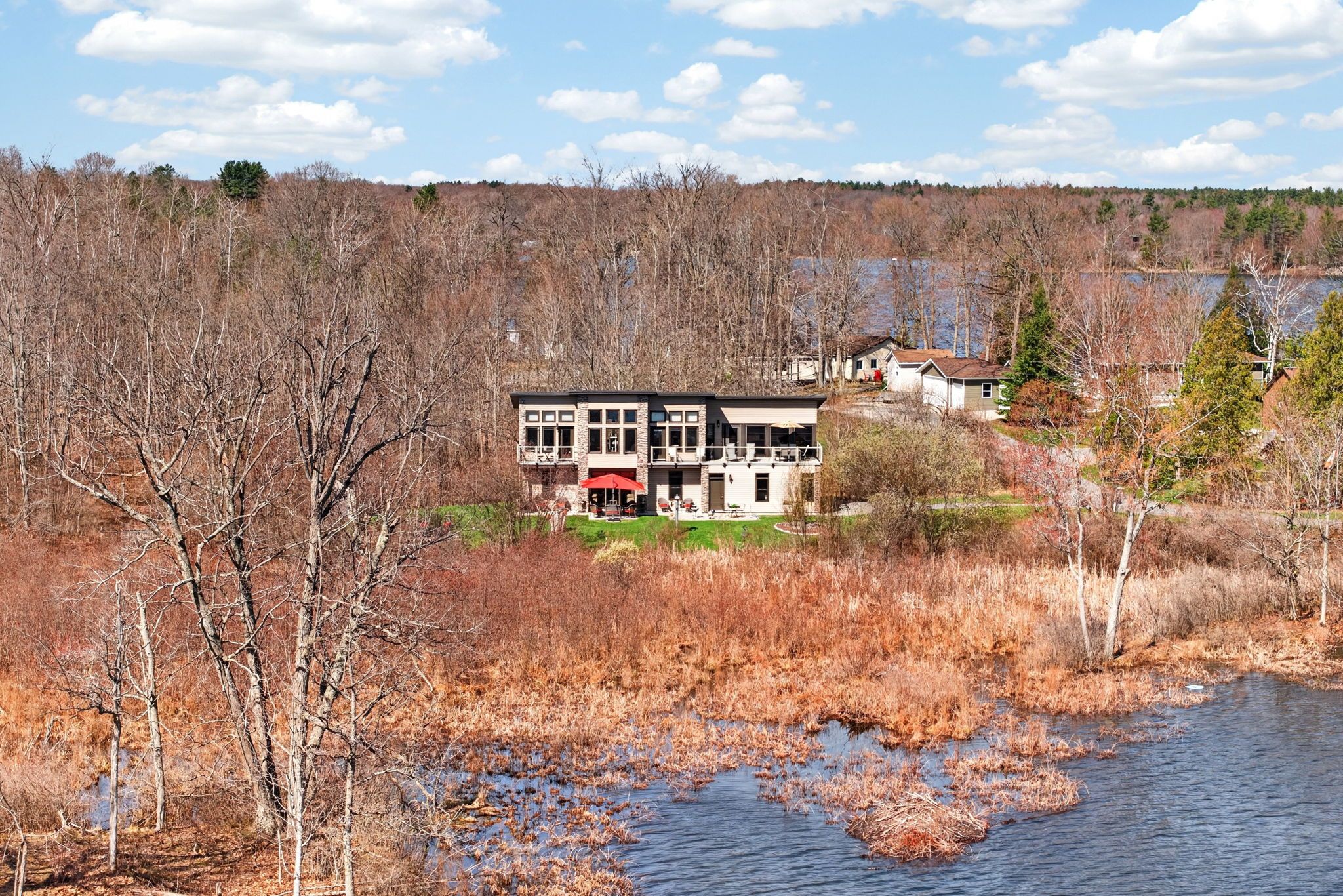 • Contemporary lakefront home with stunning window walls and stone columns.