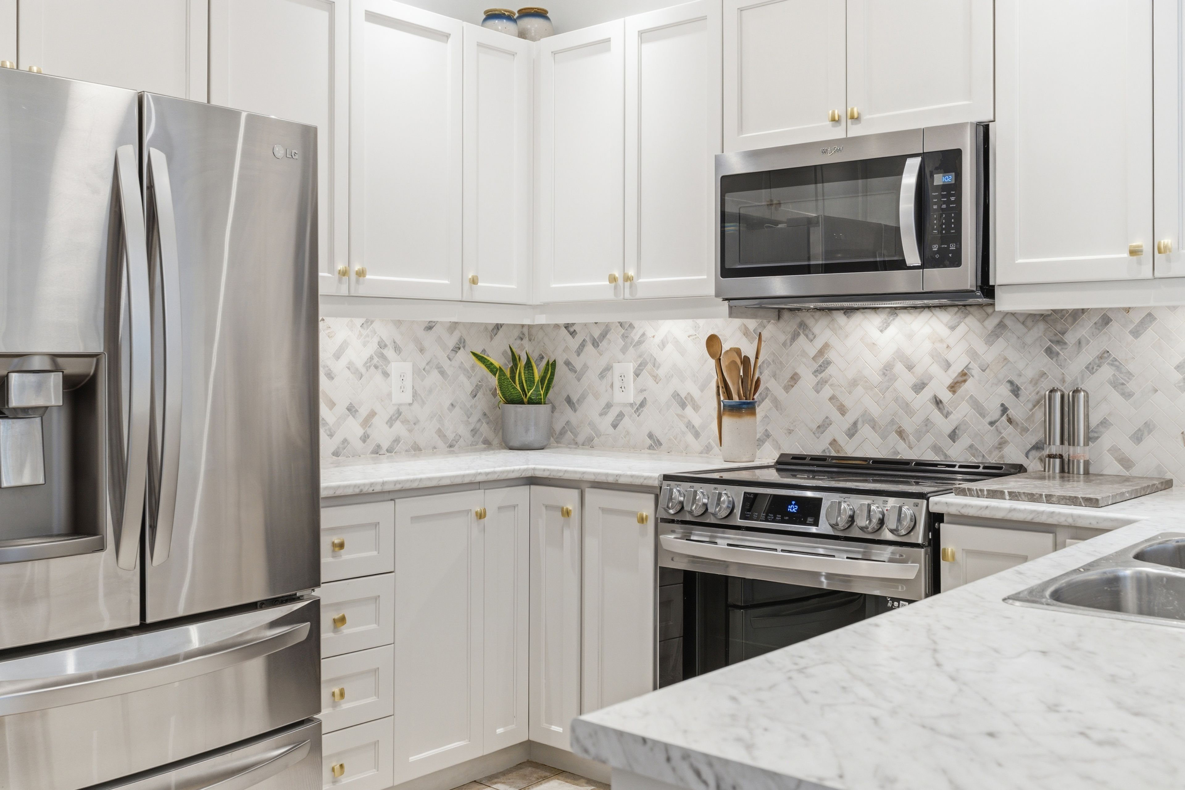 • Modern kitchen features stainless steel appliances and a walk-out to a deck.