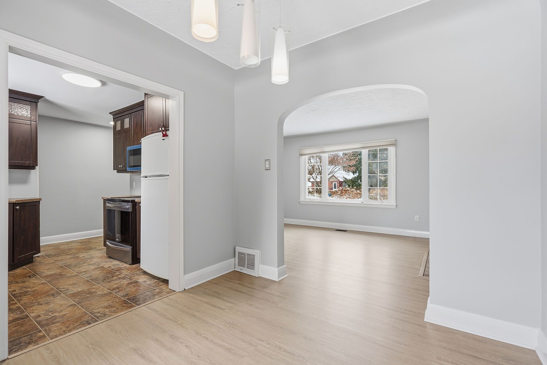 • Welcoming living room with a gas fireplace and large front window.