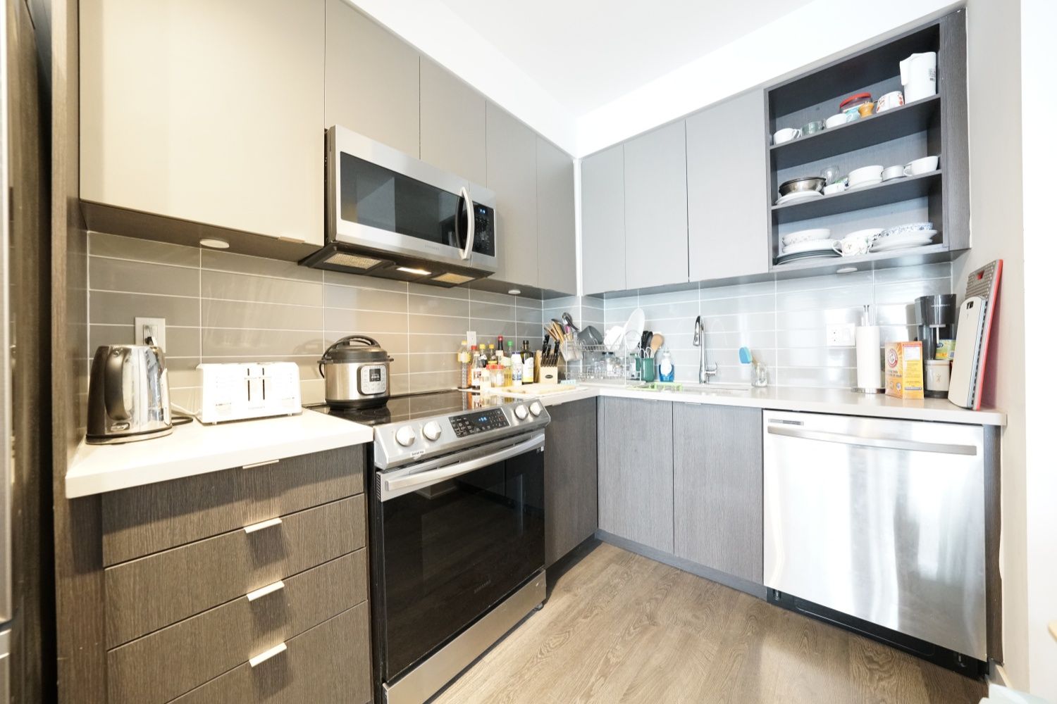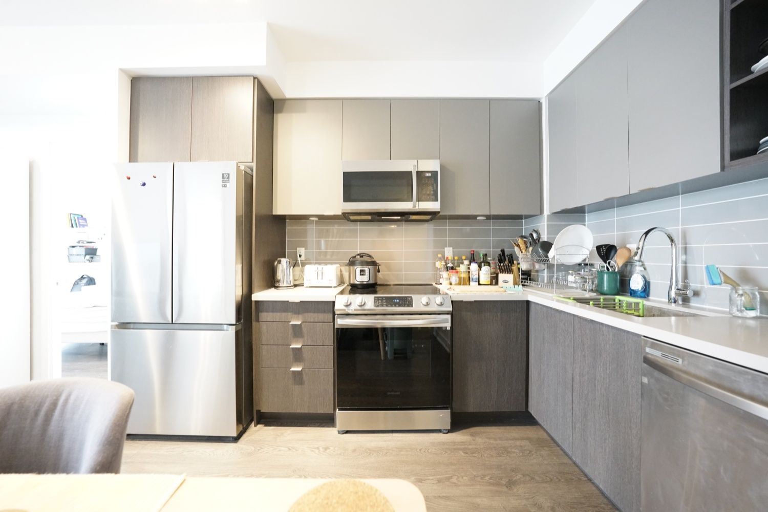 • Contemporary kitchen and primary bedroom with ensuite and walk-in closet.