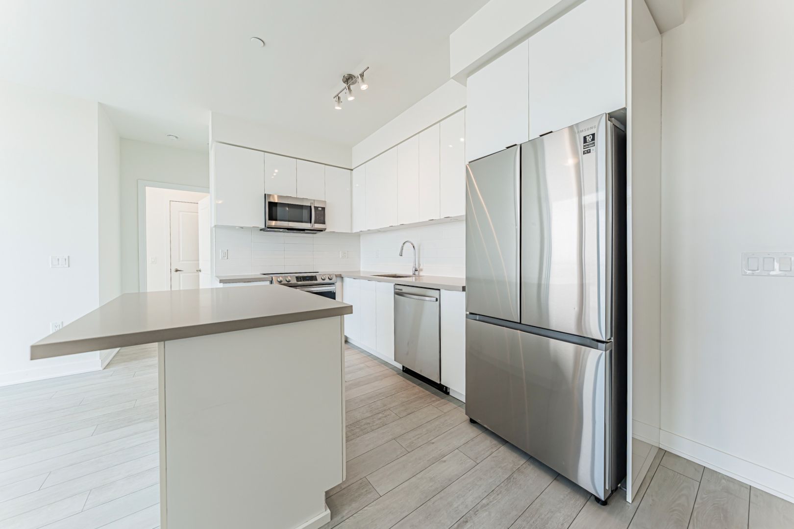 • Modern kitchen with quartz countertops and stainless steel appliances.