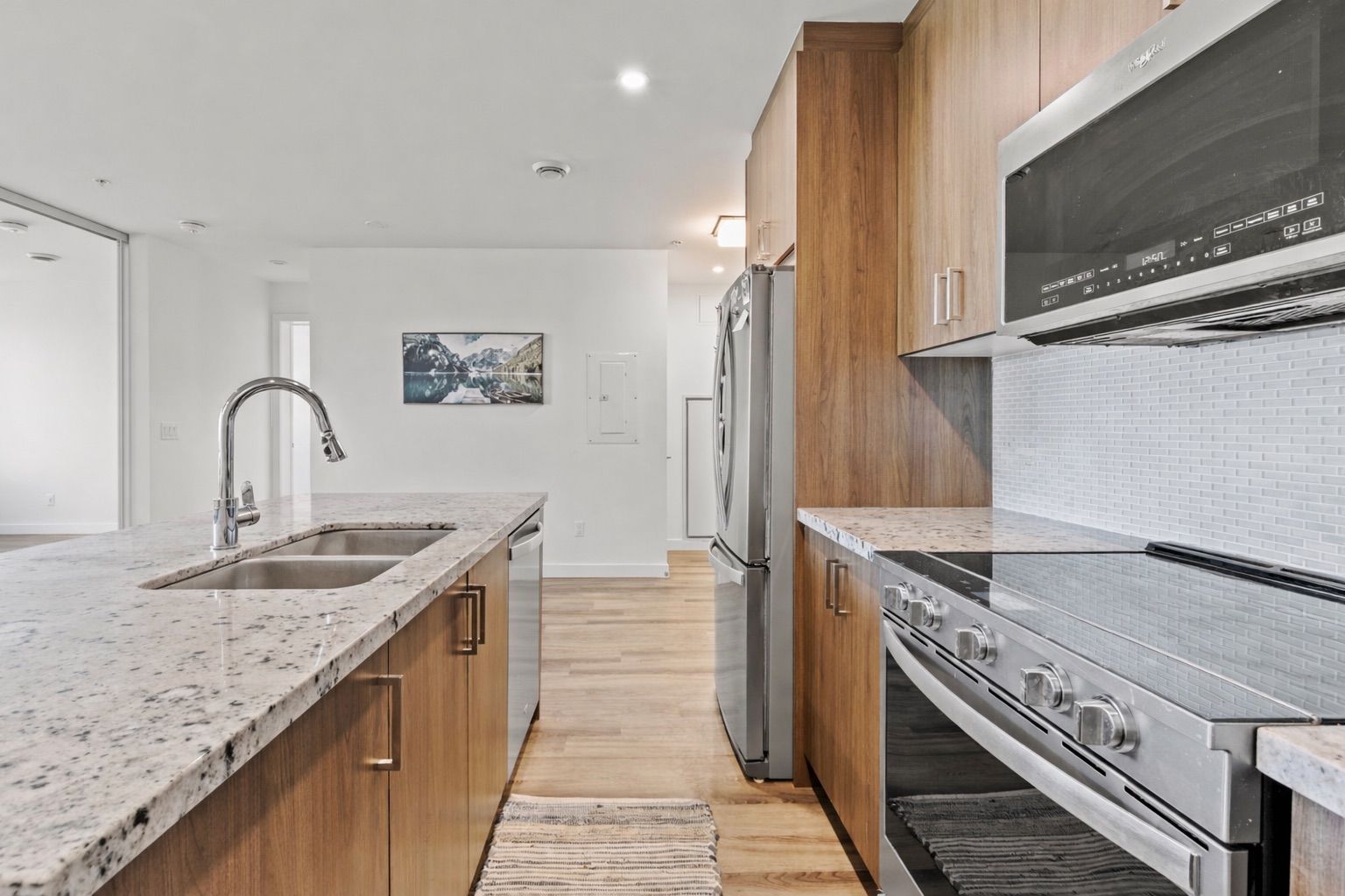 • Modern kitchen with large island, stone countertops, and stainless steel appliances.