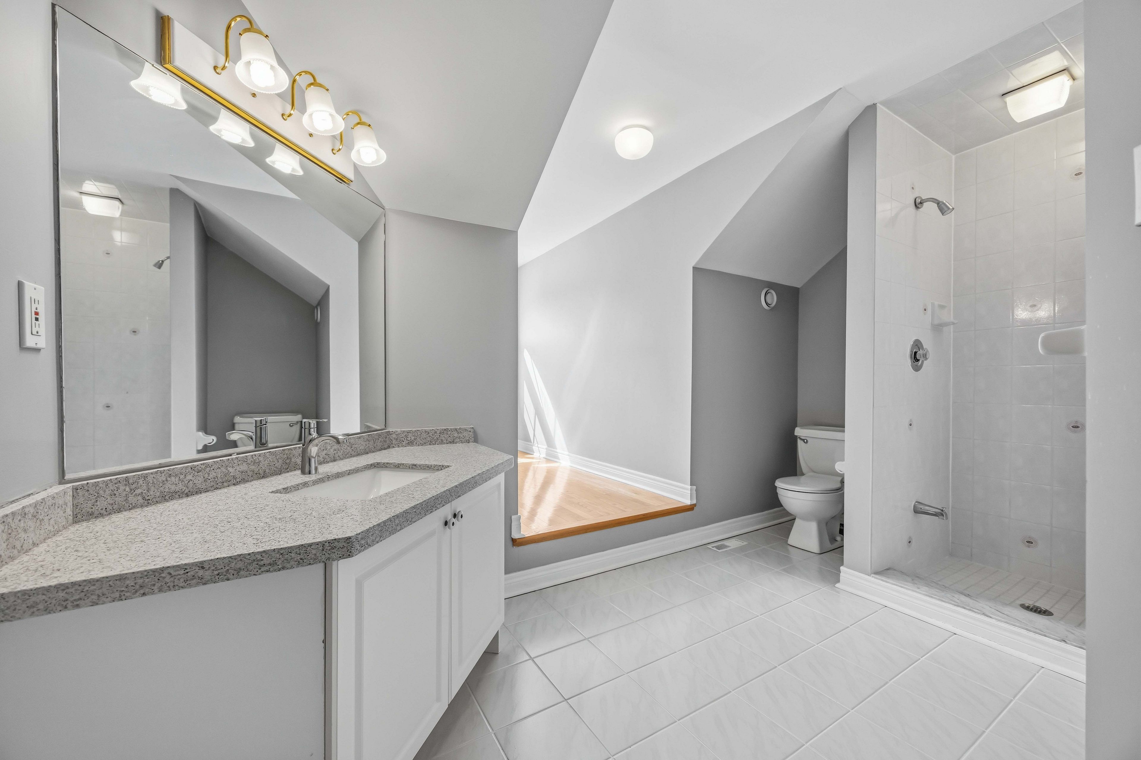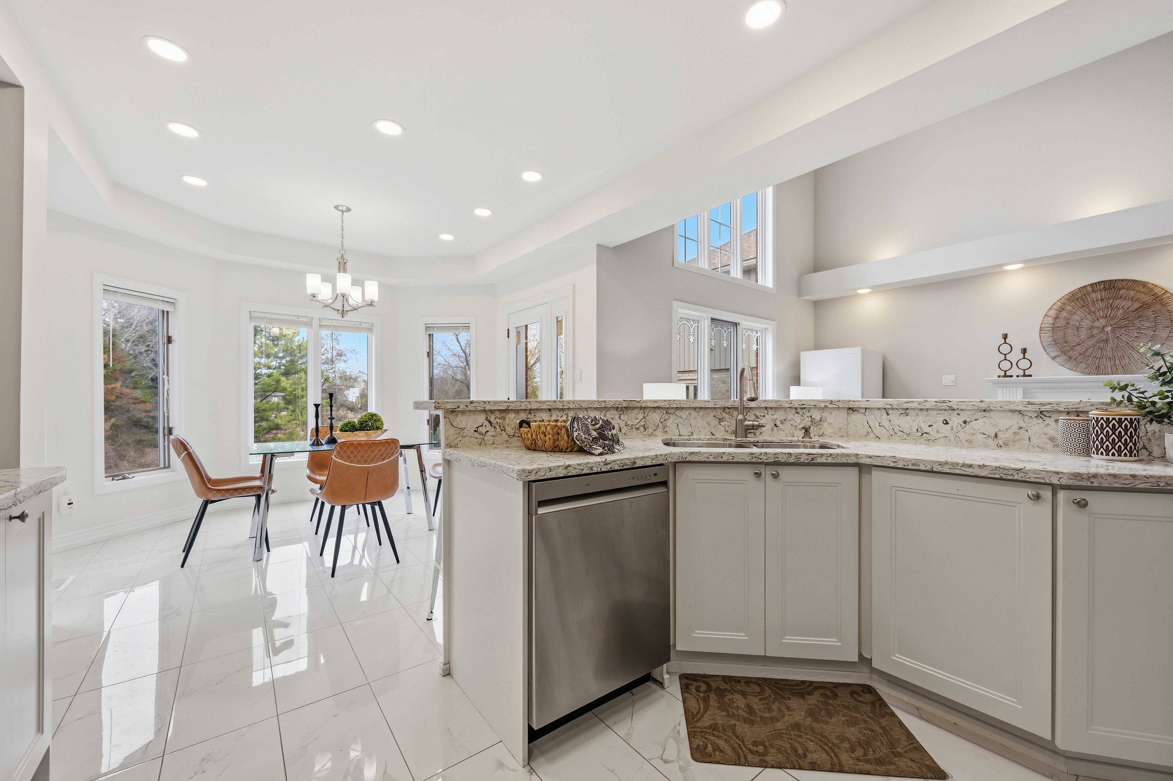 • Renovated kitchen with quartz countertops and updated stainless steel appliances.
