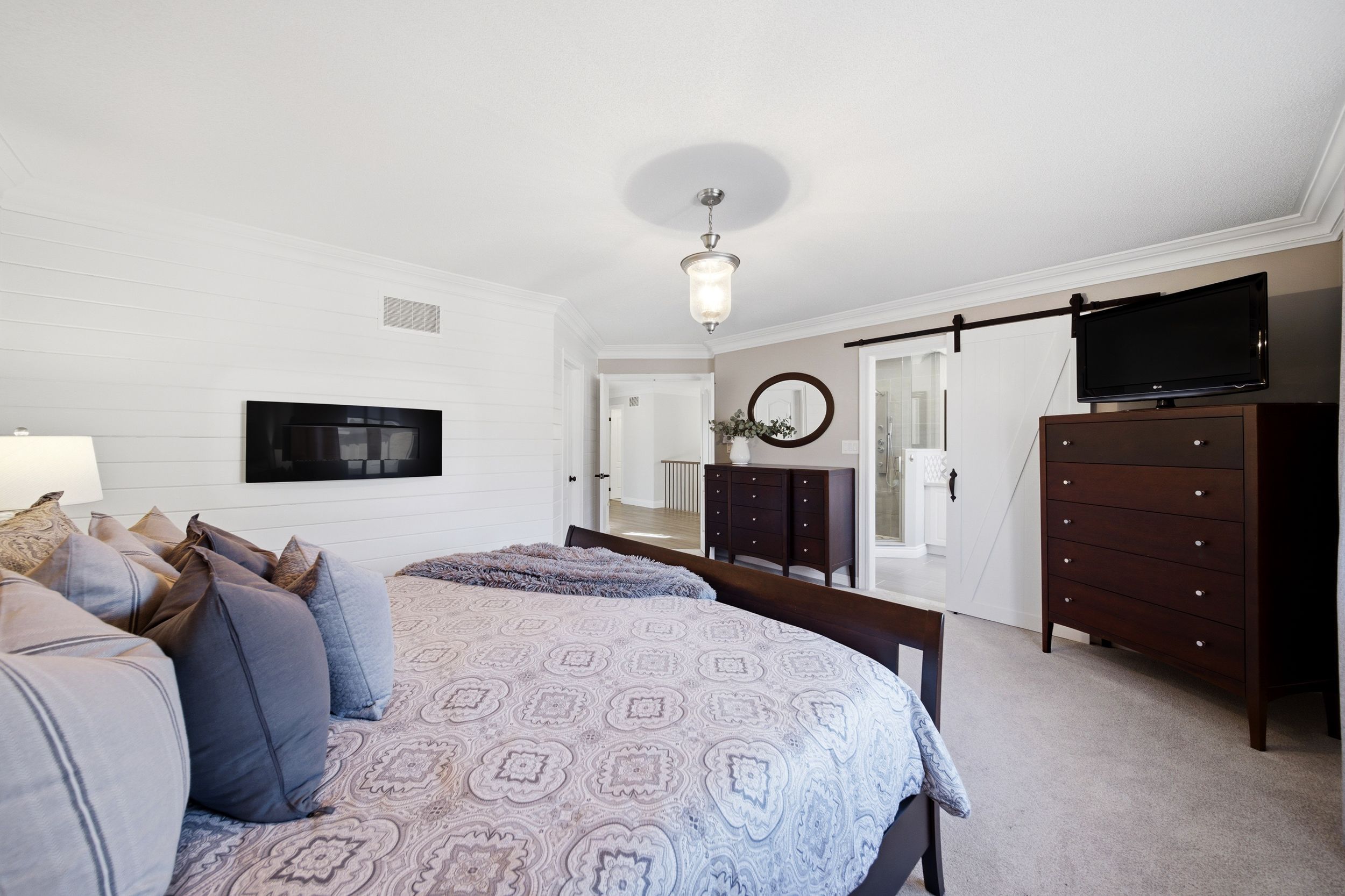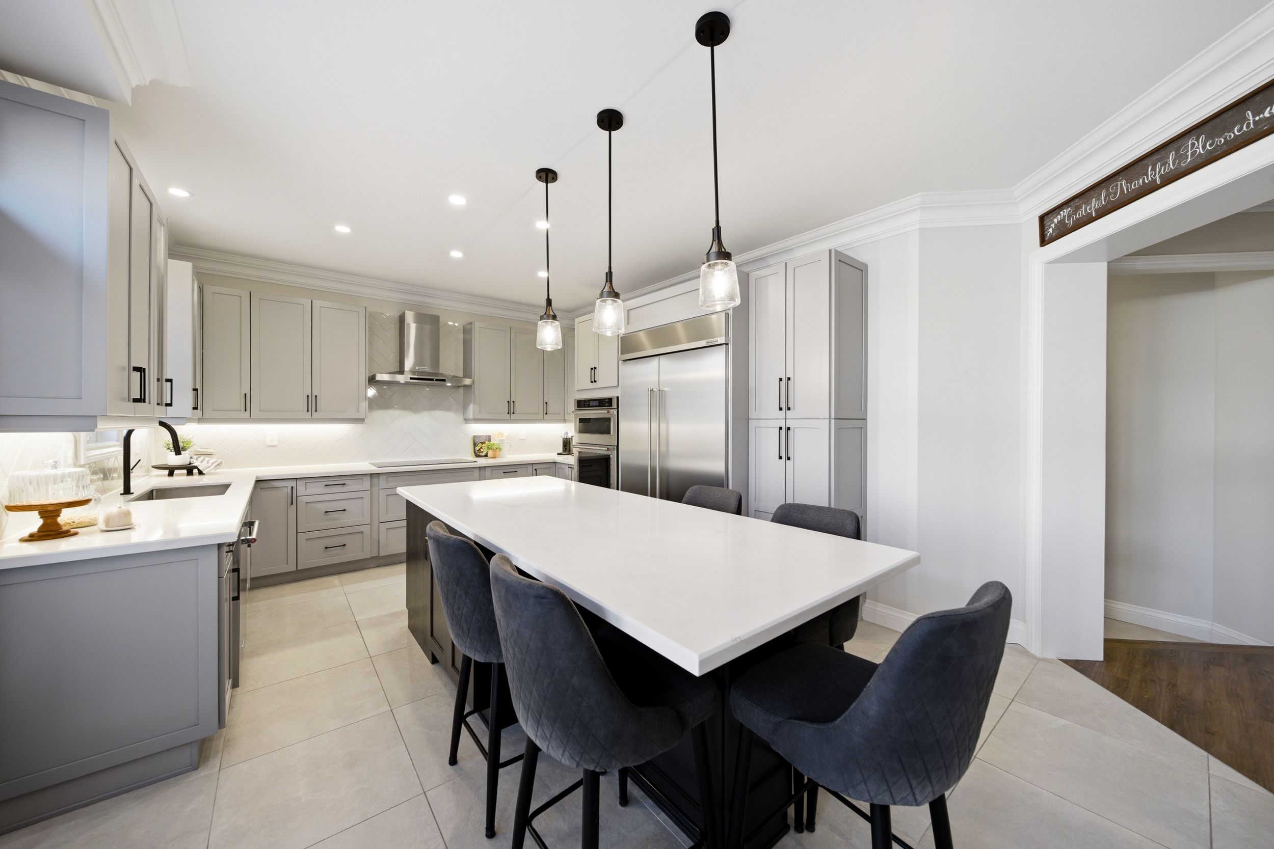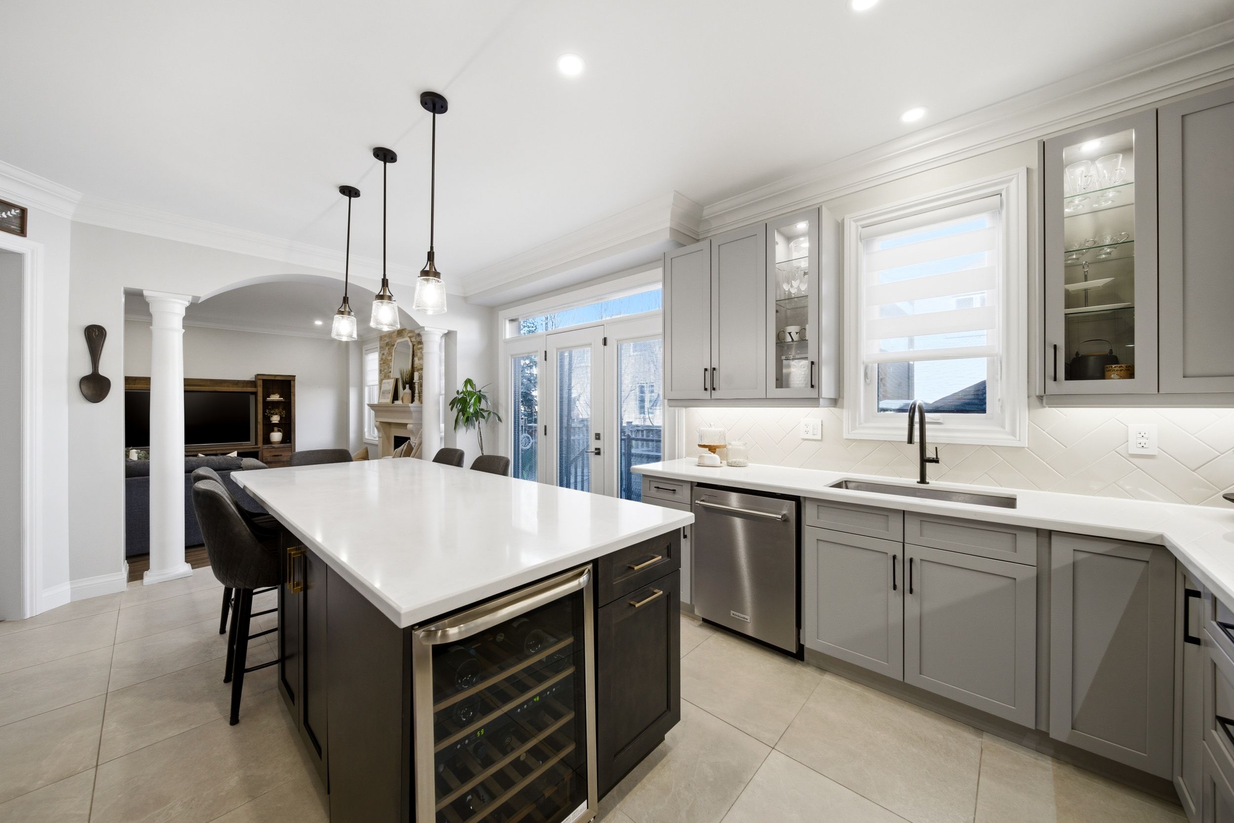 • Stylish kitchen with quartz island, SS appliances, and double ovens.