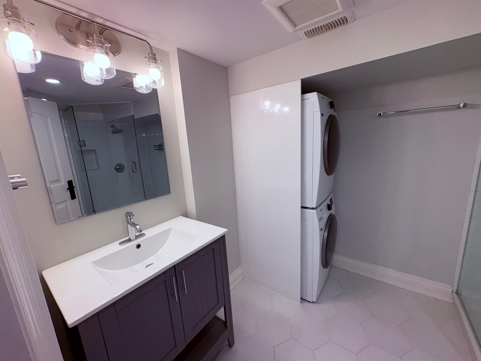 • Convenient private ensuite washer and dryer included for ease of use.