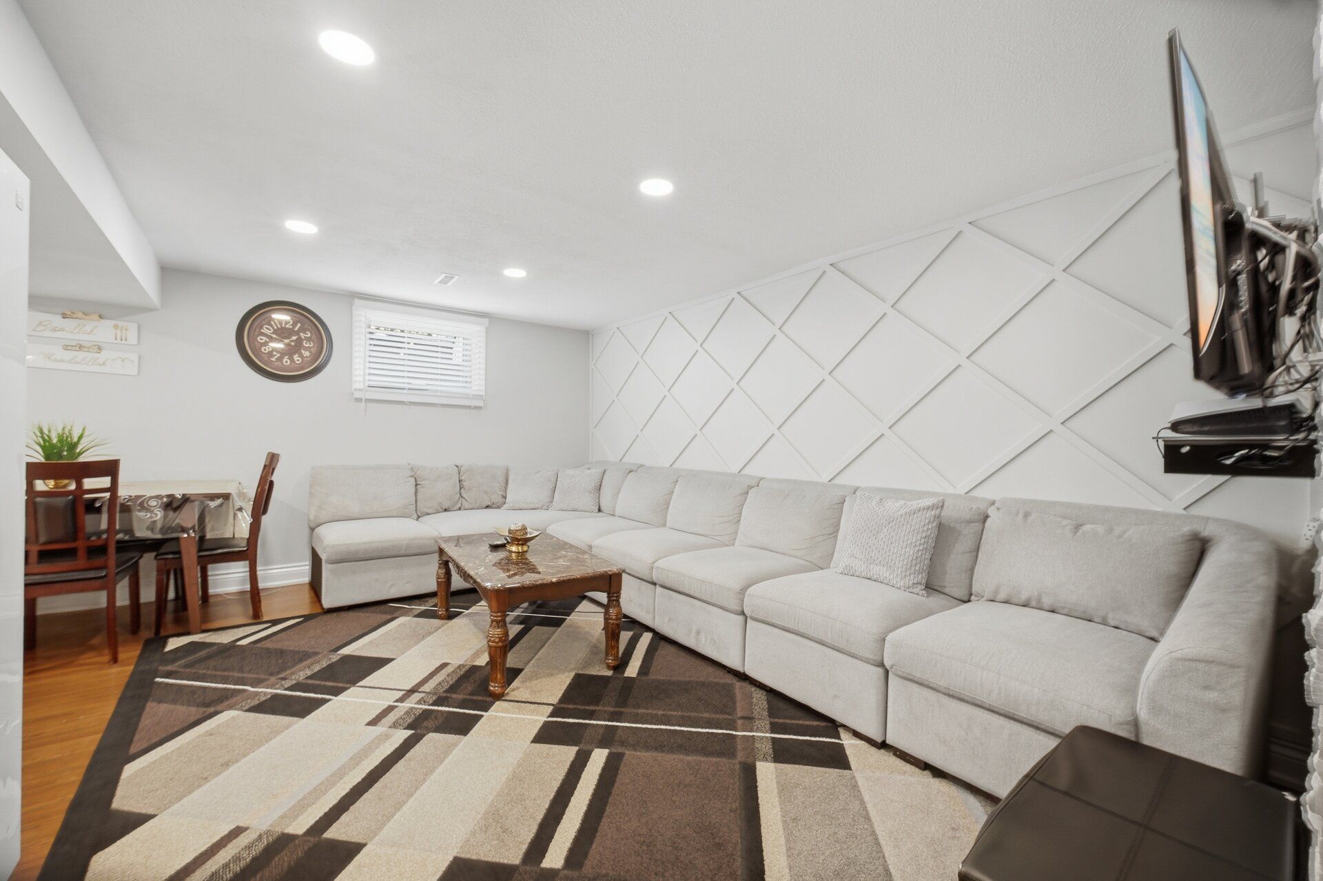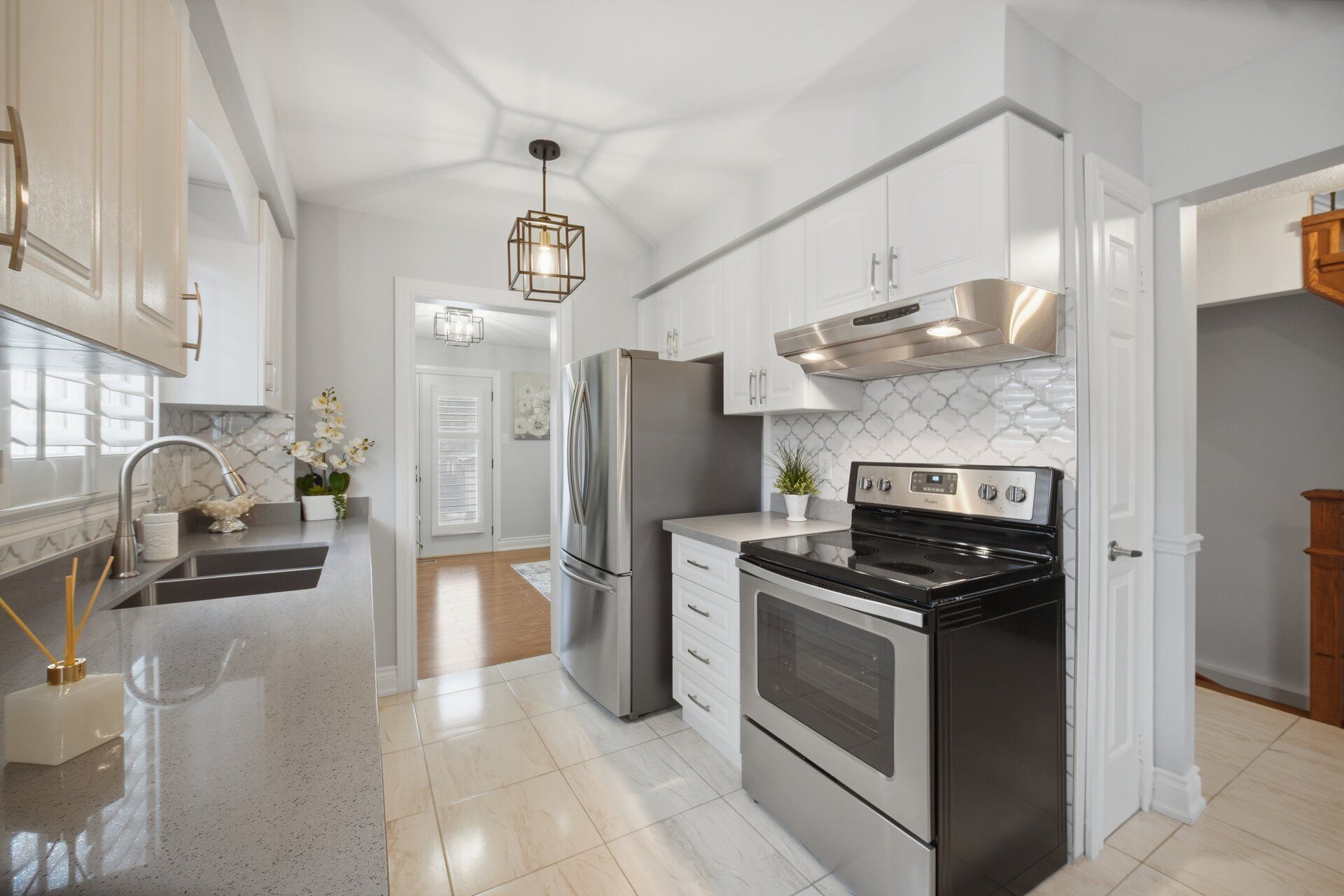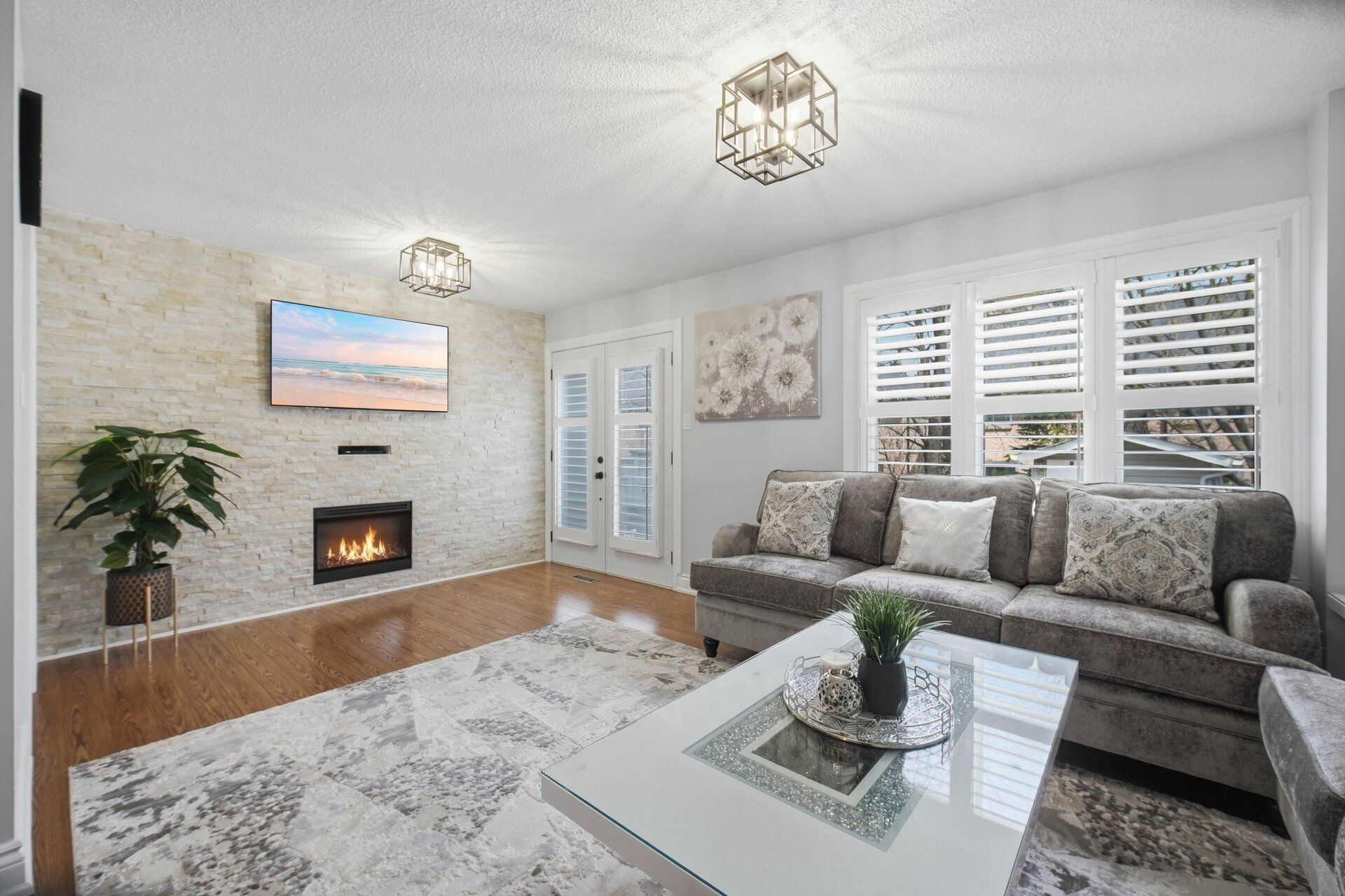 Located on a quiet, family-friendly street in central mississauga. This property features numerous high-end upgrades throughout, including newer ceramic flooring and high quality laminate flooring (completely carpet-free), upgraded stairs with wrought iron pickets from the basement all the way to the second floor, pot lights, wainscotting, and stone accent walls. The main level offers an open-concept floor plan that feels both spacious and modern. Highlights include a complete kitchen renovation with quartz counters, custom backsplash, and an undermount sink. The dining area features a bold accent wall with an electric fireplace with french doors leading out to a fully enclosed backyard with a large patio and garden. The upper level boasts three well-sized bedrooms and an updated bathroom. The lower level provides additional living space with a second modern kitchen featuring quartz counters, a tv area, and another full bathroom. Extra wide driveway and no sidewalk fits up to 4 cars. Ideally situated near highway 10 and eglinton, this home offers excellent highway access, a great school district, and close proximity to square one. This property truly must be seen to be appreciated. See features list for detailed list of upgrades.