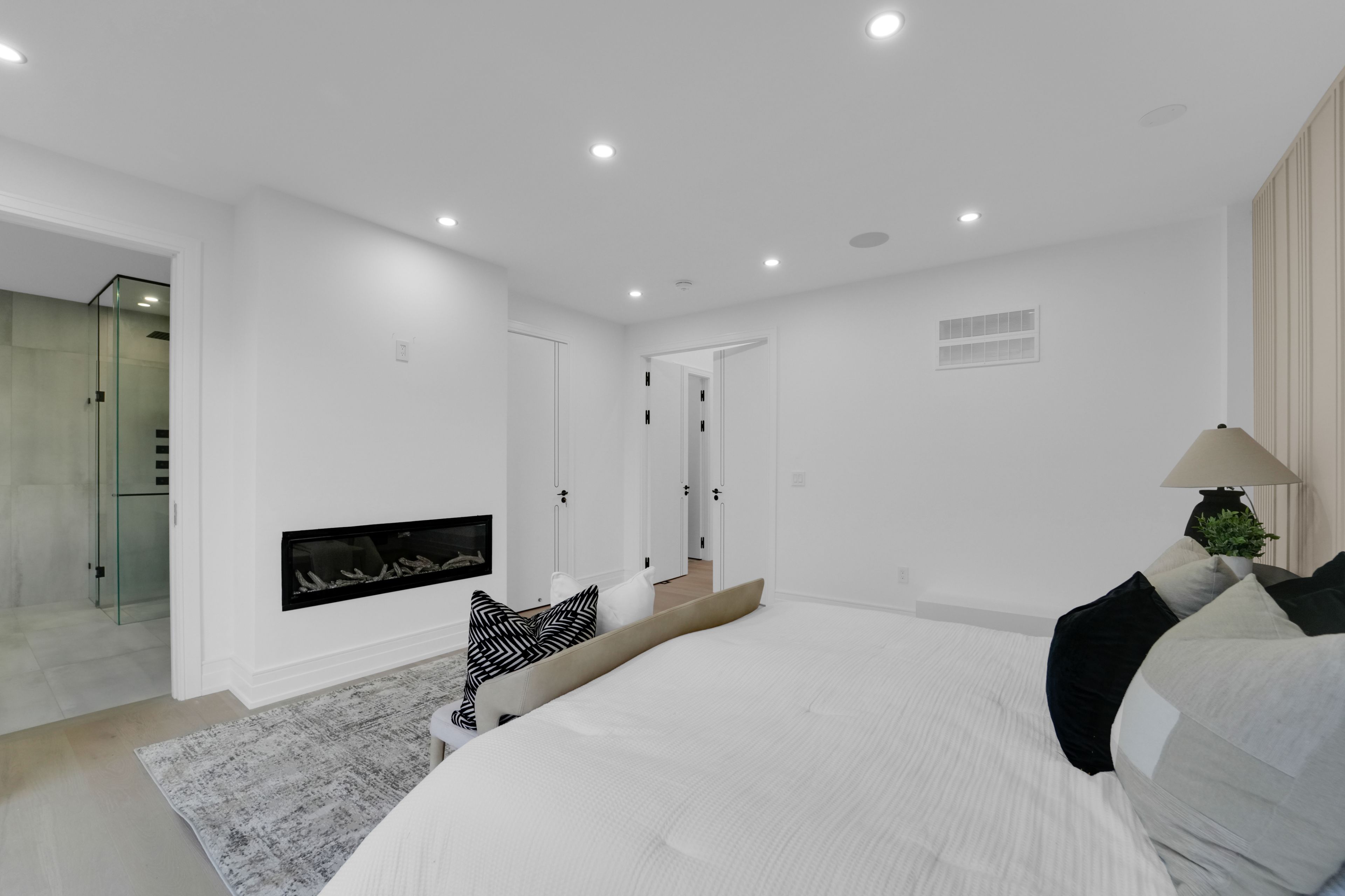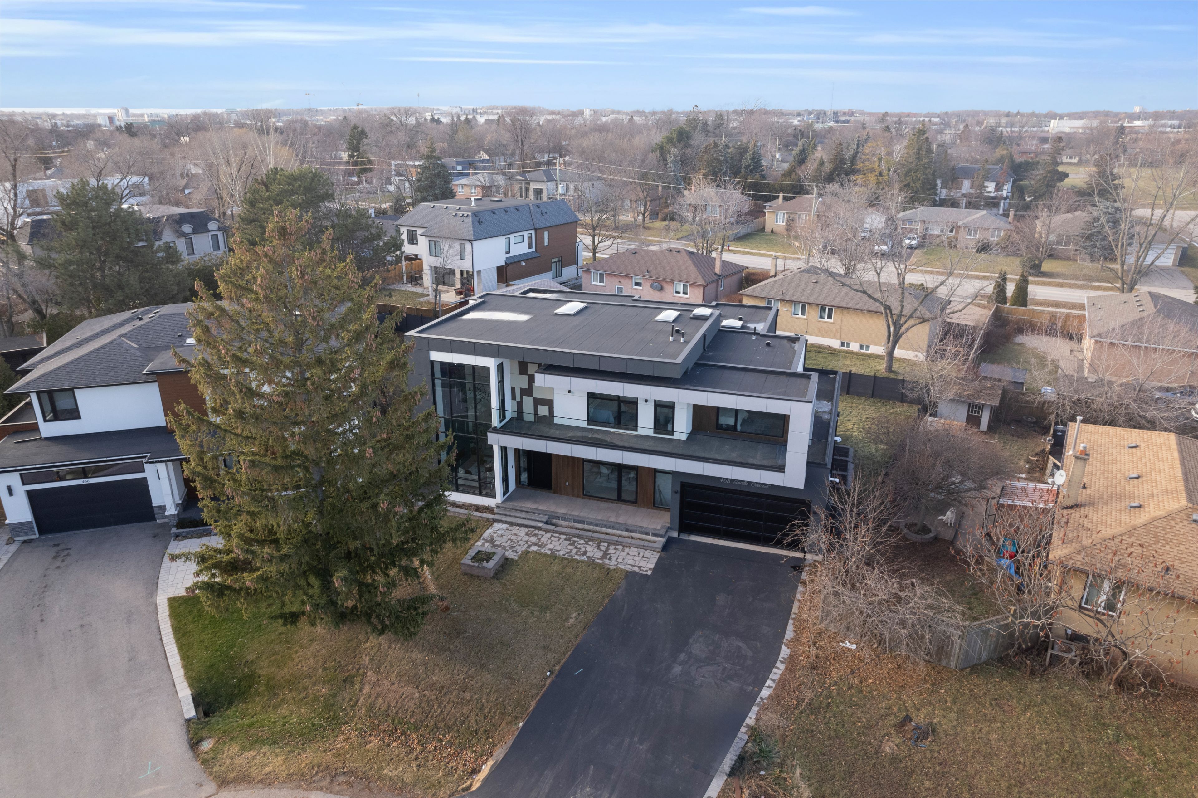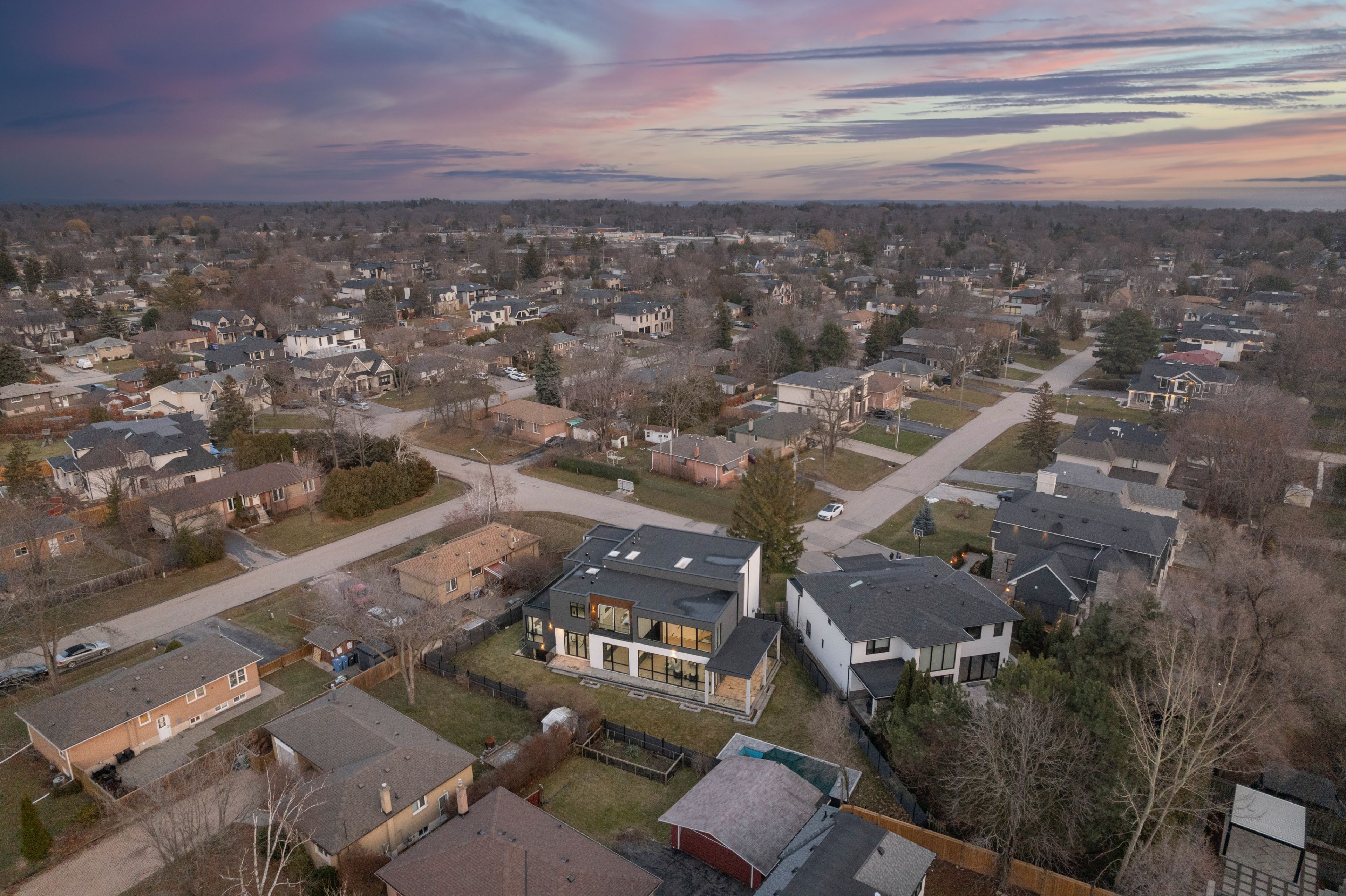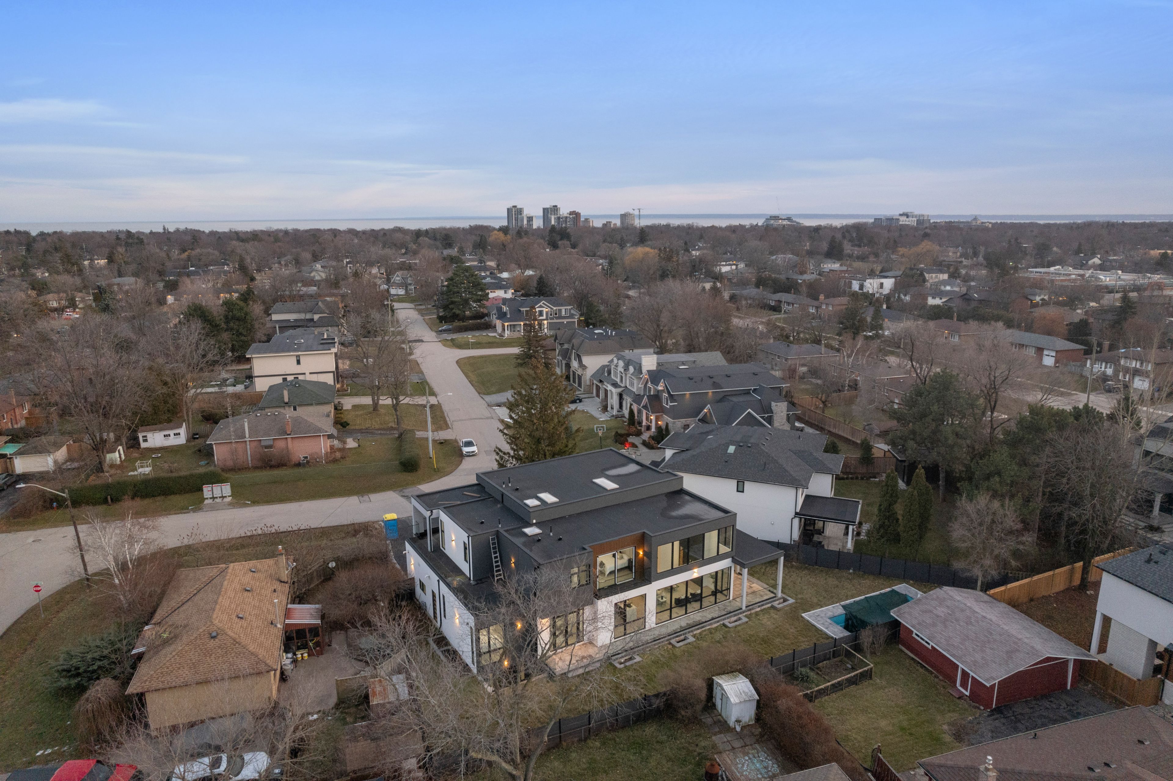 Architect-designed. Never lived in. Statement residence in bronte. Crafted by ni ni (b. C. I. N. #41885), this custom contemporary sits on a rare pie-shaped lot with exceptional rear width and privacy, minutes to lake ontario, bronte marina and waterfront trails. Not builder-grade-designed, permitted and executed to a cohesive architectural vision. The home offers 5 bedrooms, 6 bathrooms and a dedicated pet spa. A grand foyer opens to an open-concept living area anchored by a dramatic 23-ft floor-to-ceiling window wall. Premium aluminum gliding windows with german hardware, engineered white oak flooring and ambient pot lighting enhance the bright, airy feel. Chef-inspired kitchen with top-of-the-line dacor appliances, custom cabinetry, calacatta marble backsplash, pot filler and a waterfall island. Napoleon fireplaces in living and family rooms. Main floor guest suite with private ensuite; private office with separate backyard entrance. Cambridge hydraulic elevator to all levels. Upstairs: three bedrooms with spa-inspired ensuites, walk-in closets and 12 ft 3 in ceilings. Fully finished walkout lower level with radiant heated floors (ready), home theatre, recreation space, full kitchen/bar, guest suite, oversized cold storage and direct backyard access via premium aluminum doors. Exterior: fully fenced yard with aluminum perimeter and frameless glass railings; large inground pool with heating provisions; heated driveway permit approved. Systems and extras: control4 automation (3 ipads), whole-home audio, security system, central vacuum, 3 fireplaces, 4 skylights, bbq rough-in and parking for up to 8 vehicles. A rare, meticulously executed contemporary home offering luxury, functionality and proximity to bronte's waterfront lifestyle.