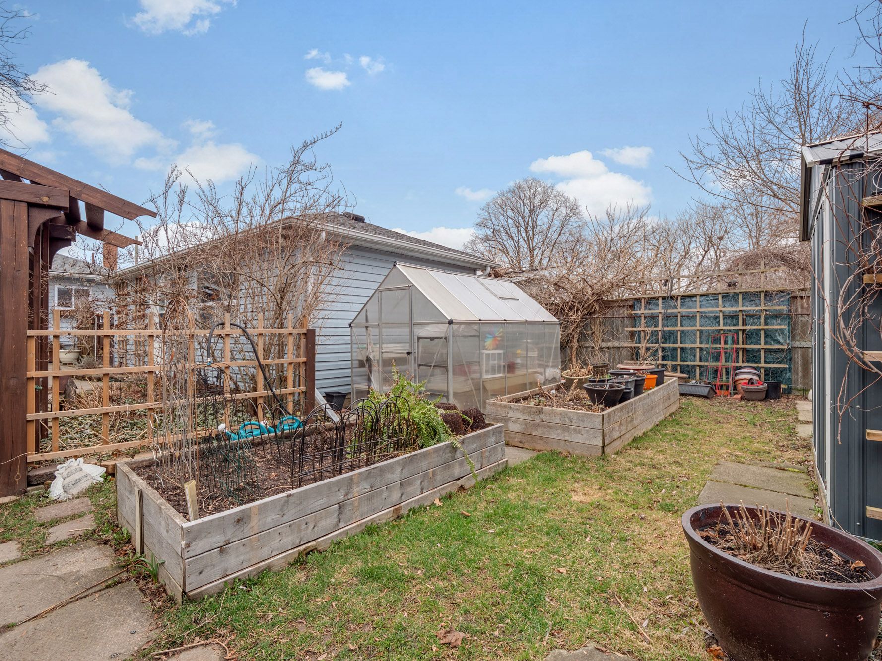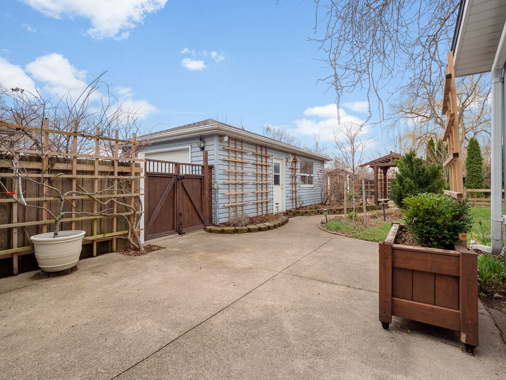 • Large detached garage suitable for a workshop, gym, or parking.
