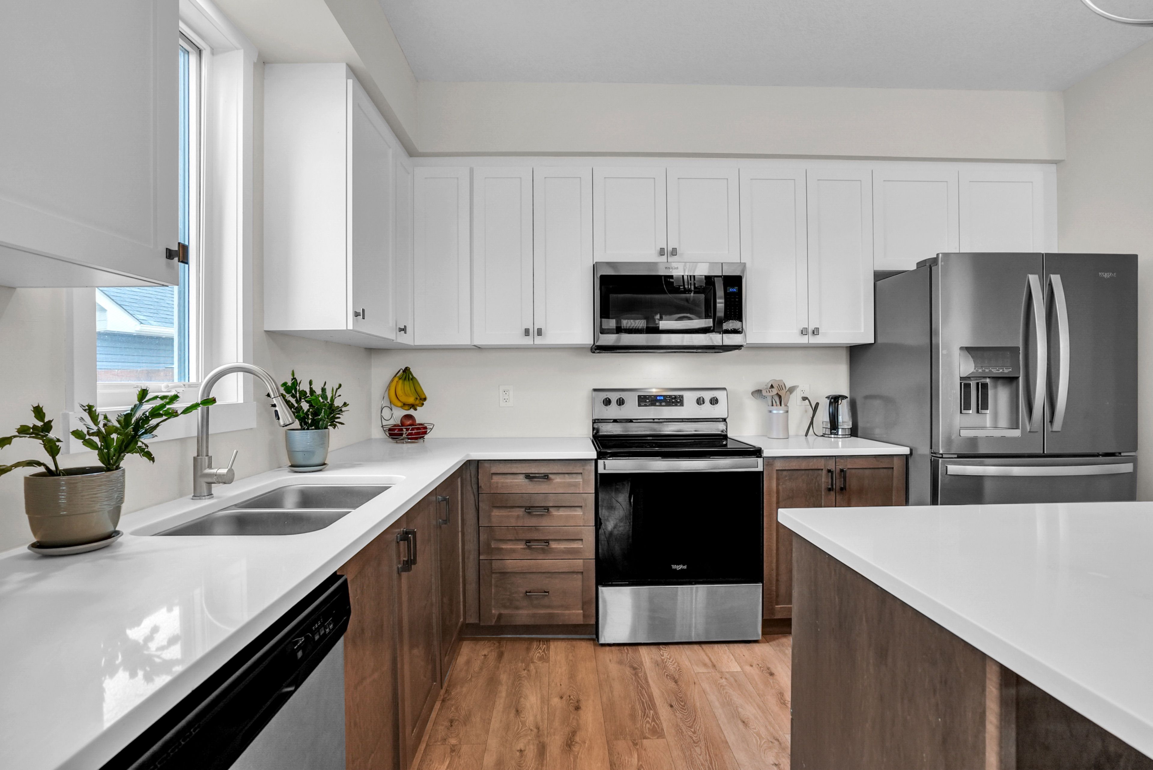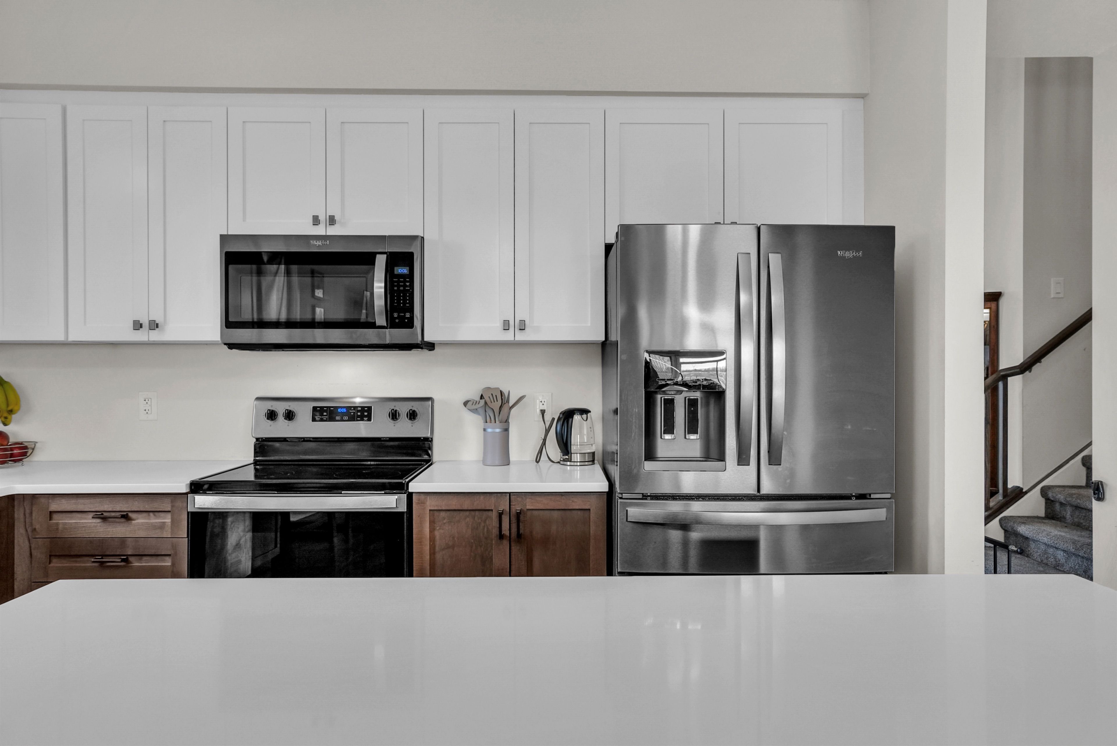 • Kitchen features quartz counters, stainless steel appliances, and a walk-in pantry.