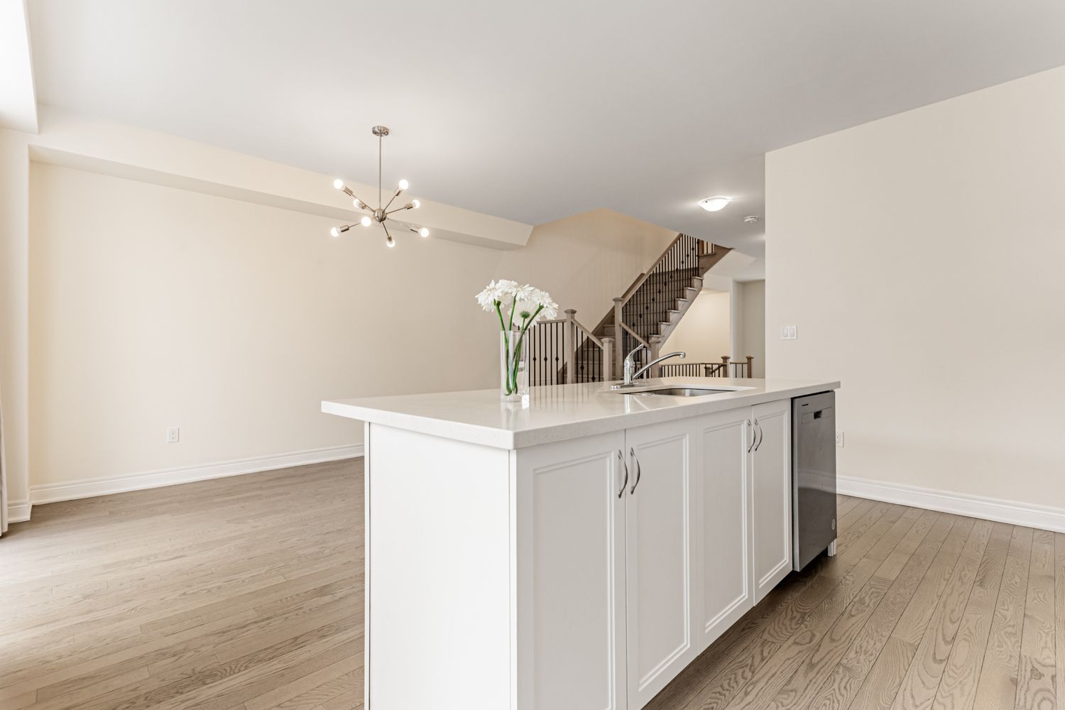 • Stylish kitchen with quartz counters and stainless steel appliances.