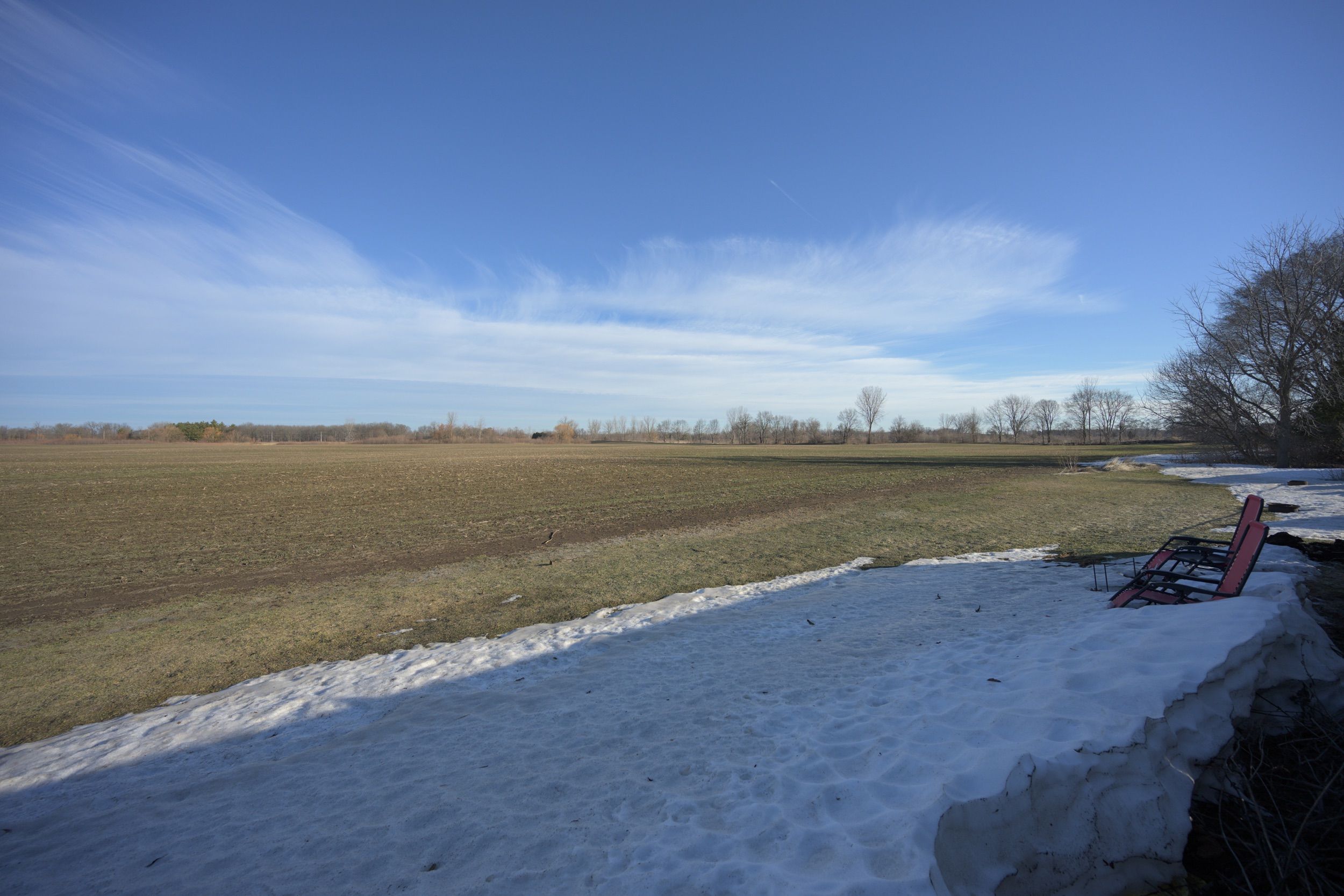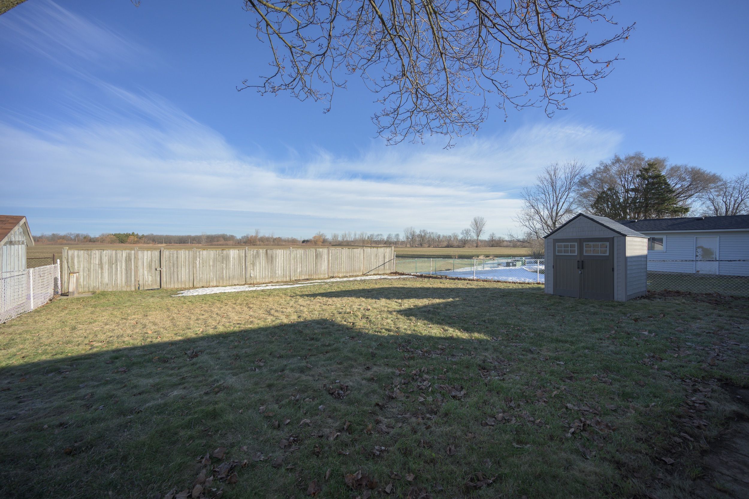 • Private backyard backing onto an open field, offering peaceful views.