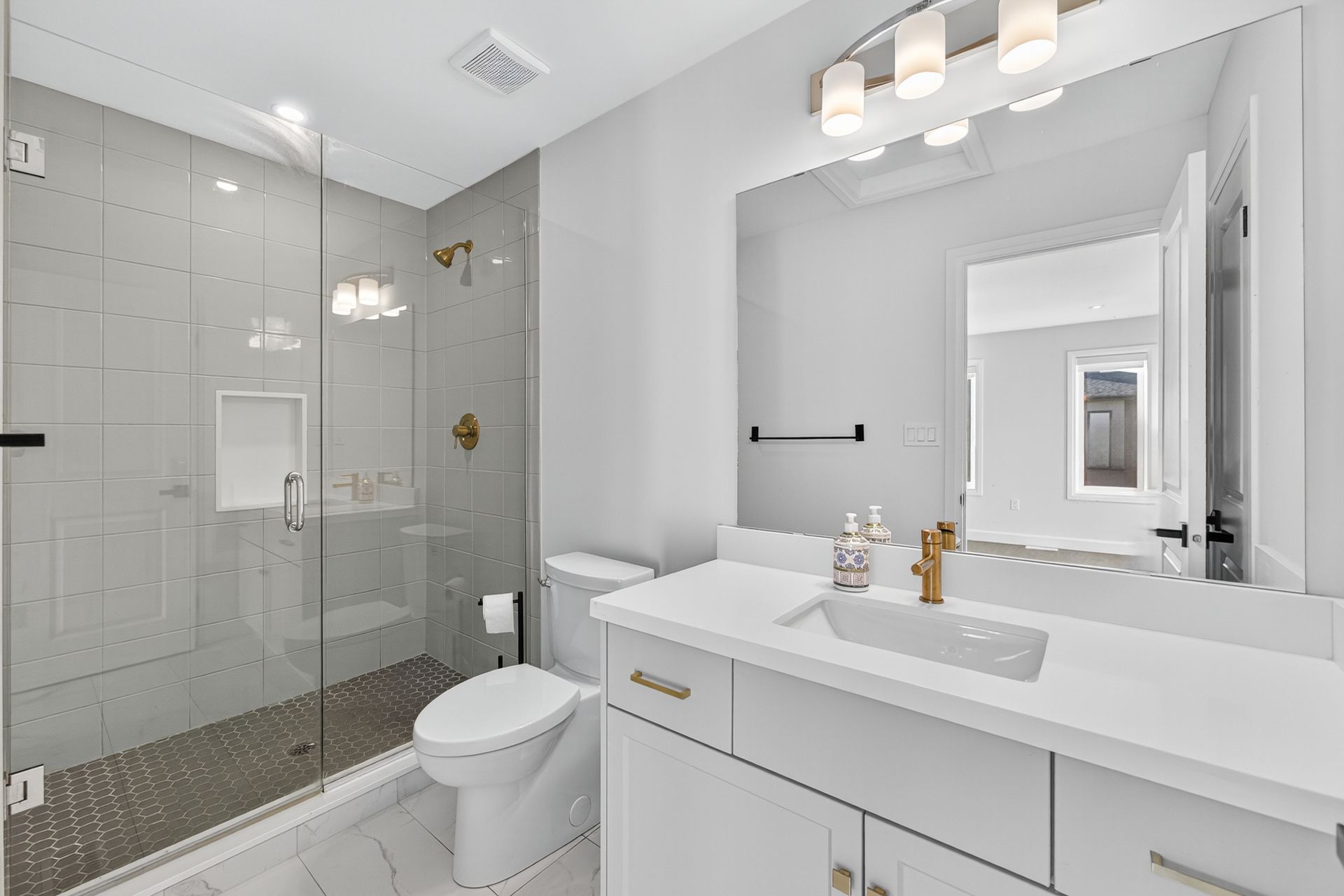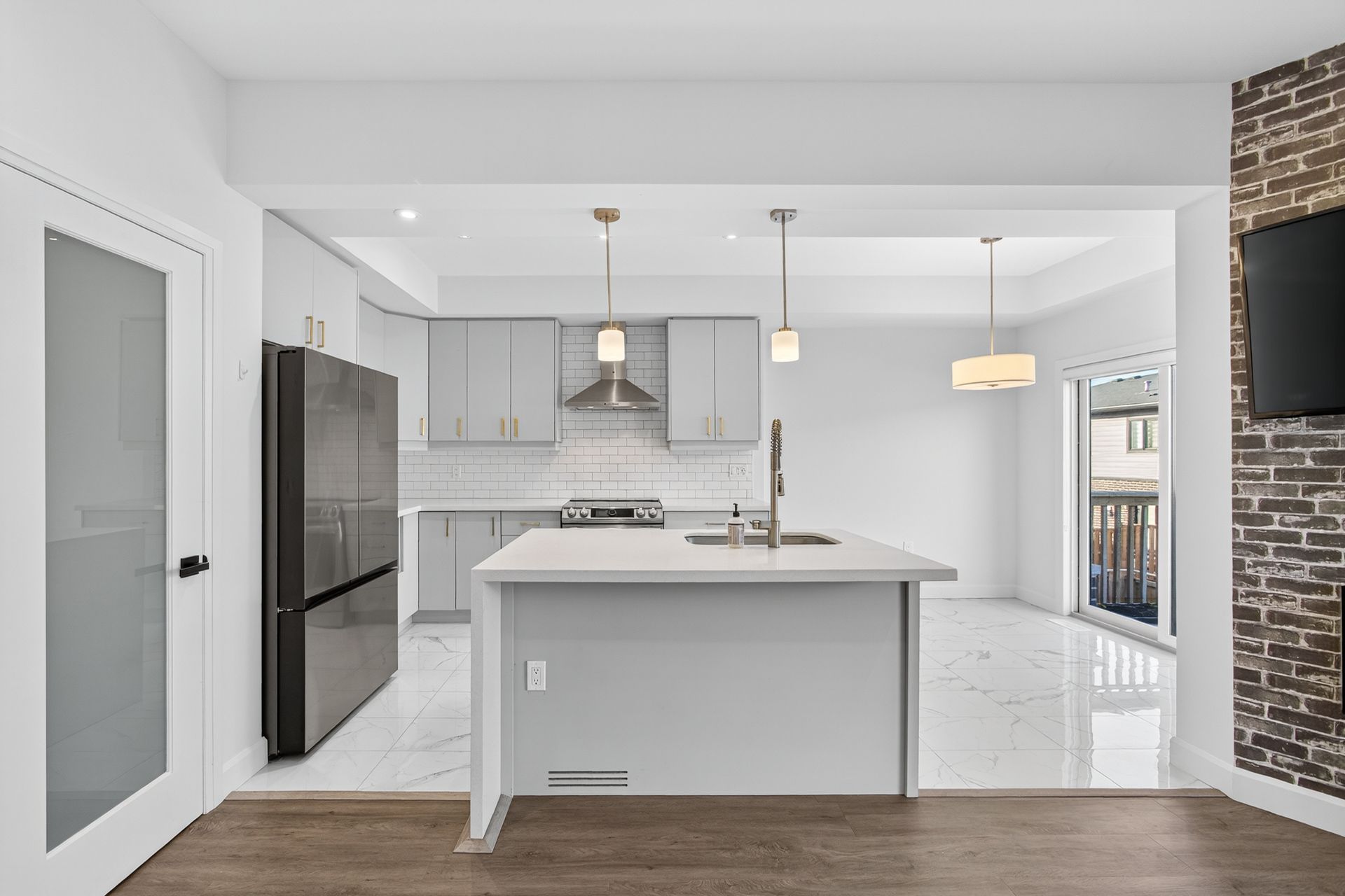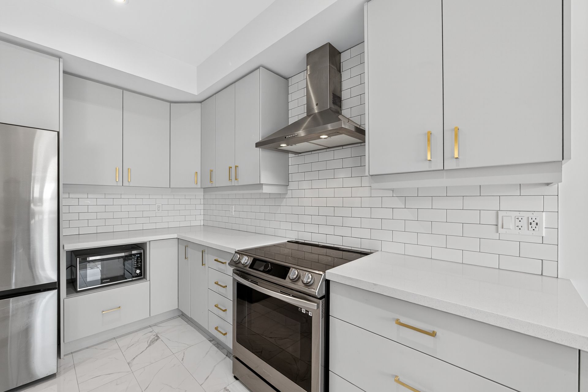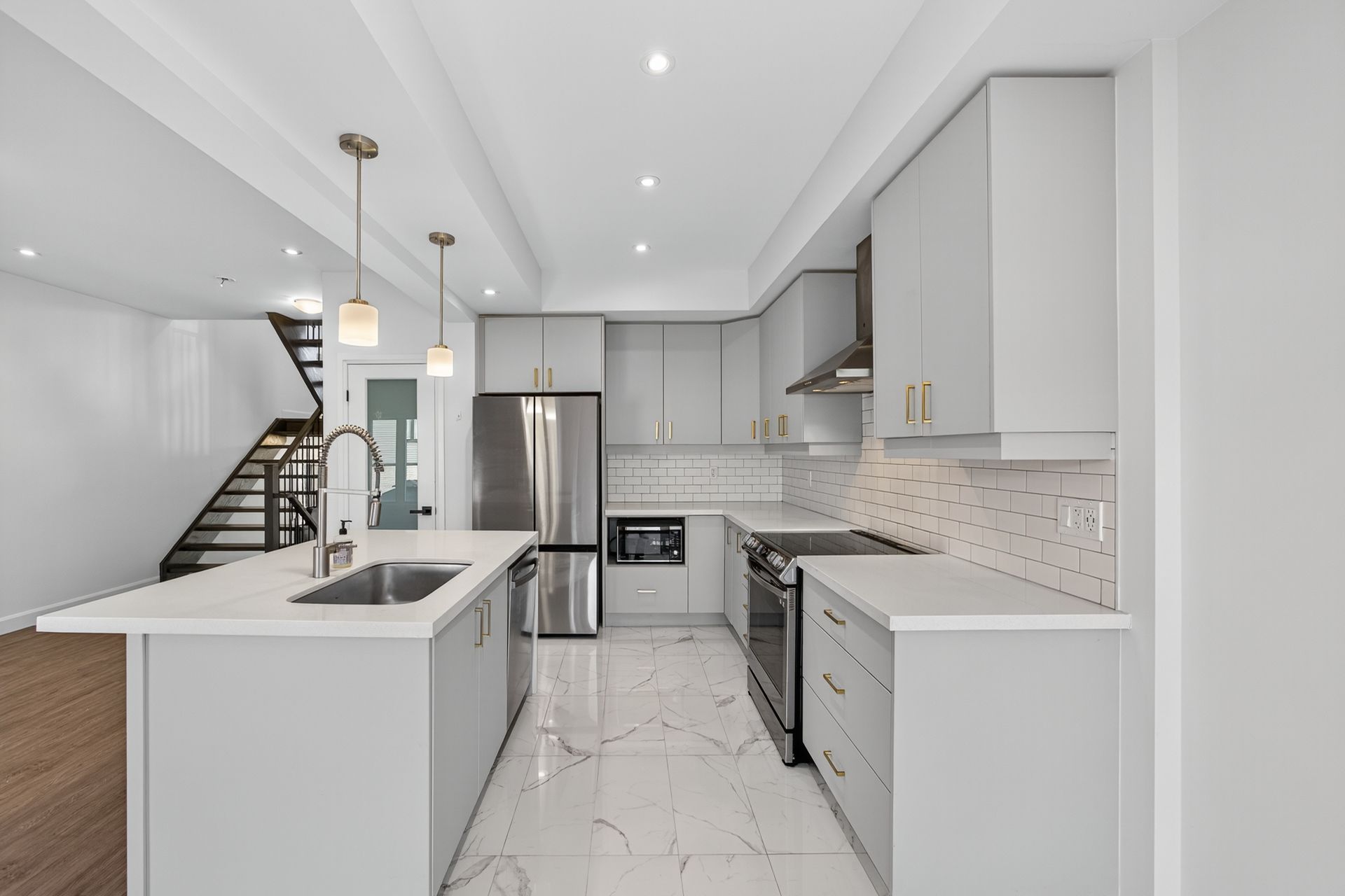 • Upgraded kitchen with quartz countertops and sleek appliances.