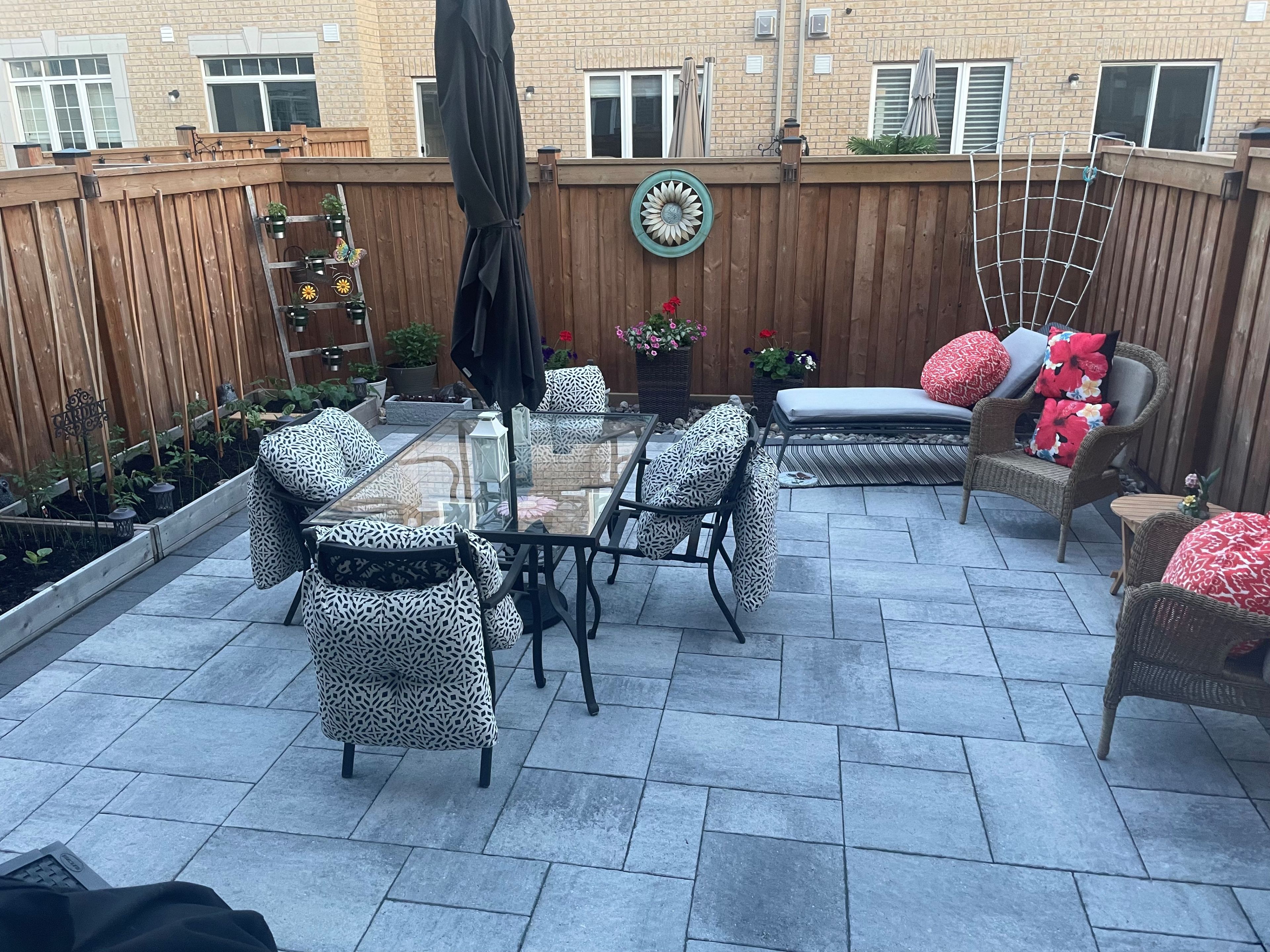 • Low-maintenance landscaped backyard with interlocking stone for outdoor enjoyment.