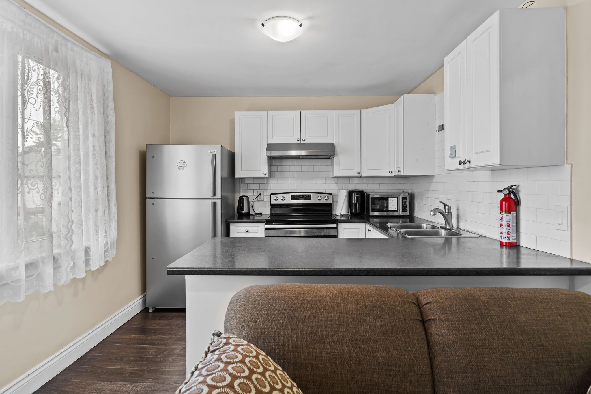 • Open living area with a full kitchenette and modern appliances.