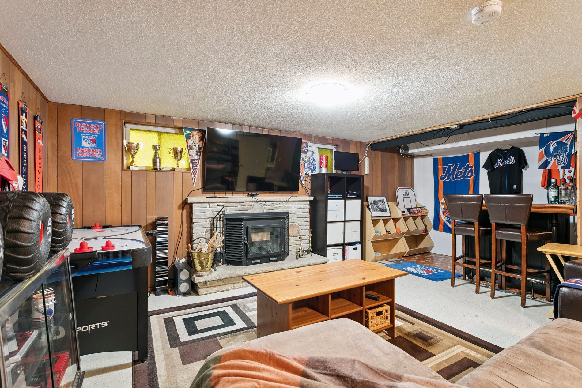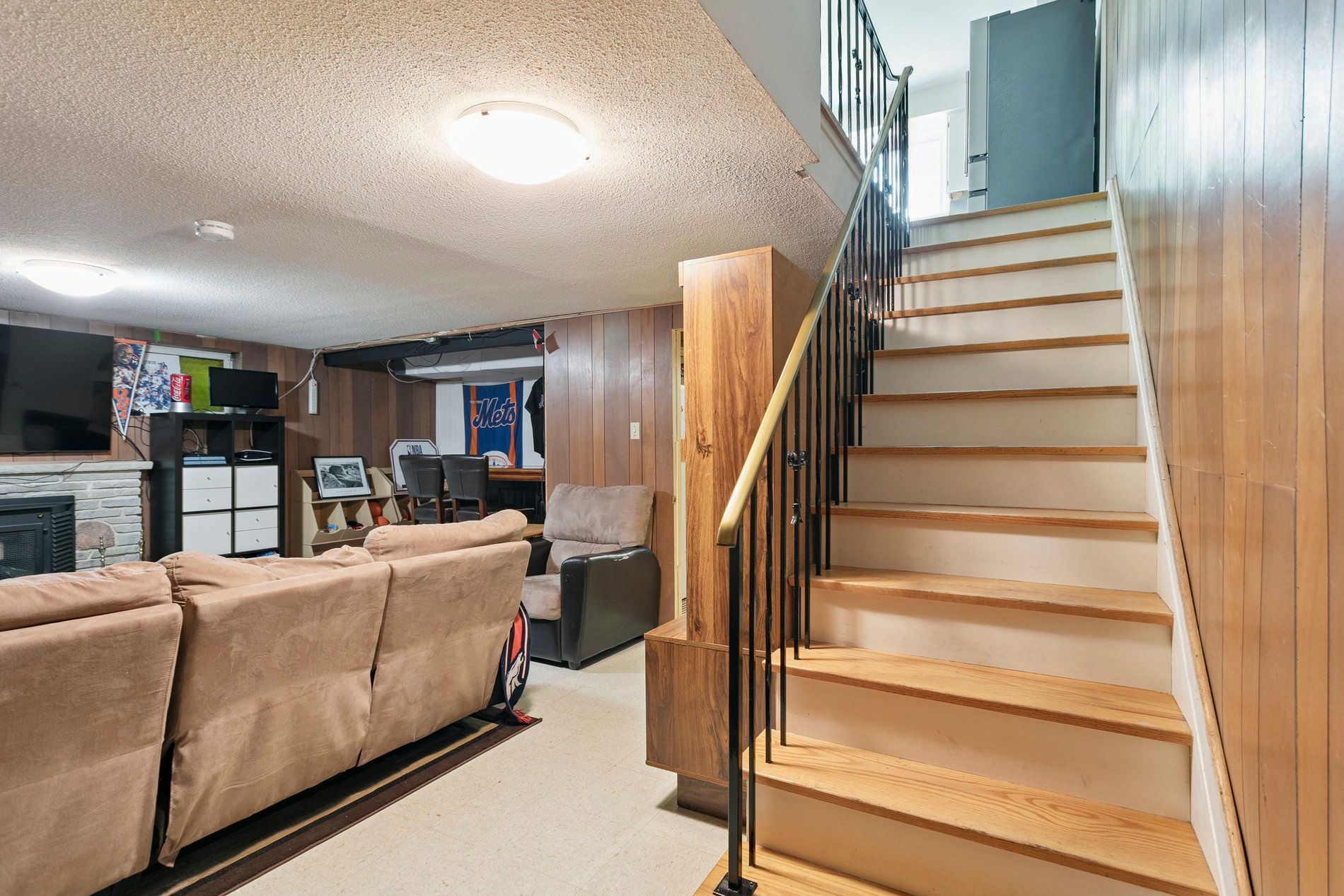 • Large finished basement featuring a fireplace and built-in storage.