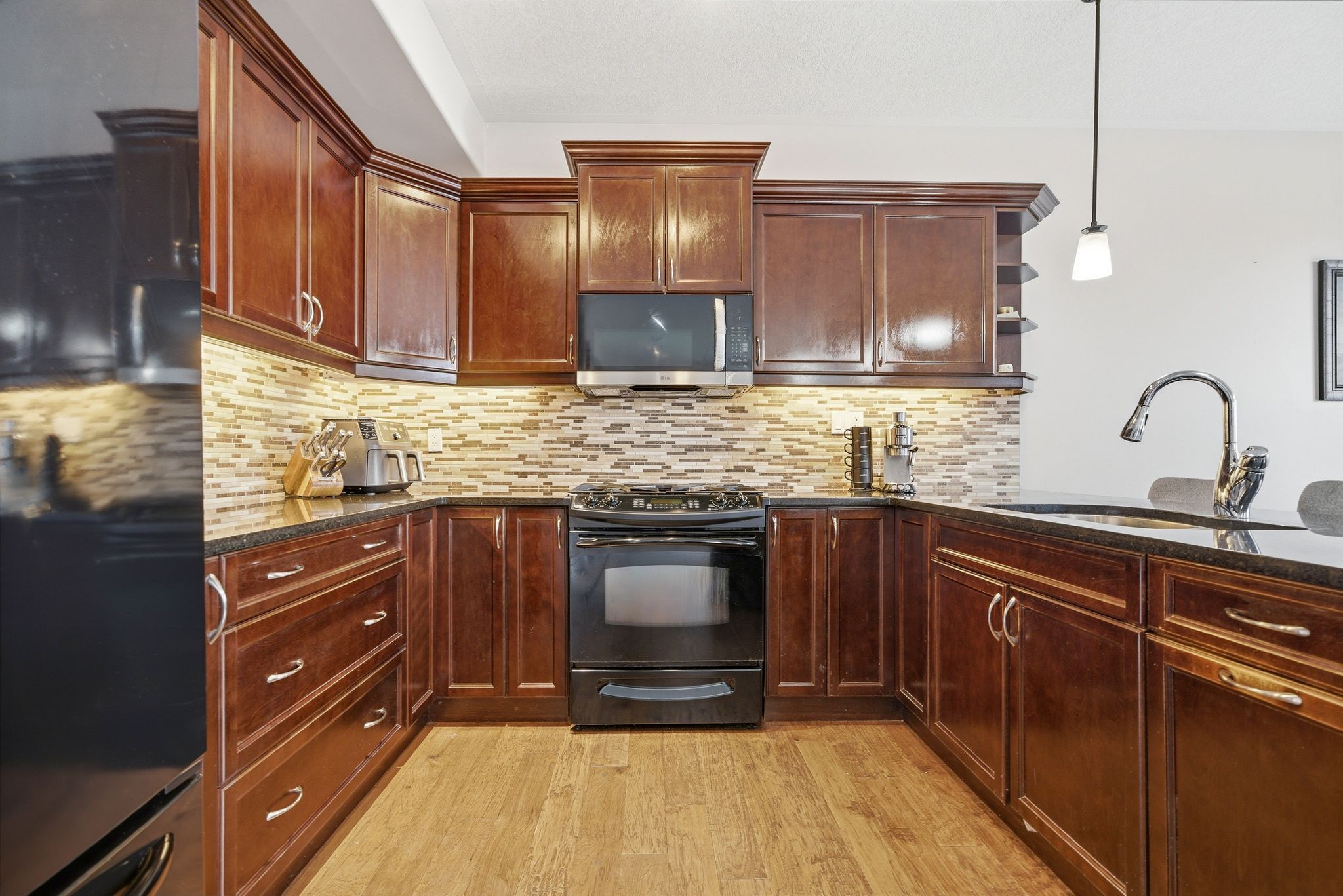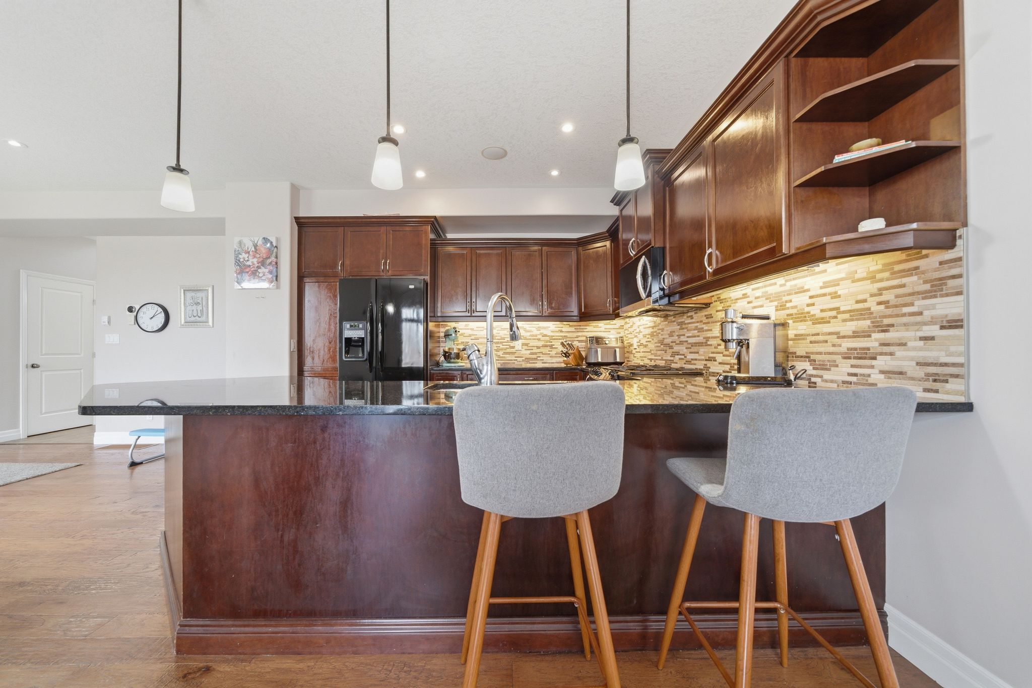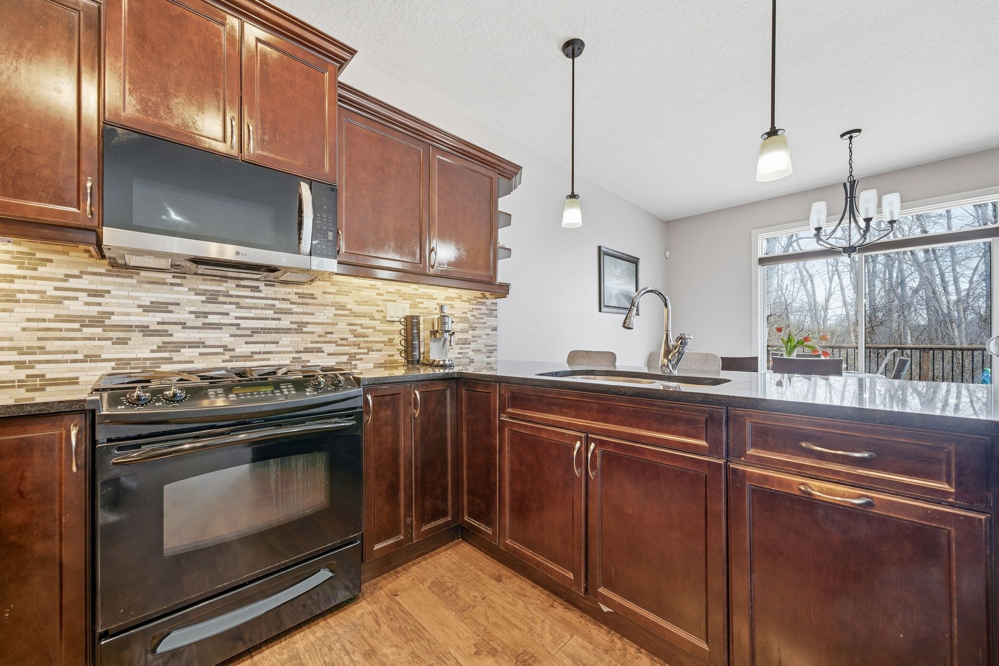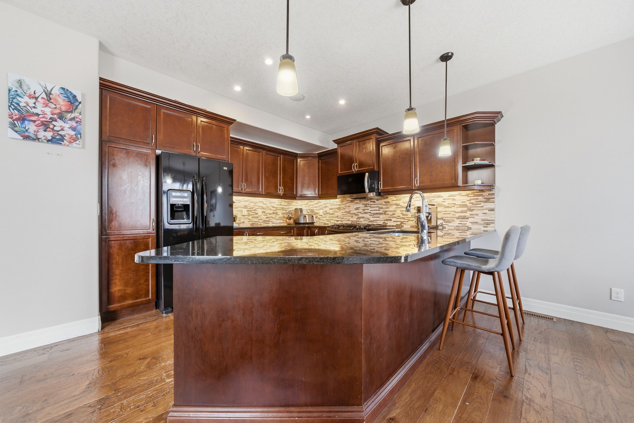 • Kitchen features rich cabinetry and a large peninsula for gatherings and meals.