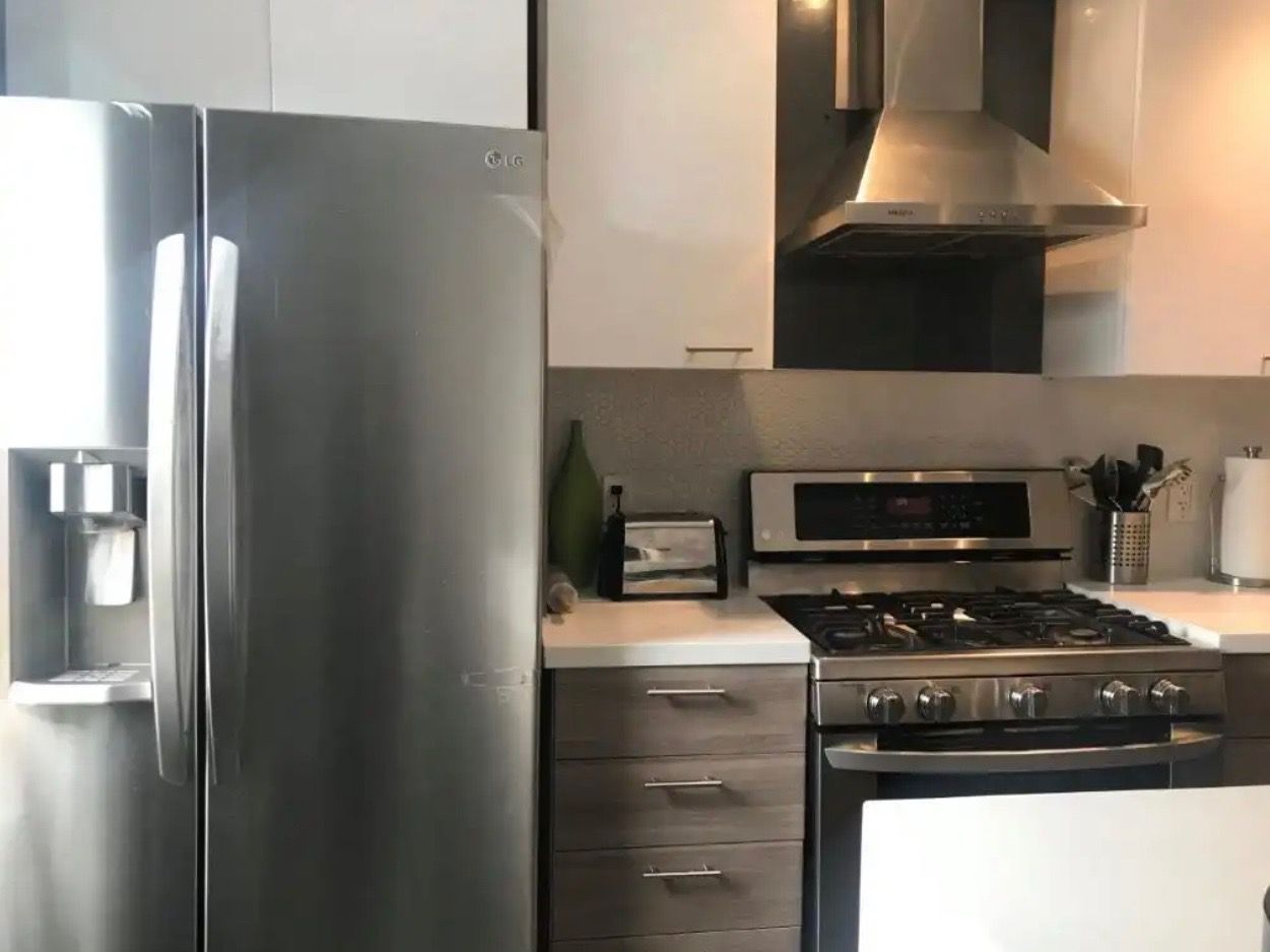• Stylish kitchen featuring stainless steel appliances and hardwood floors.