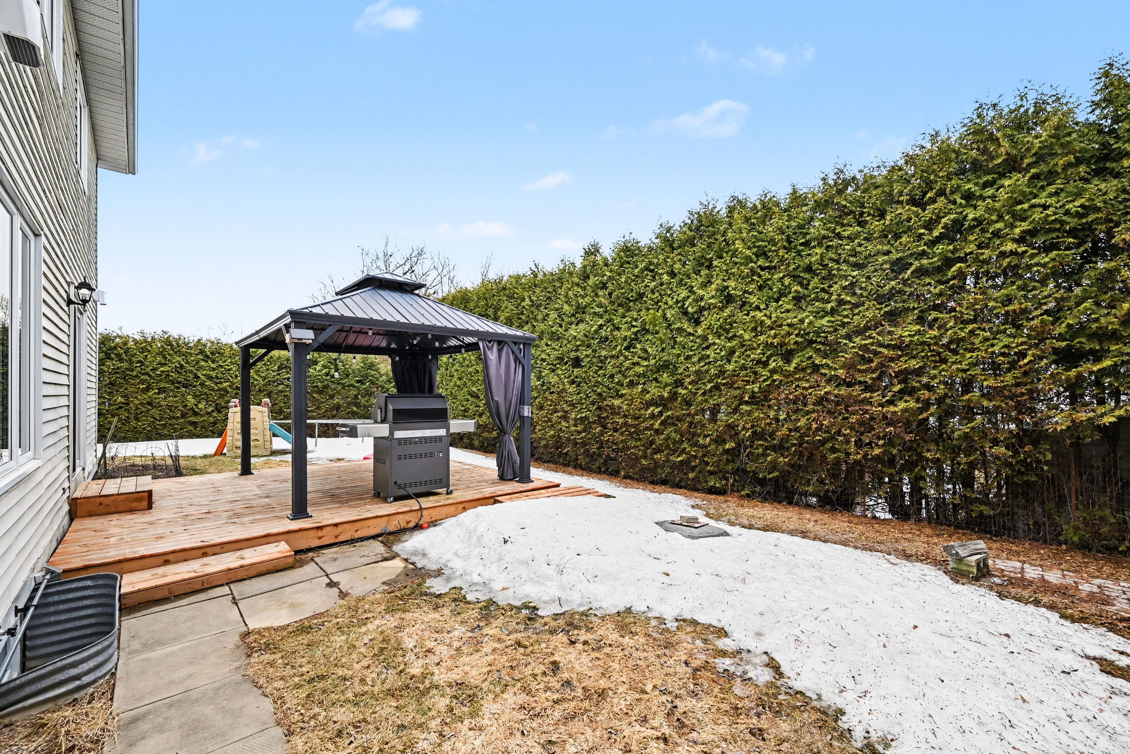 • Fenced backyard with deck and gazebo for outdoor relaxation.