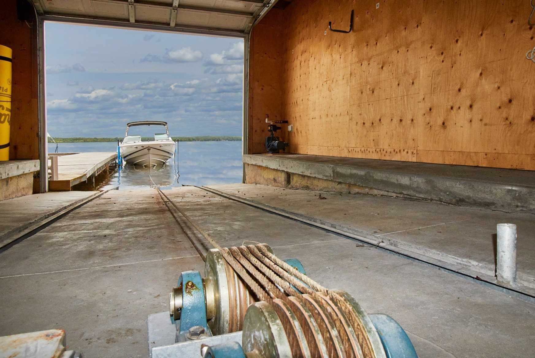 • Custom heated garage and boathouse provide ample space for storage and lake access.