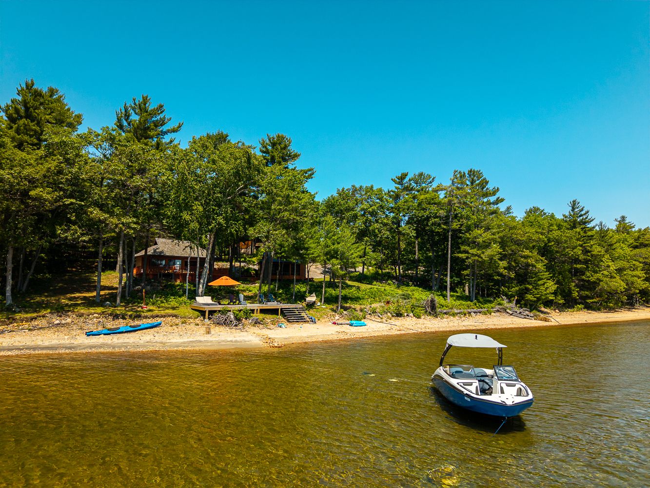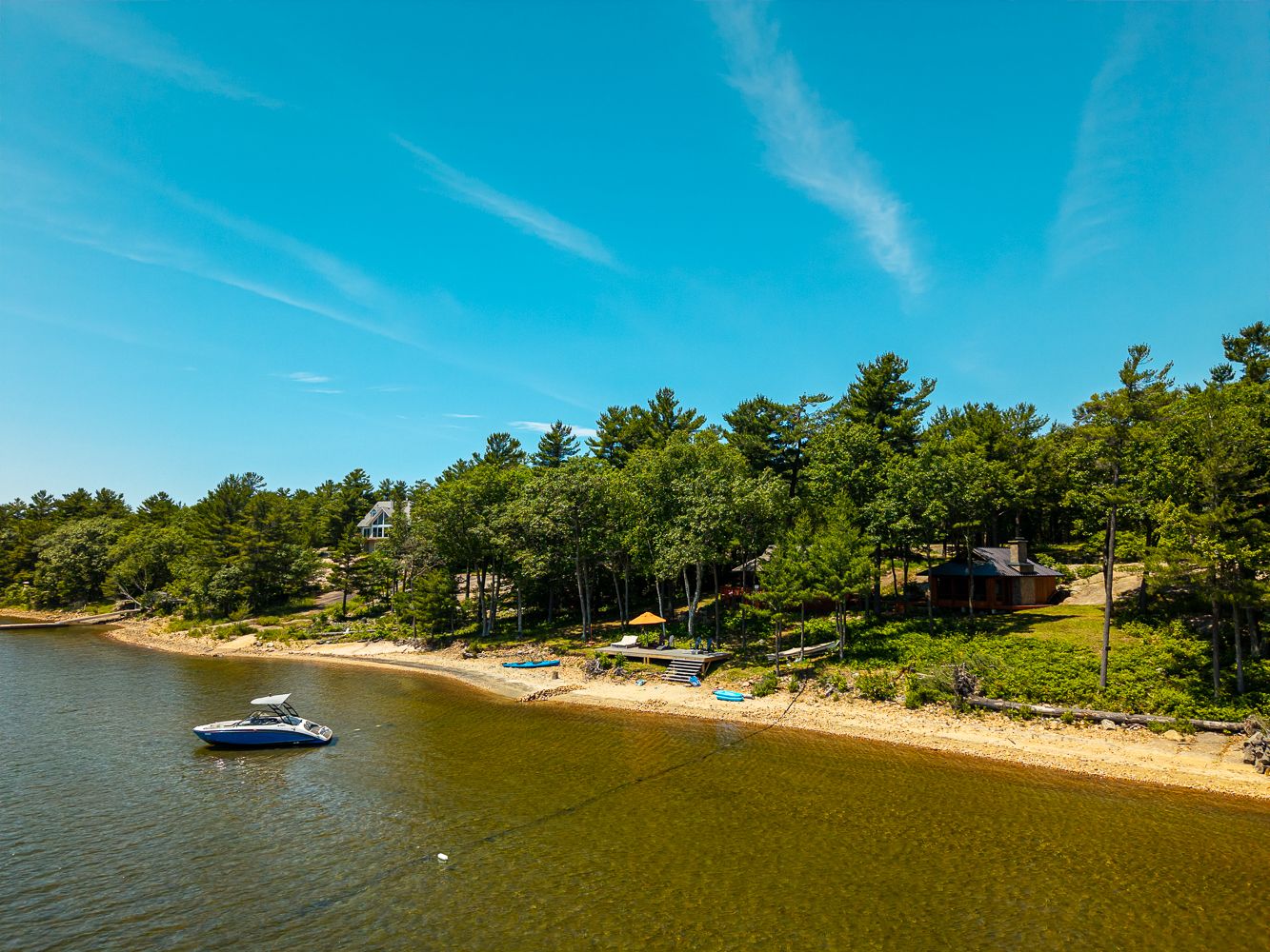 • 196 feet of south-facing shoreline with a natural sand beach.