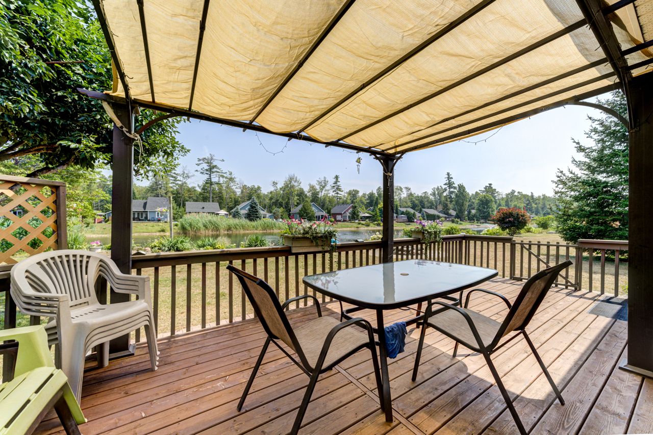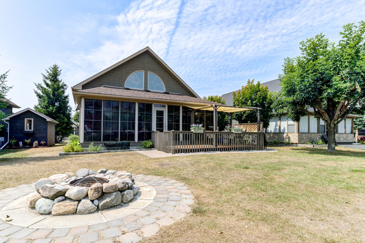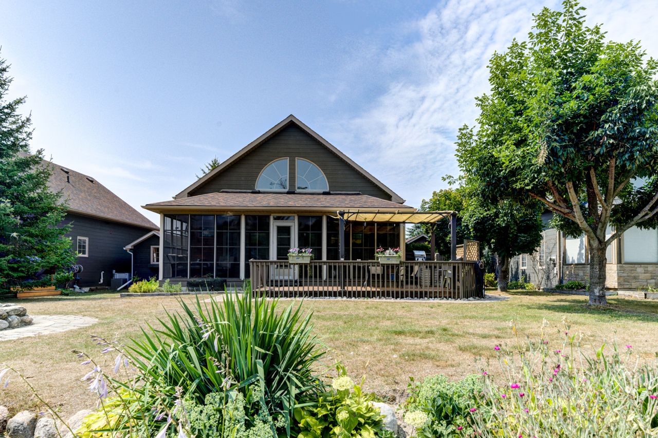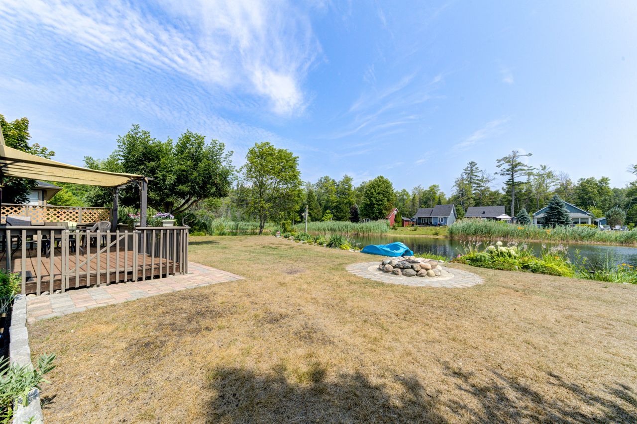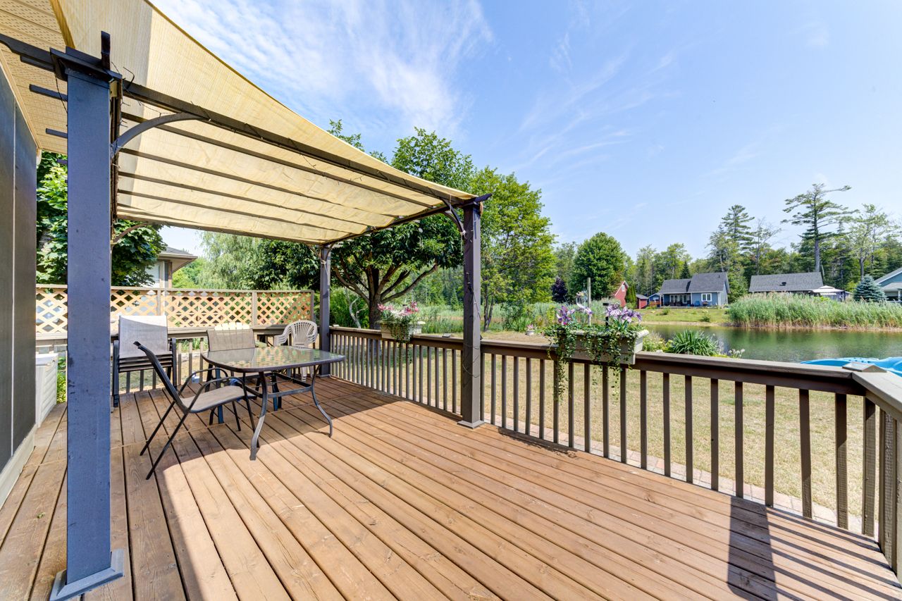 Quite possibly one of the finest 'muskoka' models you'll find in the sought-after, gated family community of wasaga countrylife. This beautifully updated 1. 5-storey, four-season wood chalet offers 1,635 sq/ft, including bonus sunroom with 278 sq/ft of luxurious living space backing onto scenic lake wasaga, providing peaceful water views. Located just a short walk to the shores of georgian bay, this 3-bedroom, 2-bathroom retreat features vaulted tongue-and-groove pine ceilings and an open-concept kitchen, dining, and living area anchored by a cozy gas fireplace. Enjoy the spacious 10' x 27' sunroom and adjoining sun deck both perfect for relaxing or entertaining while overlooking the pond. Tastefully updated since its original 2006 build, this home includes newer appliances (including an induction stove with double oven), wood laminate flooring, central air, a paved driveway, and extensive landscaping. As part of the resort community, residents have access to a wide range of amenities including indoor and outdoor pools, a splash pad, pickleball and tennis courts, a sandy beach area, and play grounds all nestled in a beautifully treed, secure setting.