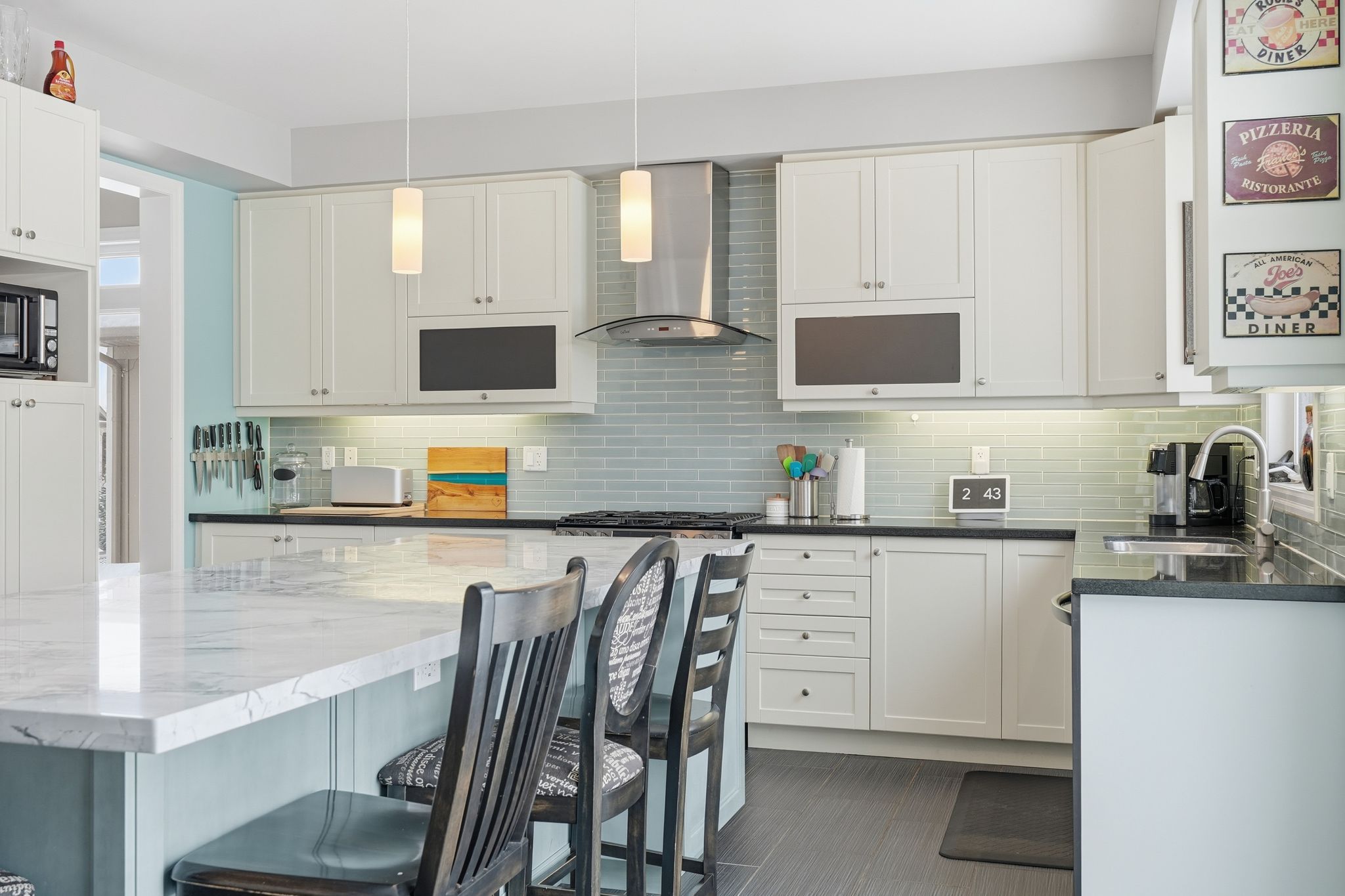 • Backyard oasis includes a heated saltwater pool and outdoor kitchen.