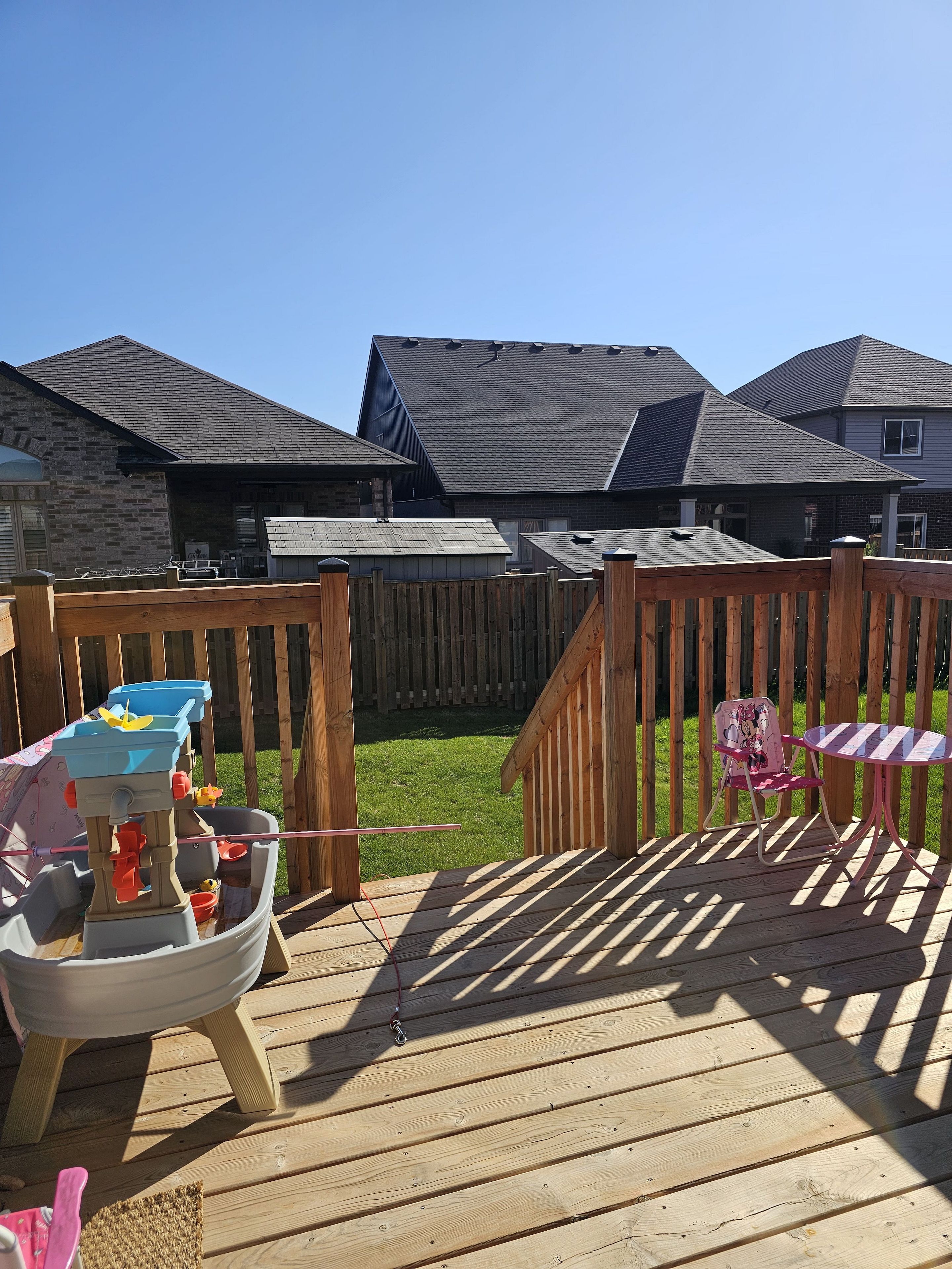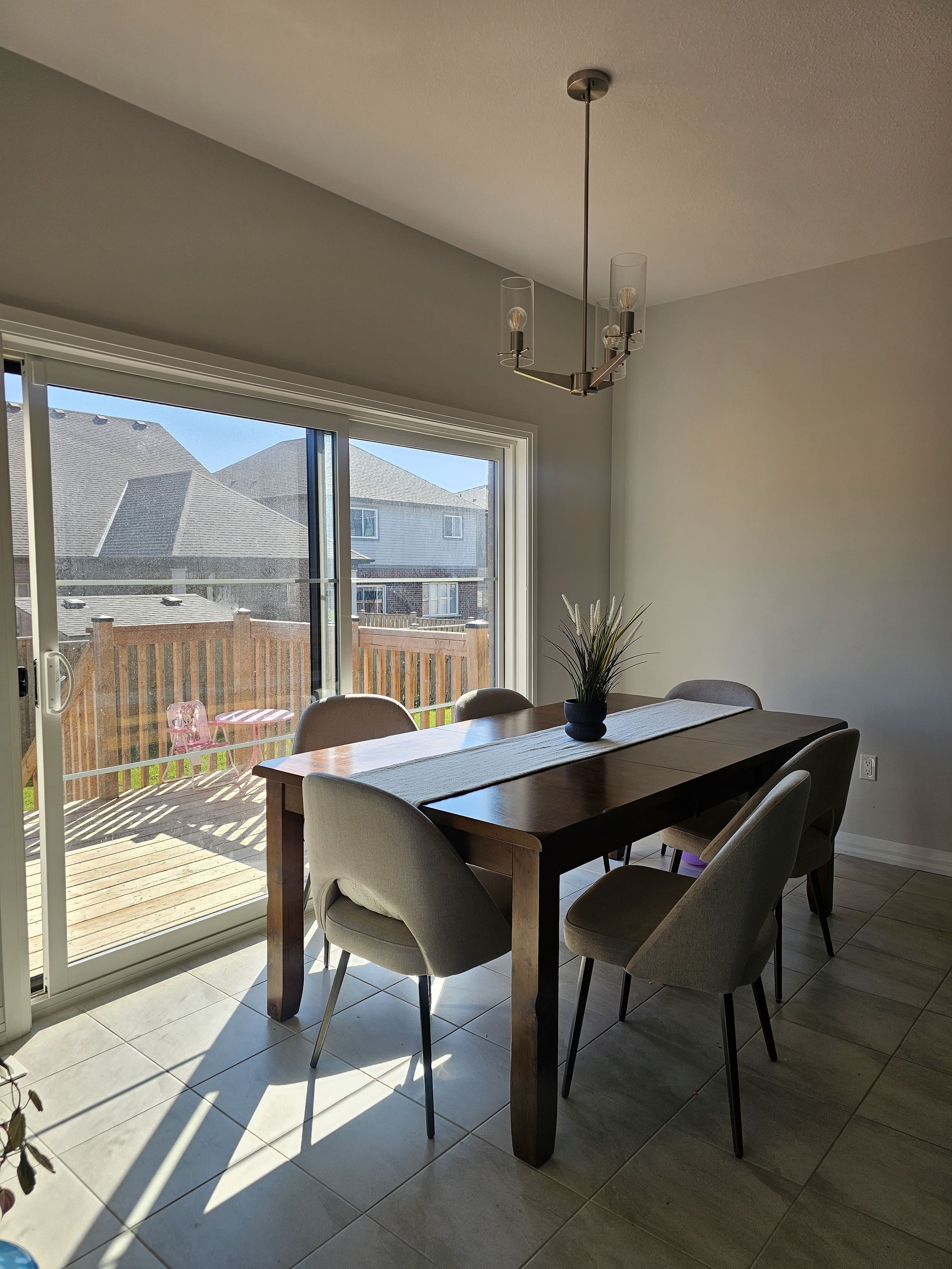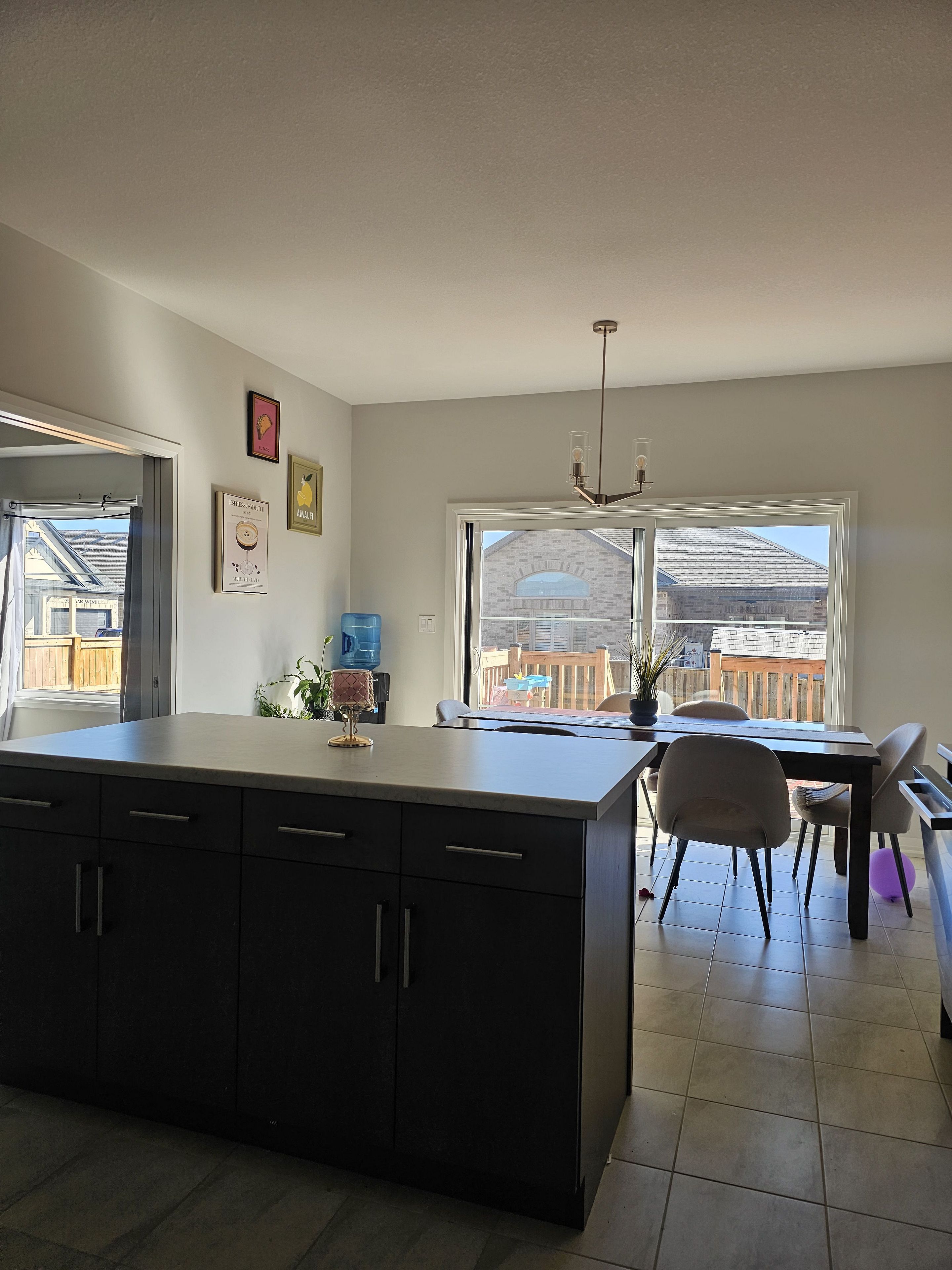 • Large kitchen island and sliding door leading to the deck.