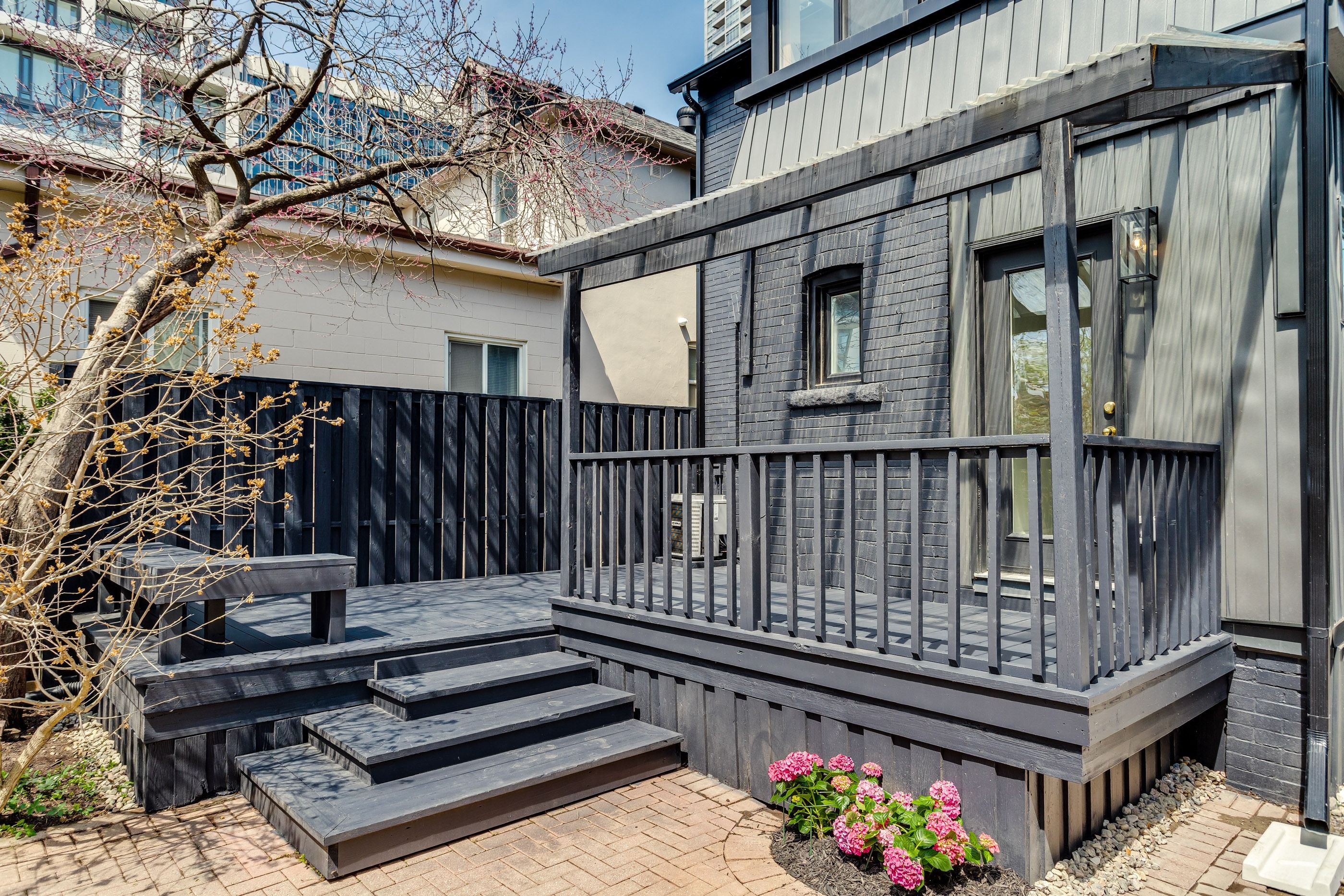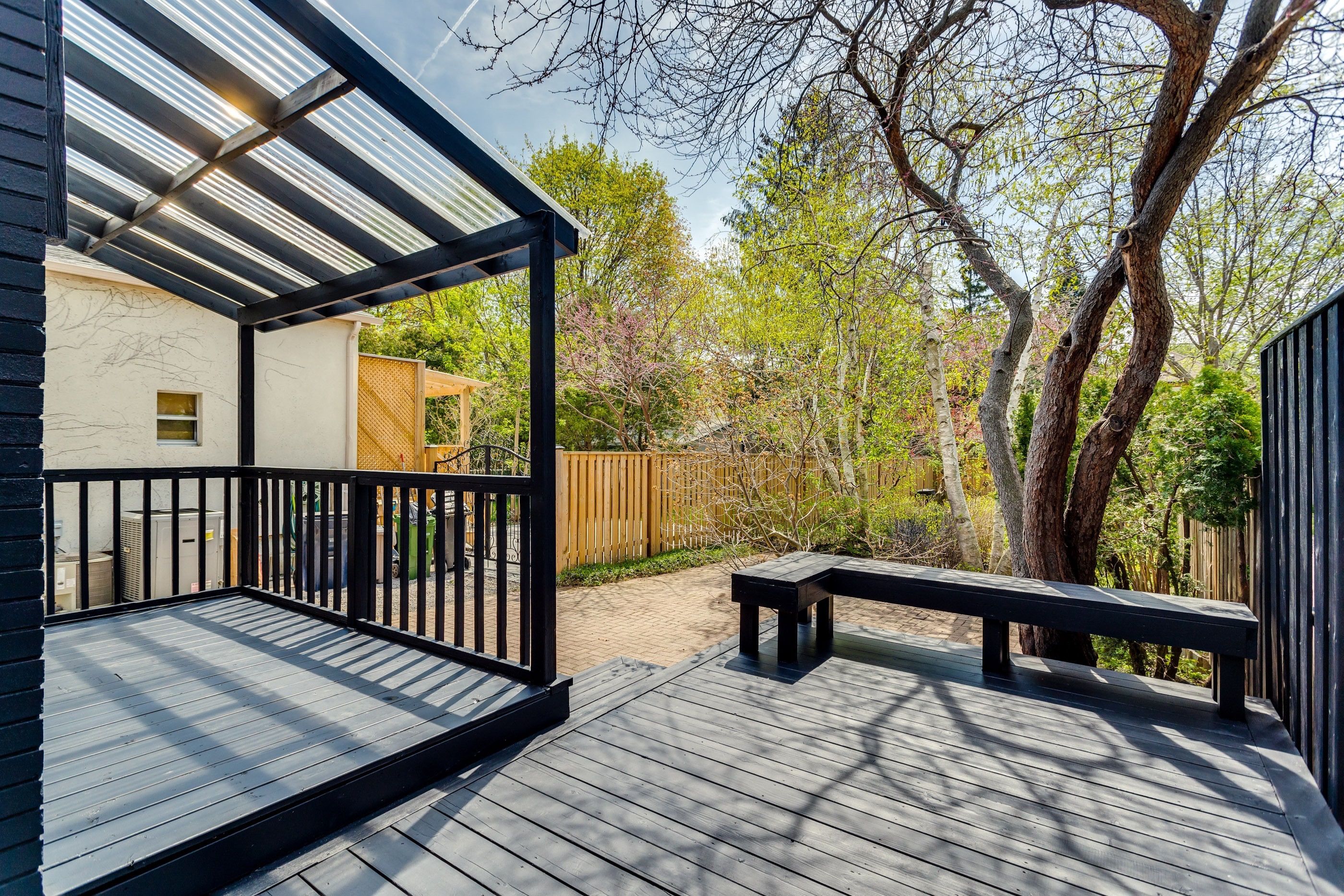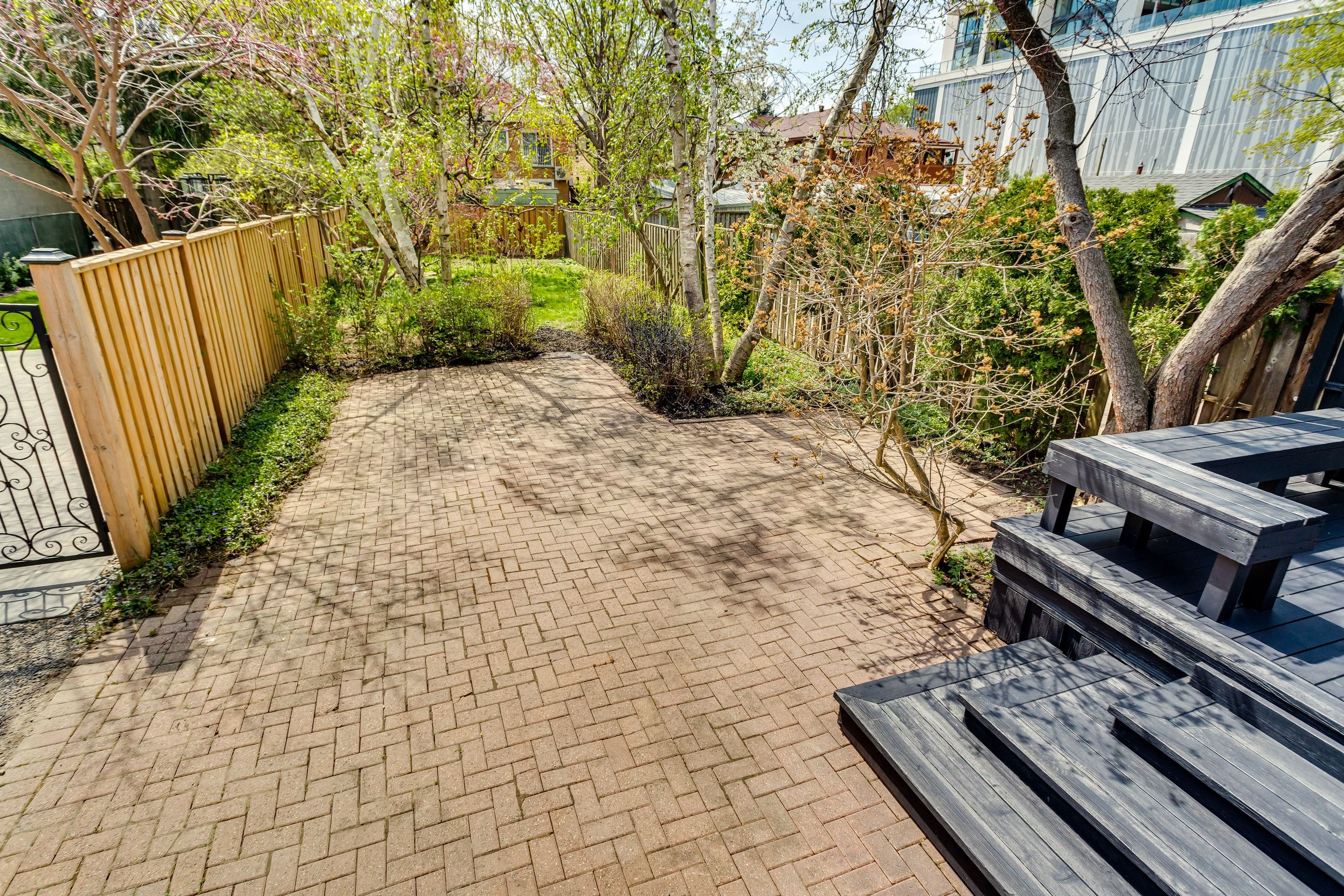 • Spacious backyard with mature gardens and a large deck.