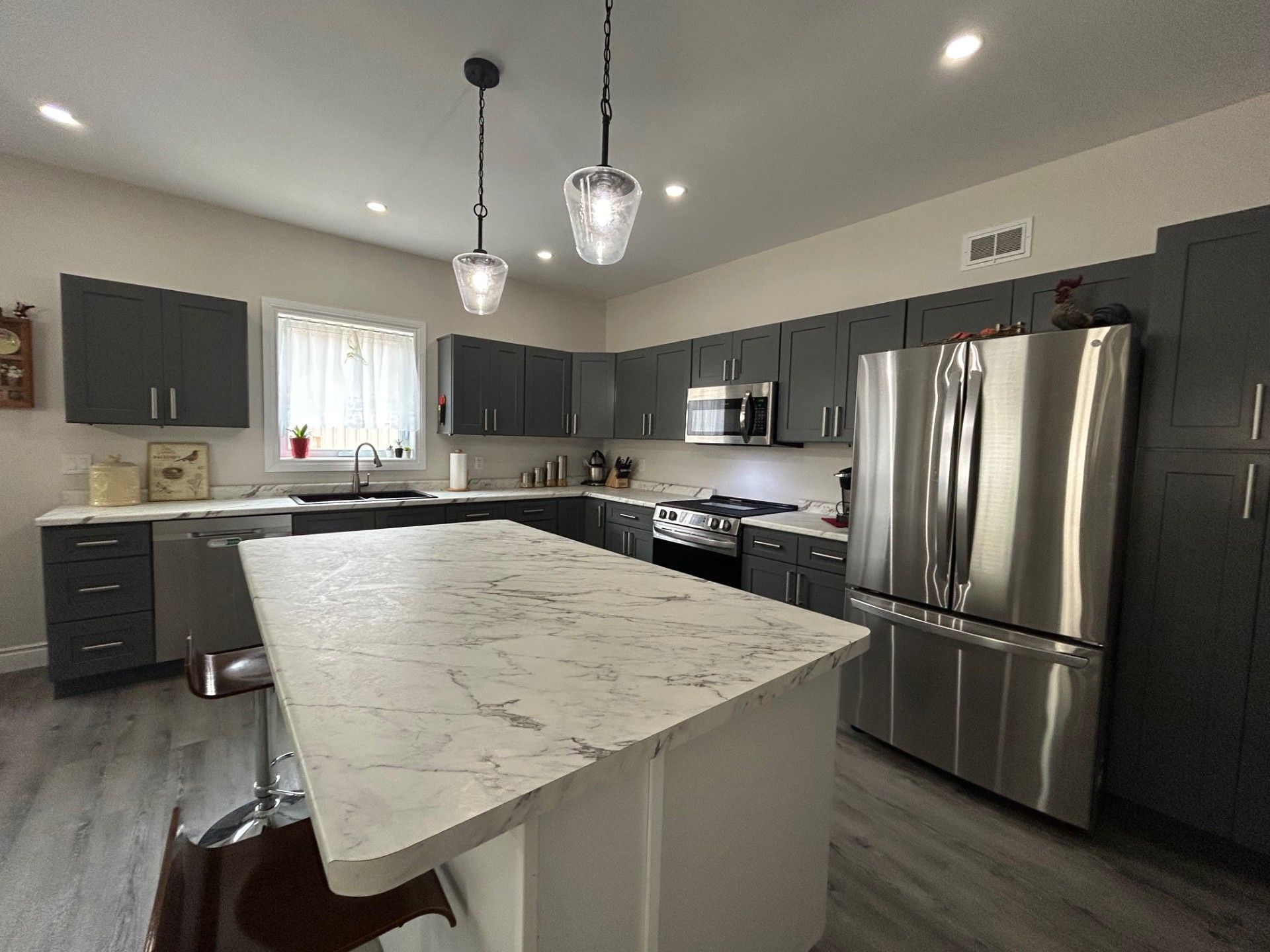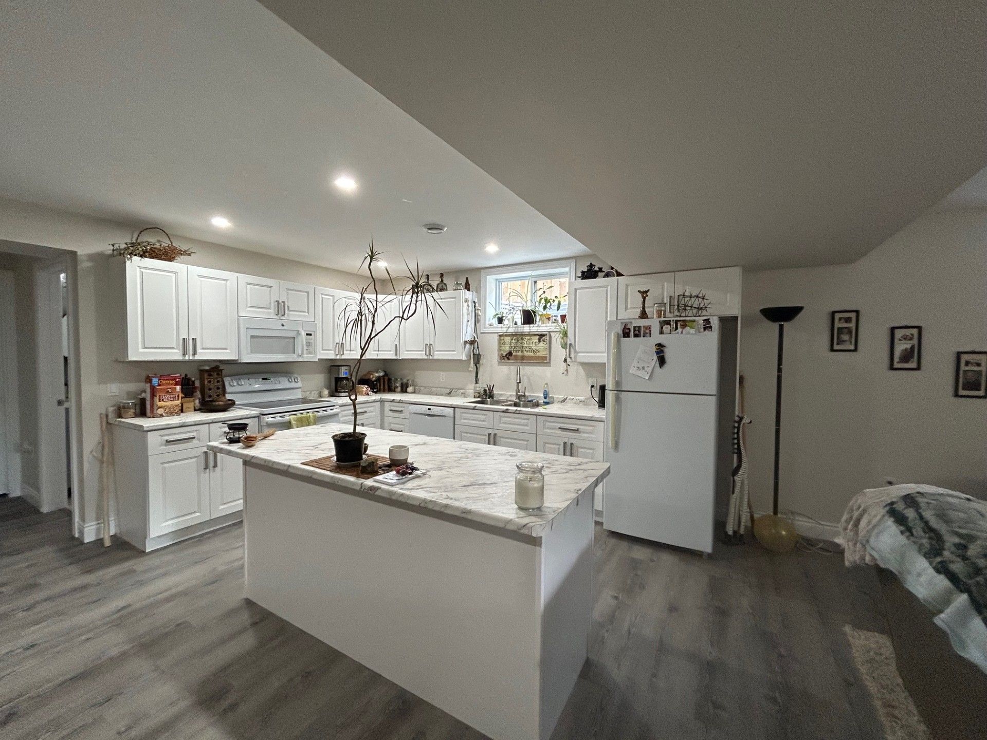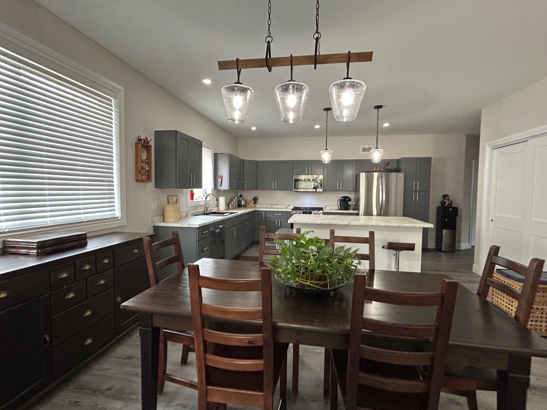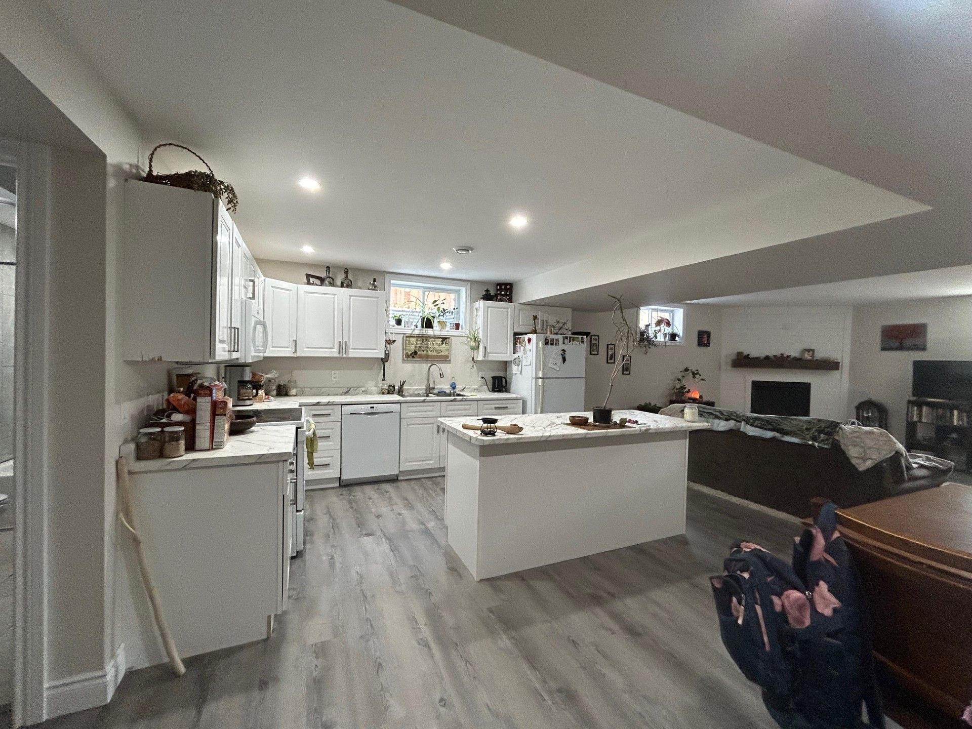 Ideal for multi-generational living | move-in ready in a quiet village subdivision. This beautifully maintained, three-year-old home is perfectly suited for multi-generational living. Located in a quiet village subdivision, it offers the ideal setup for extended family-whether accommodating senior parents or young adults starting out. The home features a tasteful, low-maintenance exterior accented with stone and a charming east-facing front porch, perfect for enjoying the morning sun. A spacious double-car garage adds both curb appeal and everyday practicality. Built just three years ago, the home boasts modern construction, efficient and affordable gas heating, and low-maintenance living for year-round comfort. Inside, a warm and inviting open-concept layout welcomes you with a cozy living room featuring a gas fireplace, a generous dining area, and a well-appointed kitchen complete with stainless steel appliances, an oversized island, abundant cabinetry, and a separate pantry. The main floor also offers a 4 piece tiled bathroom, a spacious primary bedroom with a private three-piece en-suite and laundry area, two additional guest bedrooms, and convenient interior access to both the garage and lower level. The fully finished lower level is ideal for extended family living, offering a private living space with its own kitchen, a comfortable living room with fireplace, two bedrooms, a storage area, and a private walk-out to the garage and side yard. Virtually altered photo included to illustrate the potential of the yard.