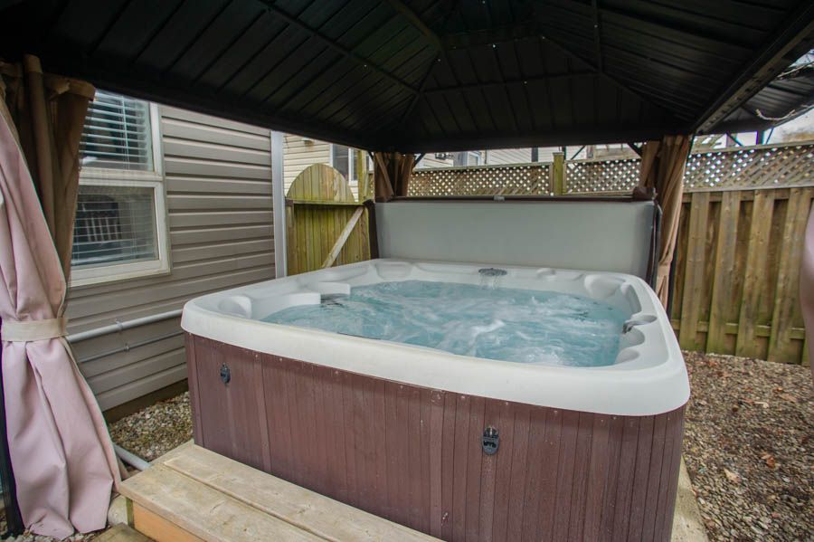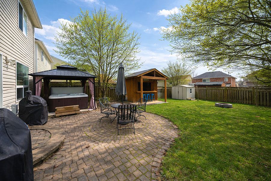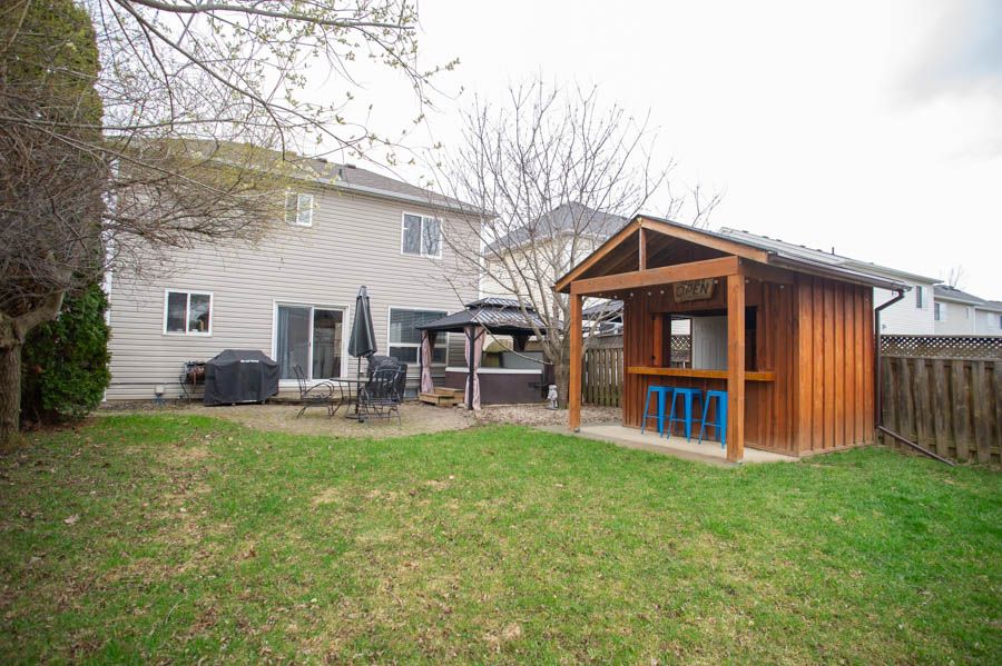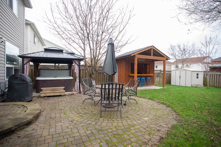 • Backyard features a gazebo, hot tub, and bar/shed setup for relaxation.
