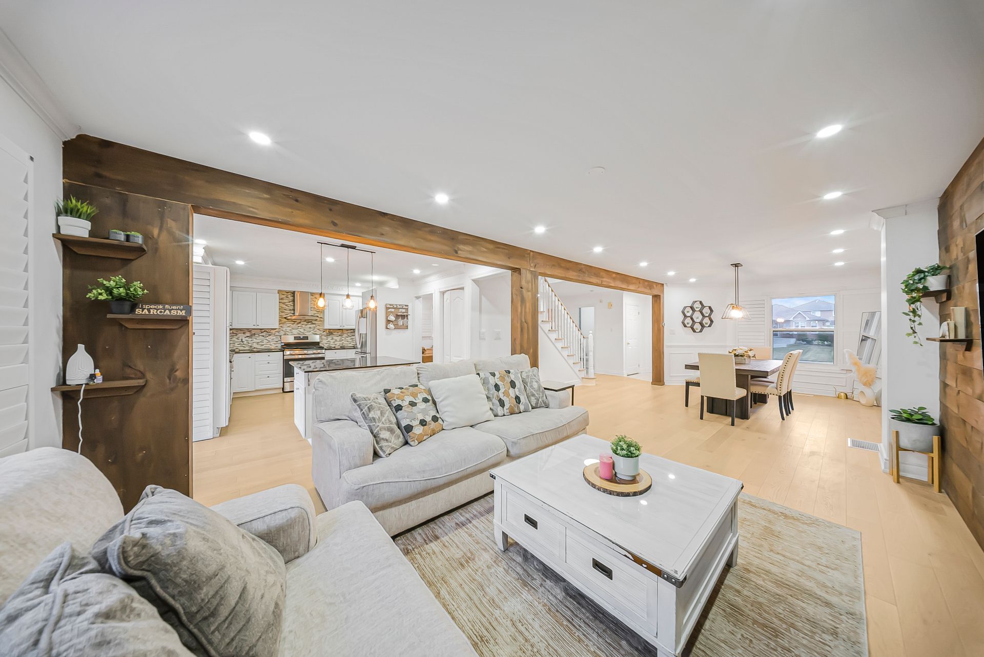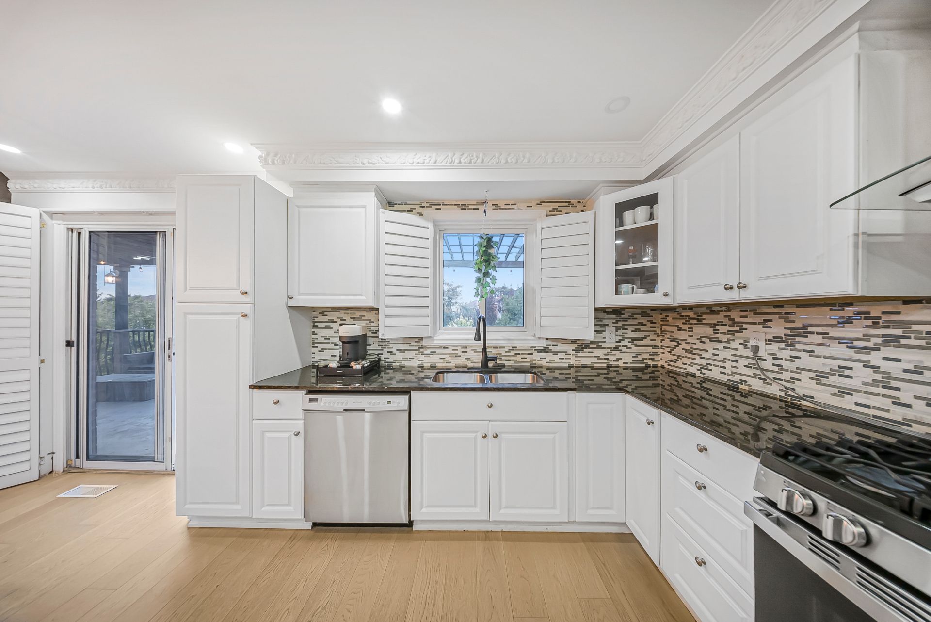• Spacious kitchen with a large center island and deck access.