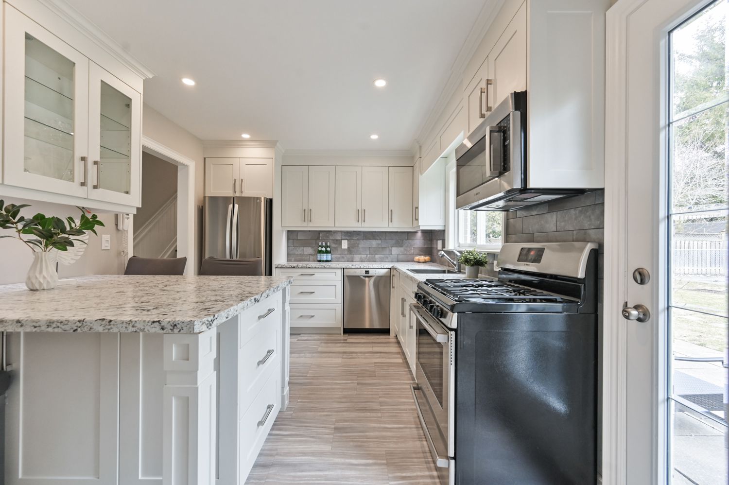 • Updated kitchen with white cabinetry, stainless steel appliances, and large island.
