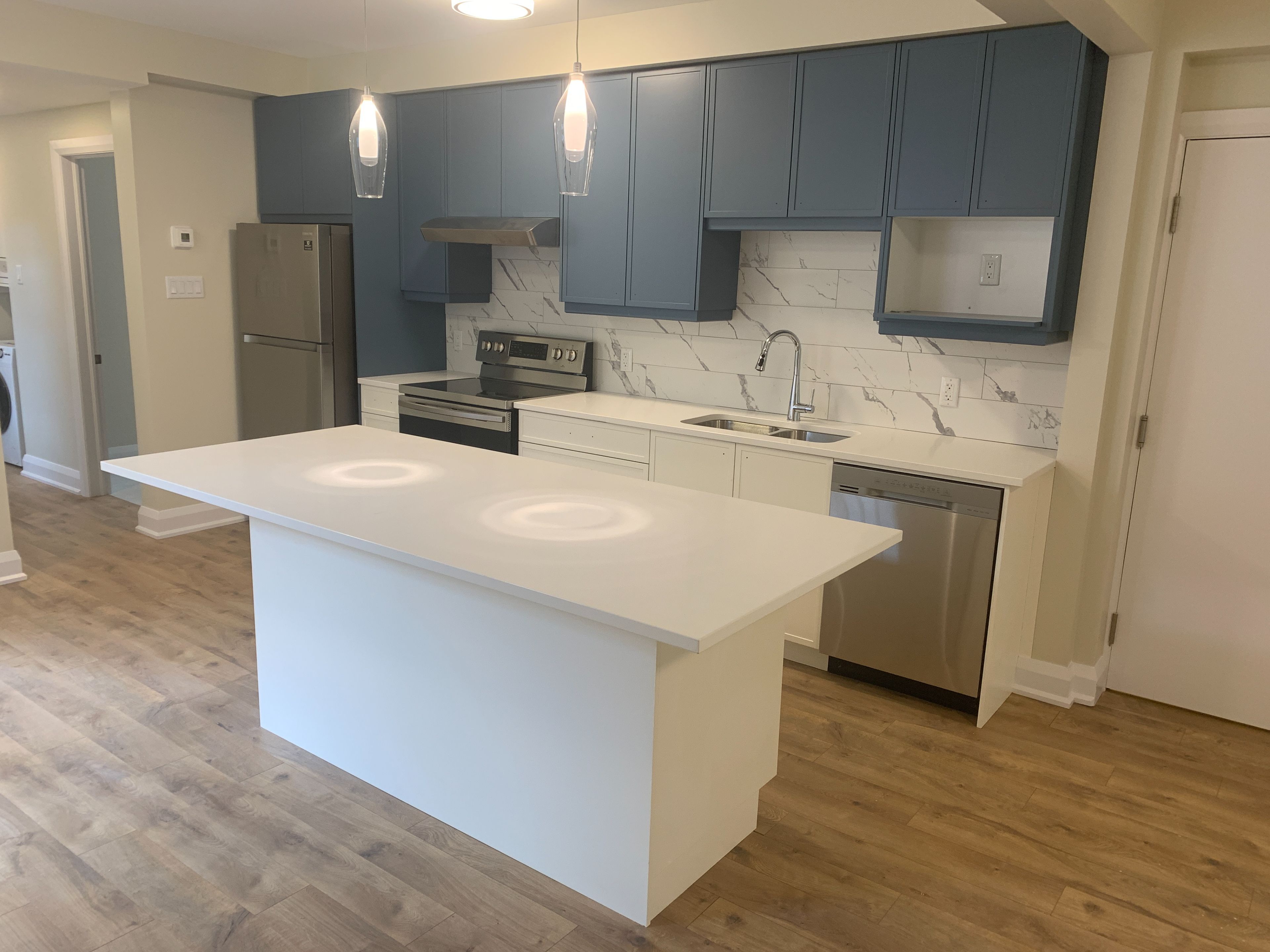 • Open-concept kitchen with quartz countertops and stainless steel appliances.