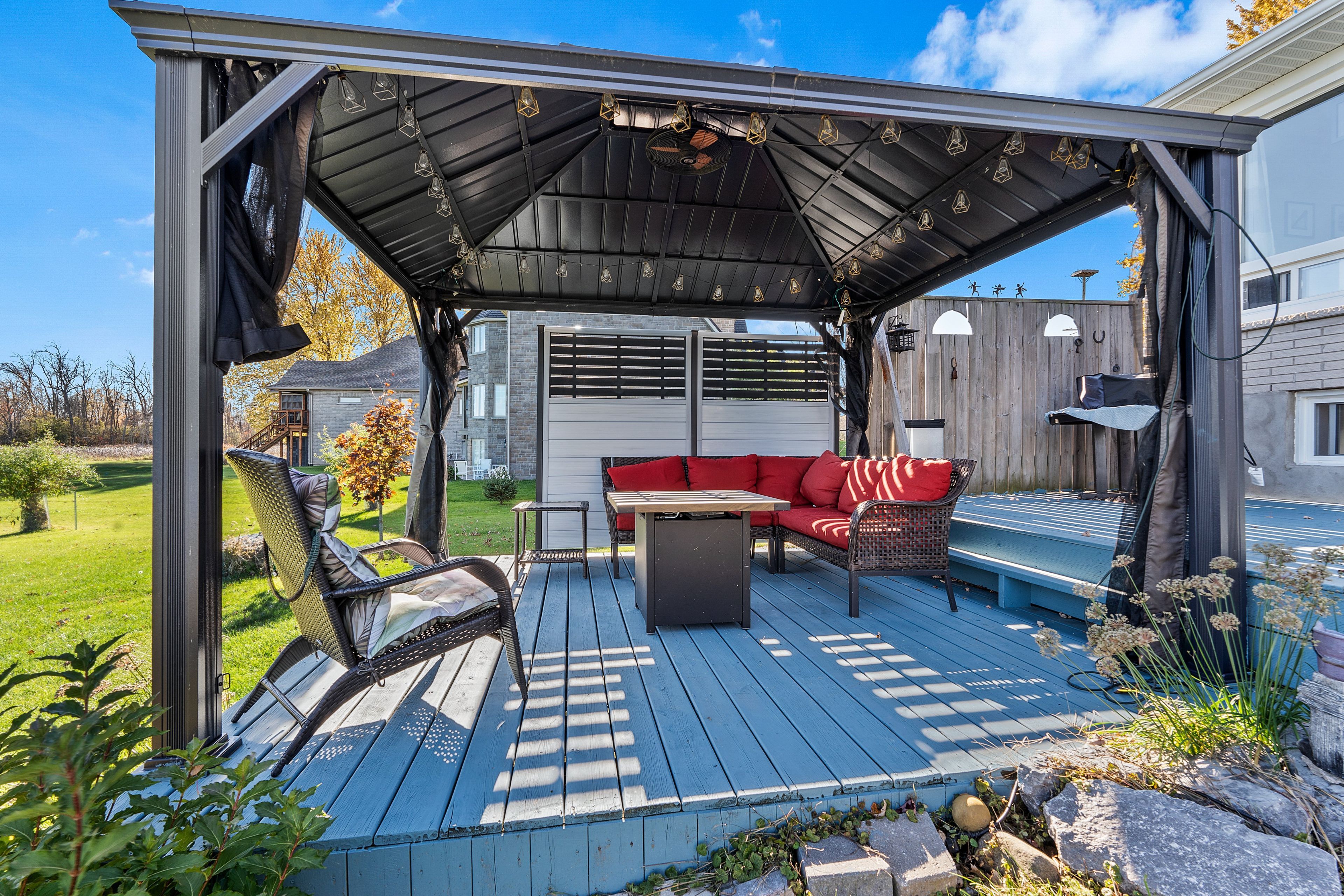 • Two-tier deck with a covered gazebo, perfect for outdoor relaxation.