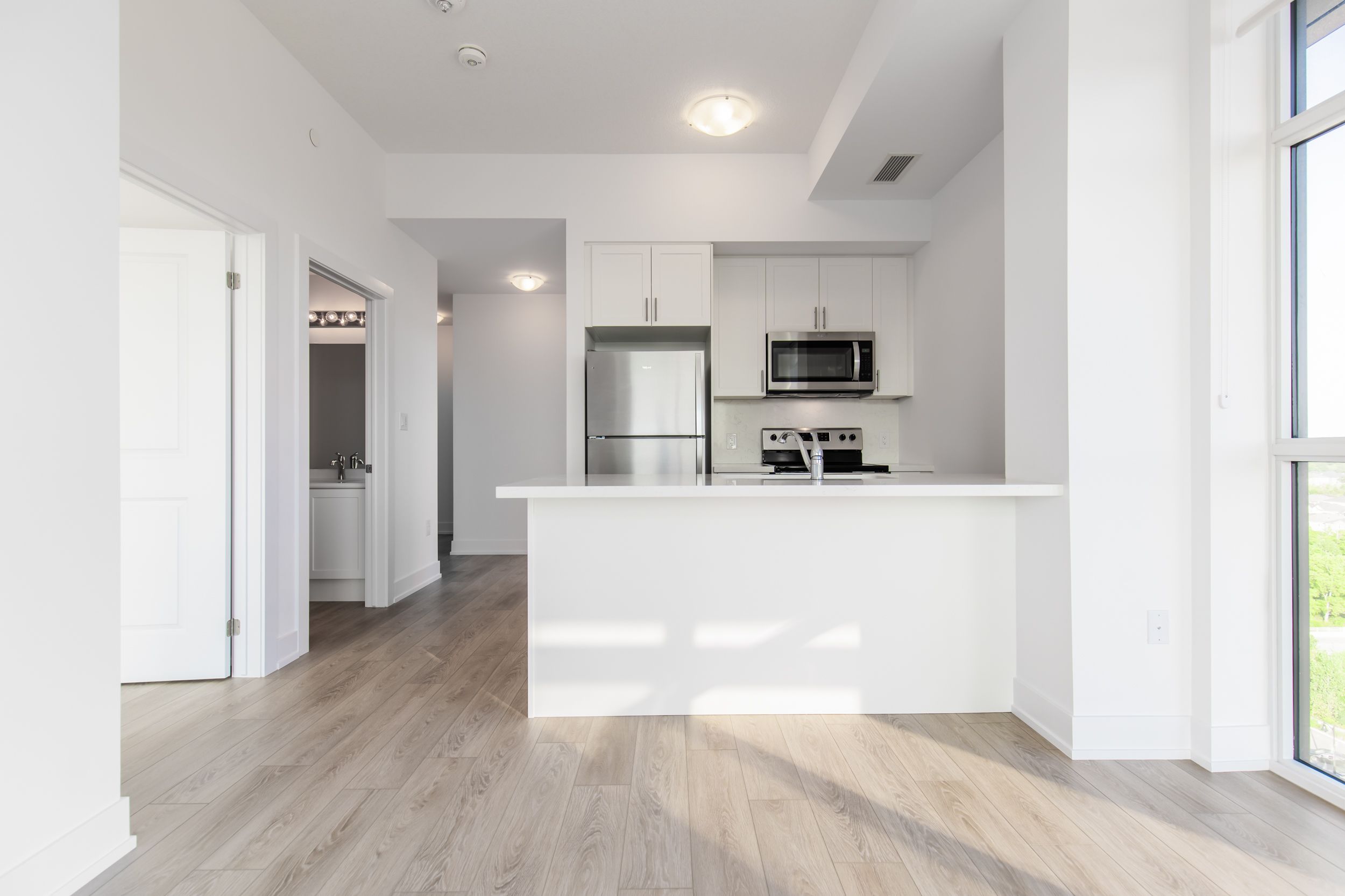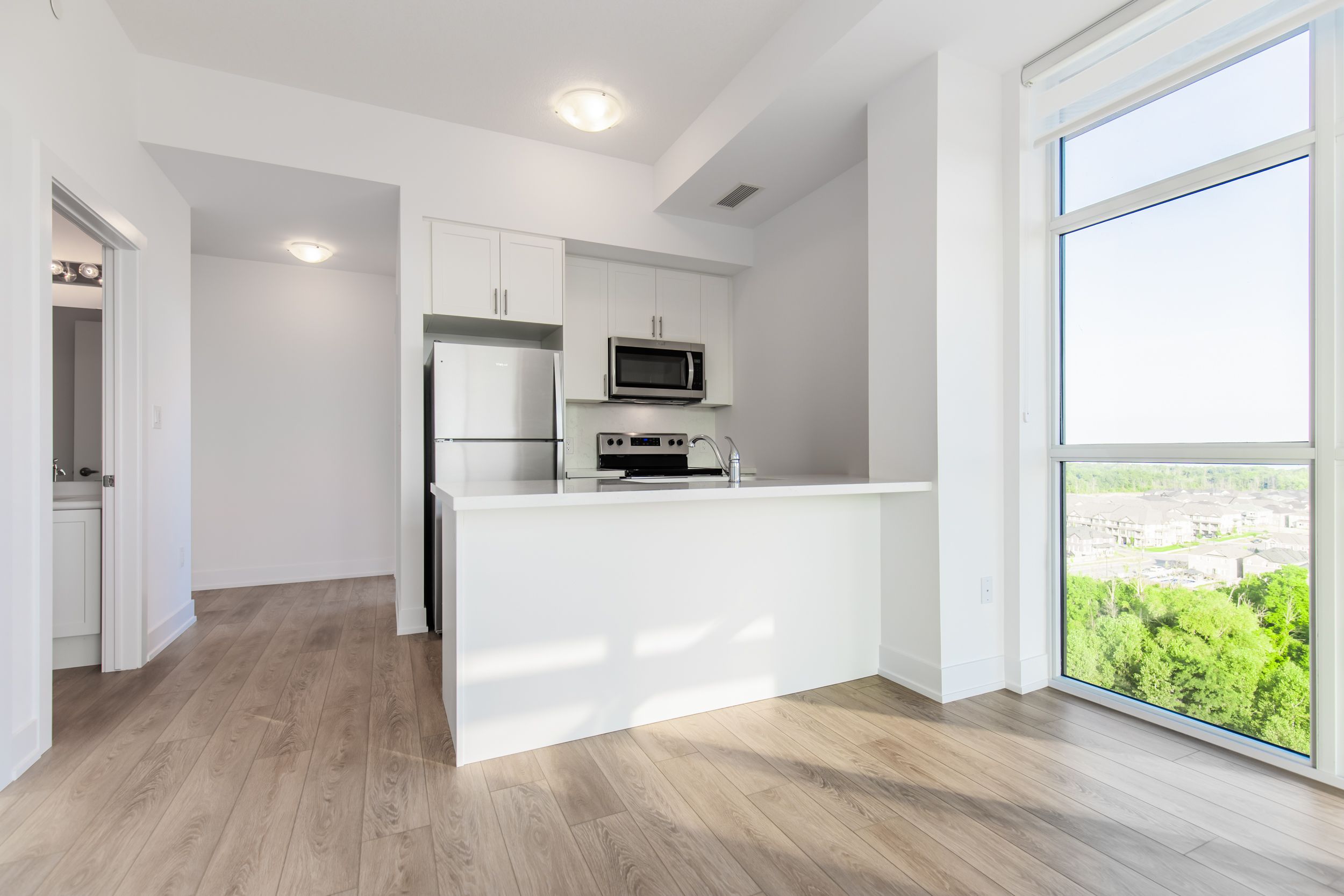 Exceptional penthouse living in a premium corner 2-bedroom, featuring 10-ft ceilings, floor-to-ceiling windows, and stunning lake views. Open floor plan kitchen and great room. Kitchen offers white shaker style cabinetry, elegant white quartz counter tops, new stainless steel appliances and island with double sink and seating for 4. Great room with outdoor access to south west balcony with sun all day! Watch spectacular sunsets from your balcony and great room. Primary bedroom and second bedroom with walk-in closets. Luxurious 4 piece bathroom complete with soaker tub. Amazing floor to ceiling windows tastefully upgraded with modern zebra blinds provide plenty of natural light in every room and other upgrades! Convenient in suite laundry, laminate floors. Includes 1 premium parking space location #a565 and storage unit #114. Enjoy all of the fabulous amenities that this building has to offer including environmentally friendly geothermal heating and ac, party rooms, modern fitness facilities, bike room, 5th floor access to terrace with bbqs. Property is conveniently located minutes away from hwy 403 & hwy 407, aldershot go station. Enjoy a hike along the amazing trails and view the smokey hollow waterfall close by. Enjoy living in this bright, sleek and stylish penthouse and experience trend 3 living at its finest! Available immediately.