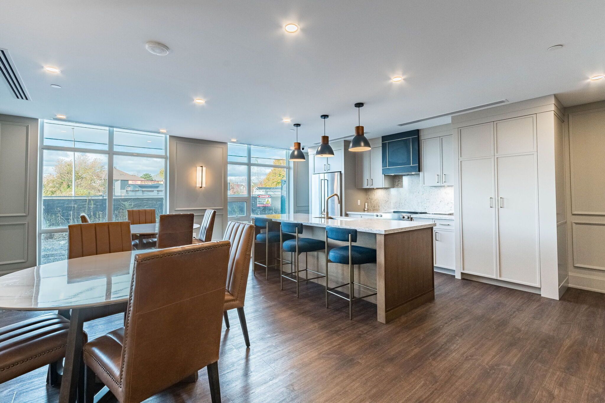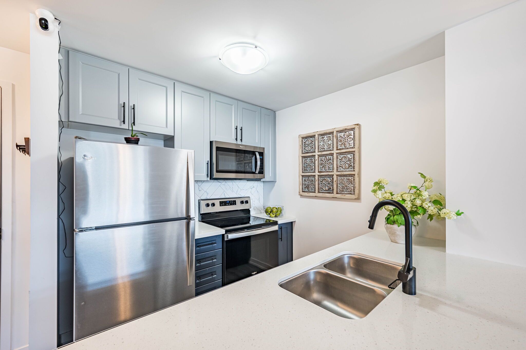 • Modern kitchen features quartz countertops and stainless steel appliances.