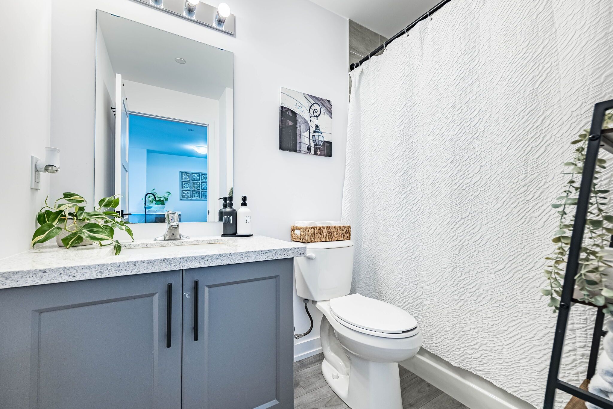 Bright and thoughtfully designed 1-bedroom condo offering a highly functional open-concept layout that maximizes every inch of space. Modern kitchen with quartz countertops, stainless steel appliances, and a spacious breakfast bar-perfect for both everyday living and entertaining. Seamless flow from kitchen to living area creates a comfortable and practical living space that feels larger than expected. Sun-filled living room with walk-out to private balcony, providing a great extension of your living space. Well-proportioned bedroom with natural light and ample closet space. Clean, contemporary finishes throughout with a cohesive, move-in ready presentation. Includes 1 parking space and storage locker, adding convenience and everyday practicality. Efficient layout and low-maintenance lifestyle make this an ideal option for first-time buyers, investors, dr downsizers. Located in desirable waterdown community close to shopping, restaurants, parks, transit, and major highways.