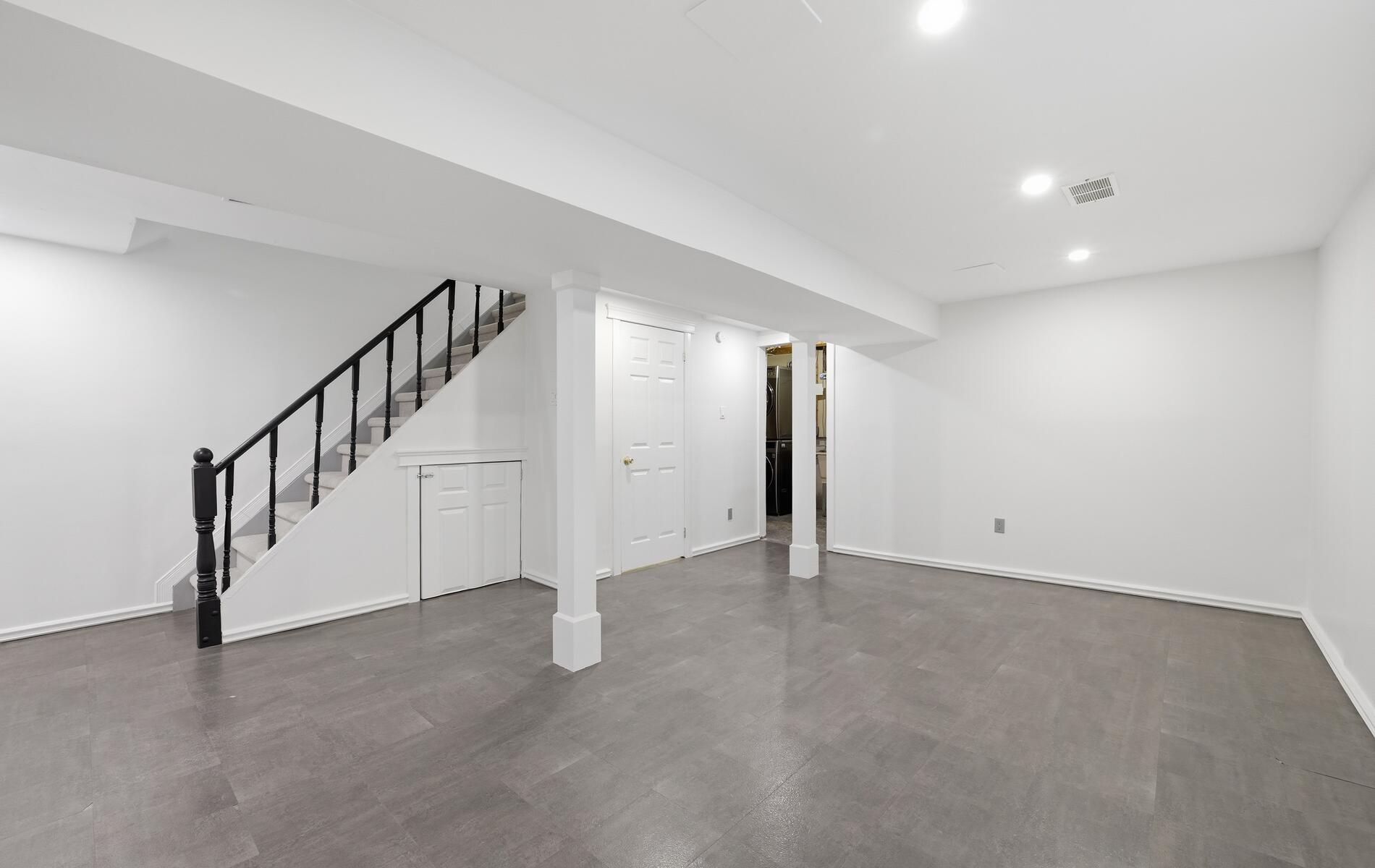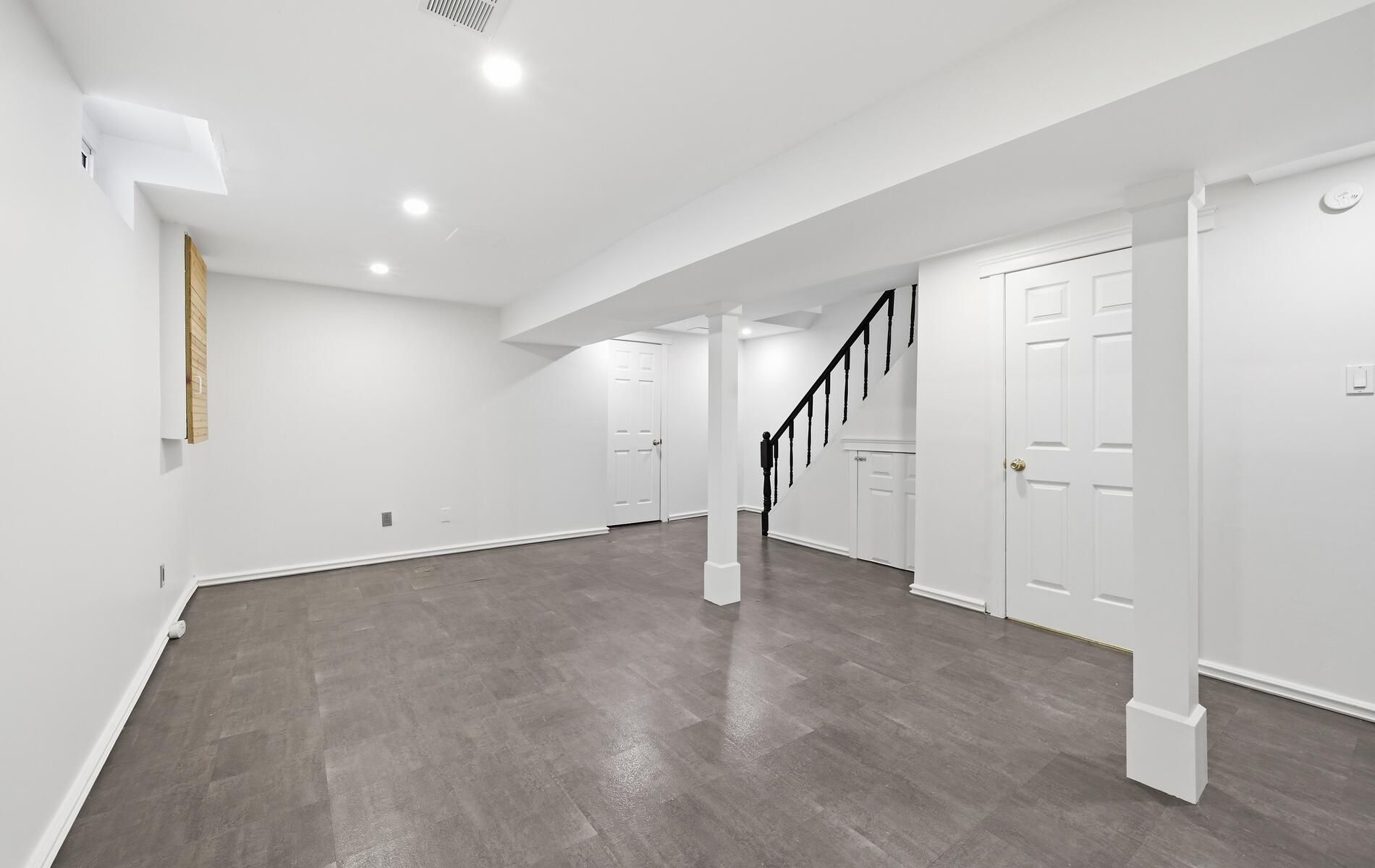 • Bright basement with pot lights, perfect for a recreational room.