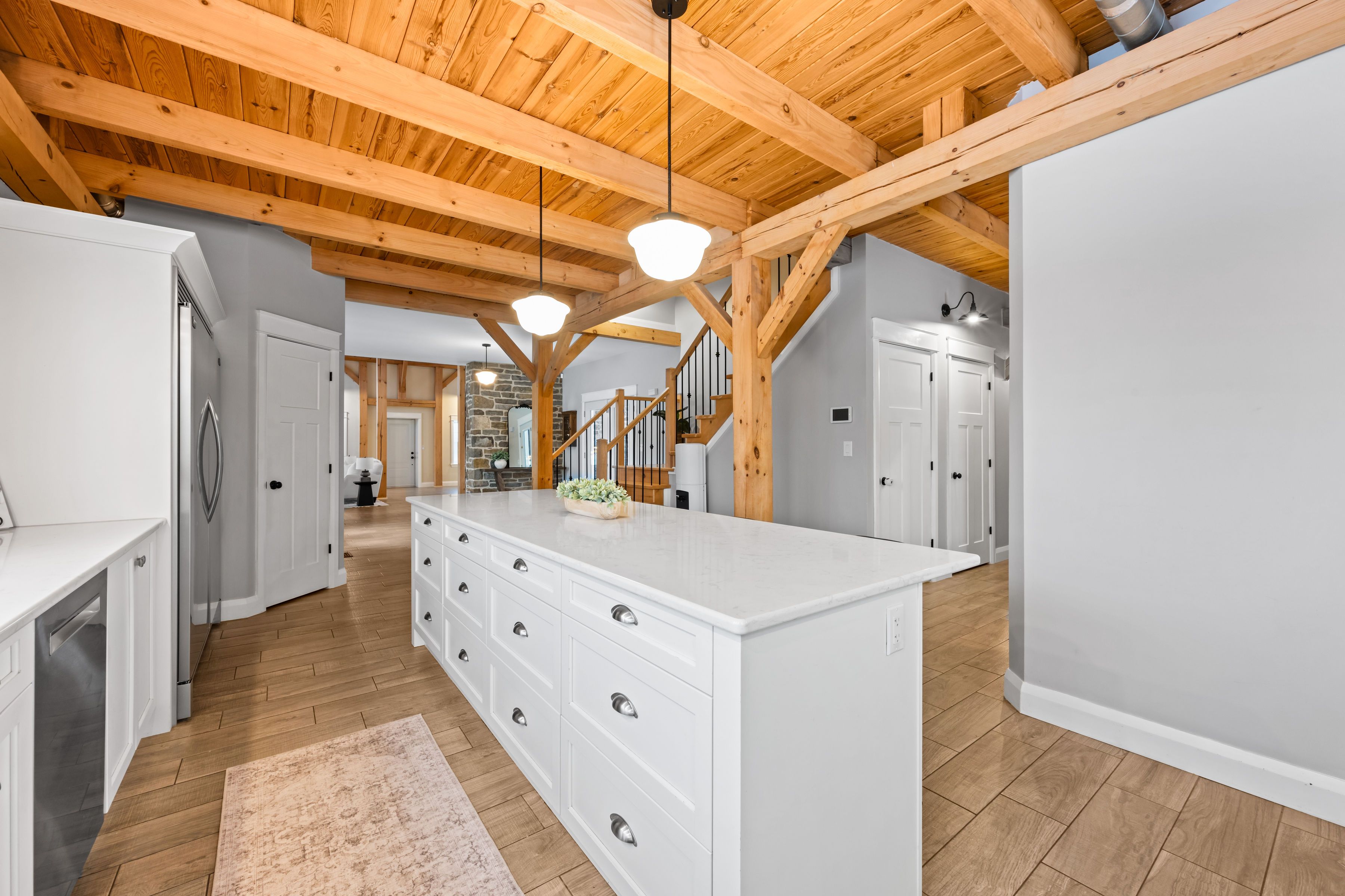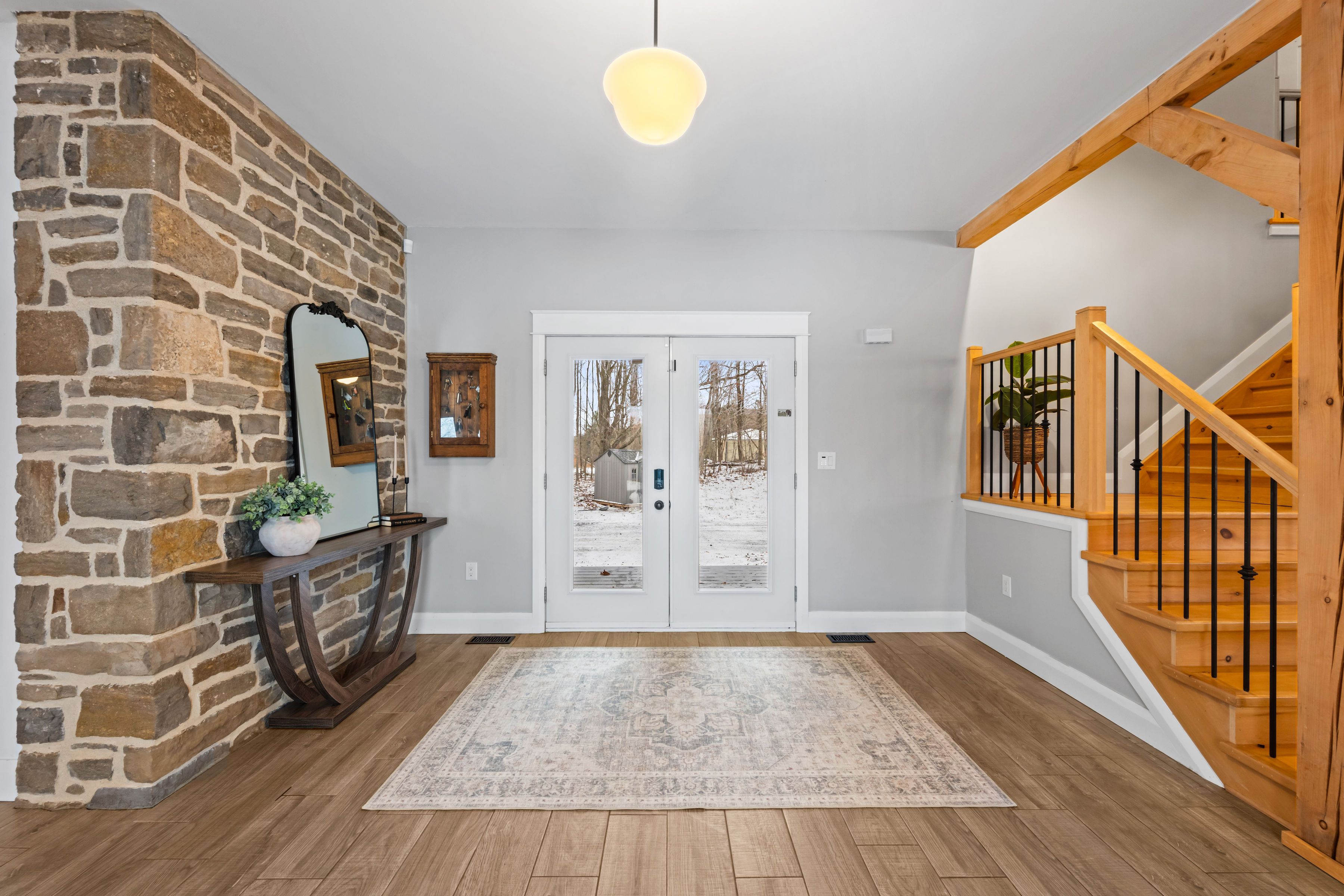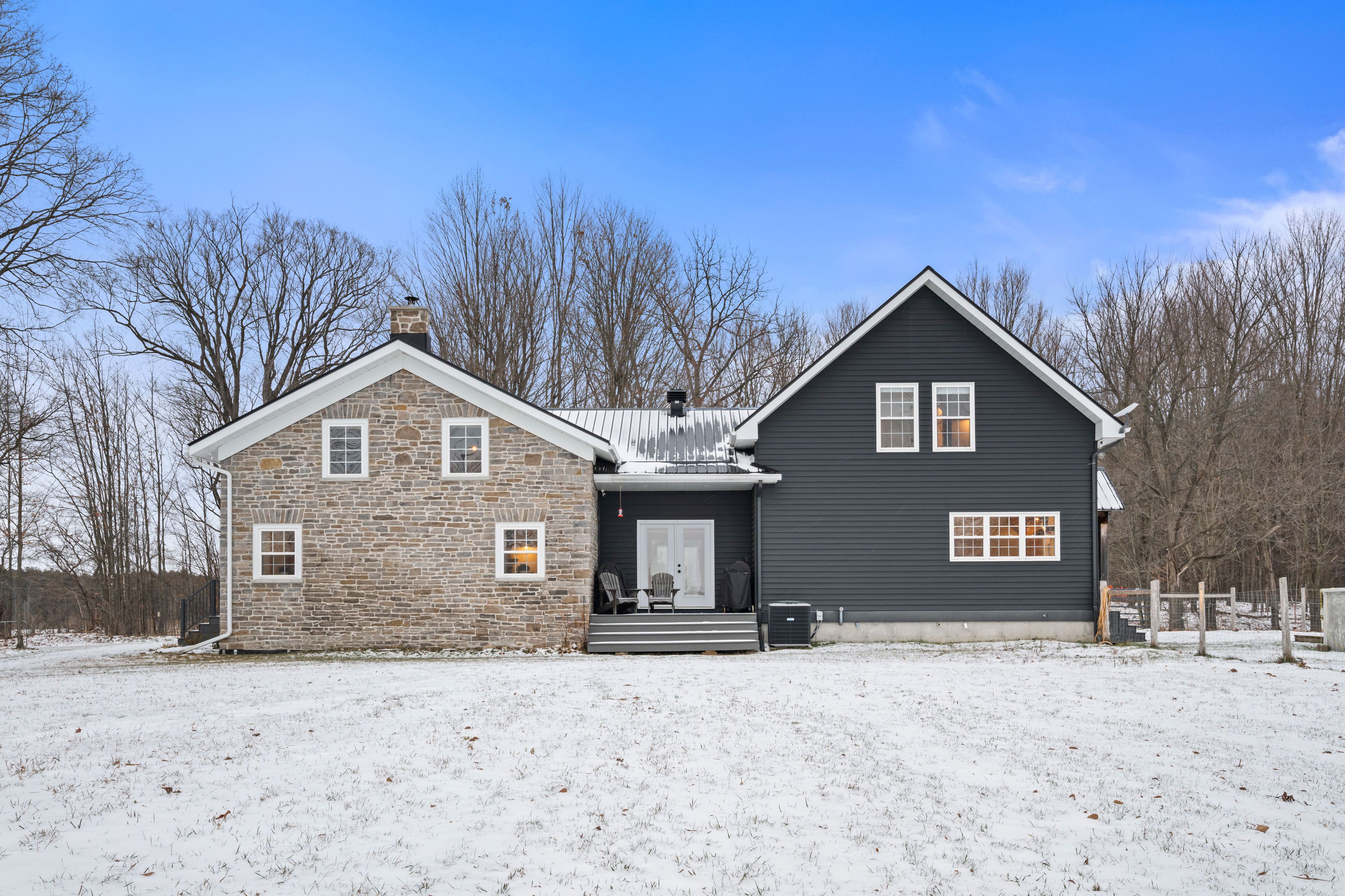 Beautifully restored 1848 stone home set on 41 acres of mixed trees and cleared land. Fully restored with a stunning addition completed in 2018, this property blends original character with modern comfort. Major updates include septic system (2015, cert on file), drilled well (2016, record on file), forced air furnace (2017), central air (2017), and a jøtul wood stove installed in 2020 (wett certified). Stone exterior repointed in 2015. Inside, the home showcases vaulted ceilings, exposed timber beams, recessed windows, a metal roof, porcelain tile flooring on the main level, and hemlock flooring on the upper level. The spacious farmhouse kitchen features a walk-in pantry and picturesque views of the surrounding countryside. The main floor continues with an open-concept dining and living room warmed by the wood stove. Offering 5 bedrooms and 3 bathrooms, including a generous primary suite with a 5-piece ensuite and soaker tub, plus upper-level laundry and a finished basement for additional living space. The 60x40 barn/garage was built in 2023 and provides exceptional versatility, featuring a metal roof, poured concrete foundation, 200-amp panel, and insulated doors. Currently configured to accommodate up to 7 vehicles. A rare opportunity to own a beautifully restored historic home with extensive modern upgrades, exceptional outbuildings, and acreage suited for a wide range of uses.