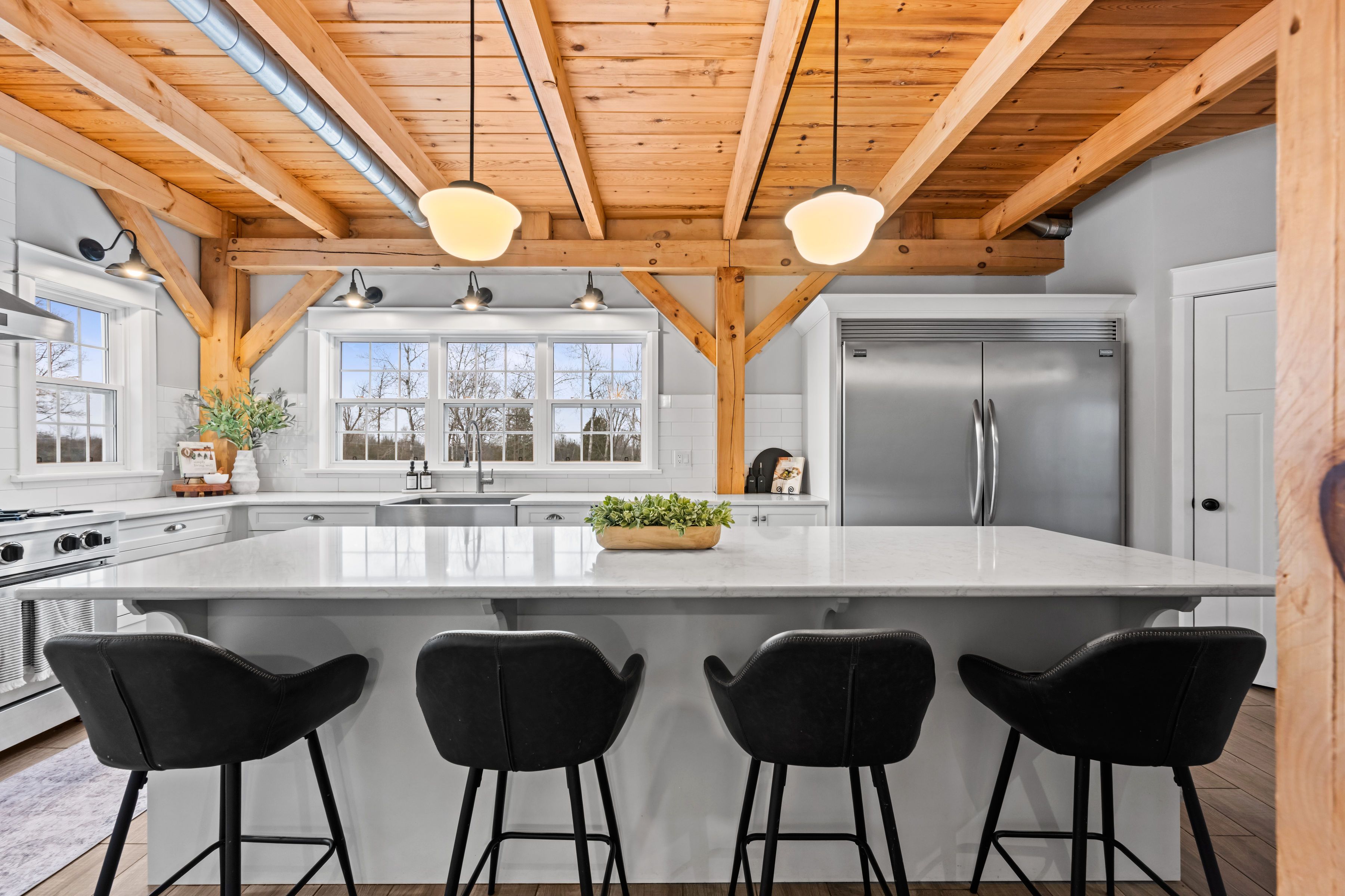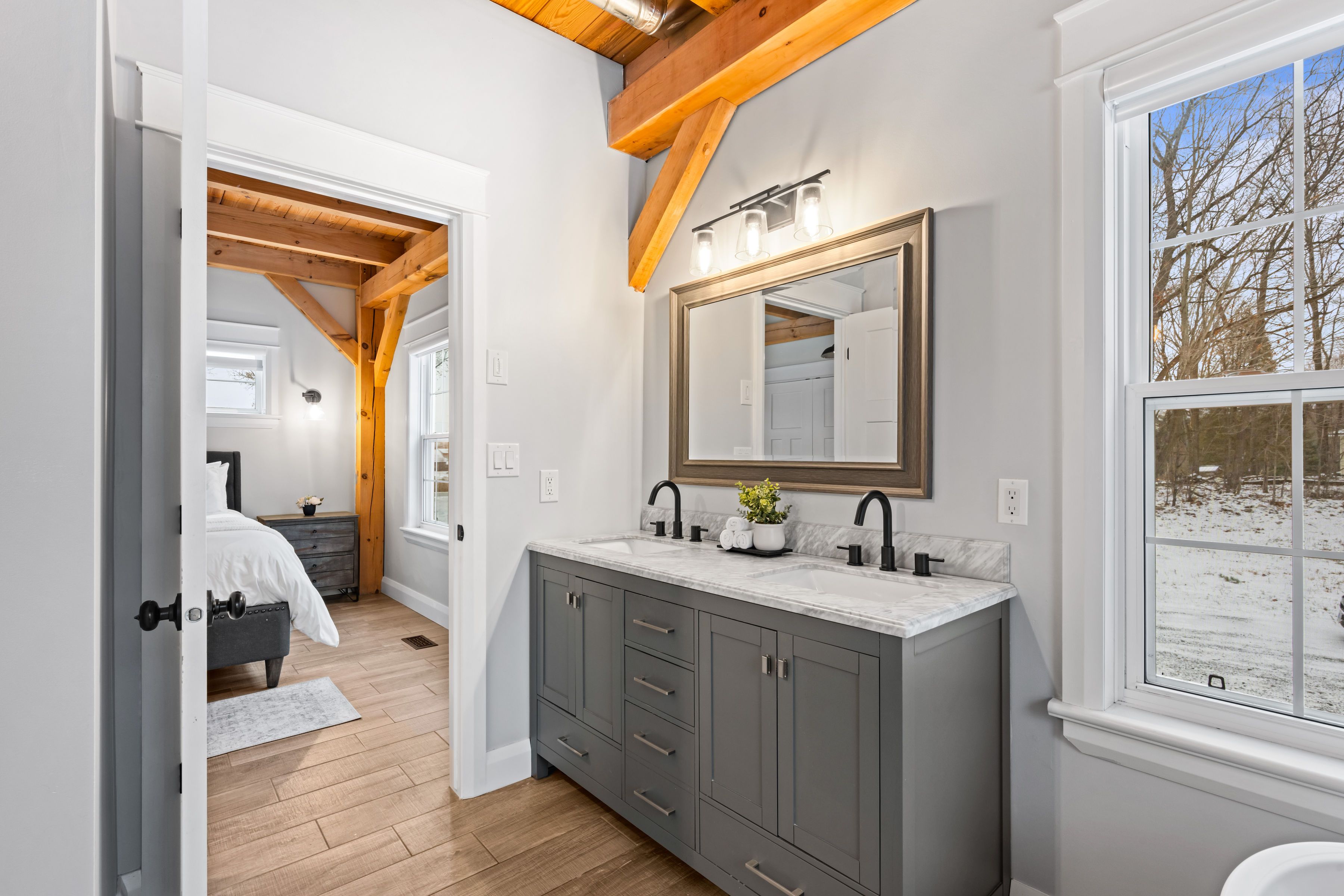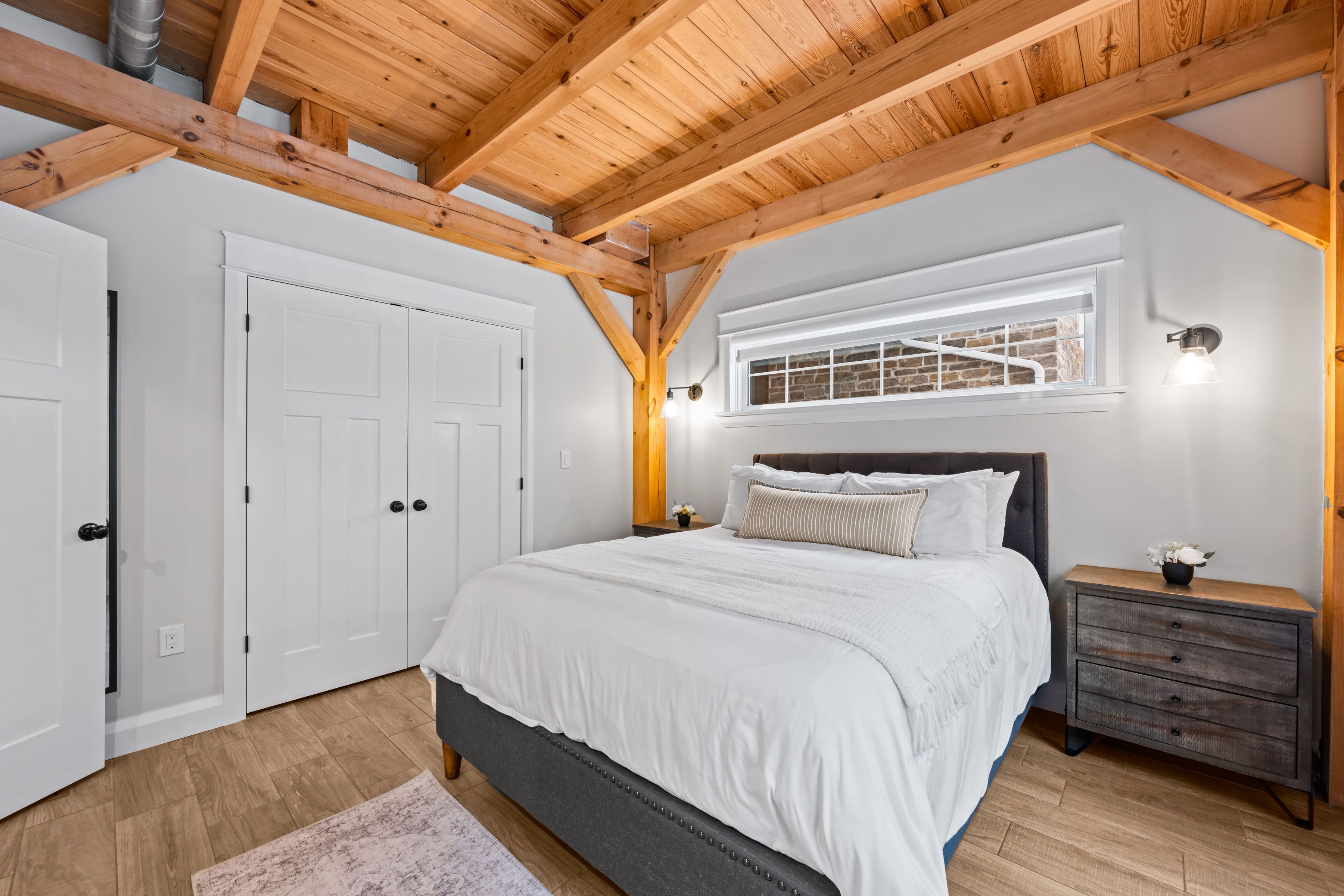 Beautifully restored 1848 stone home set on 41 acres of mixed trees and cleared land. Fully restored with a stunning addition completed in 2018, this property blends original character with modern comfort. Major updates include septic system (2015, cert on file), drilled well (2016, record on file), forced air furnace (2017), central air (2017), and a jøtul wood stove installed in 2020 (wett certified). Stone exterior repointed in 2015. Inside, the home showcases vaulted ceilings, exposed timber beams, recessed windows, a metal roof, porcelain tile flooring on the main level, and hemlock flooring on the upper level. The spacious farmhouse kitchen features a walk-in pantry and picturesque views of the surrounding countryside. The main floor continues with an open-concept dining and living room warmed by the wood stove. Offering 5 bedrooms and 3 bathrooms, including a generous primary suite with a 5-piece ensuite and soaker tub, plus upper-level laundry and a finished basement for additional living space. The 60x40 barn/garage was built in 2023 and provides exceptional versatility, featuring a metal roof, poured concrete foundation, 200-amp panel, and insulated doors. Currently configured to accommodate up to 7 vehicles. A rare opportunity to own a beautifully restored historic home with extensive modern upgrades, exceptional outbuildings, and acreage suited for a wide range of uses.