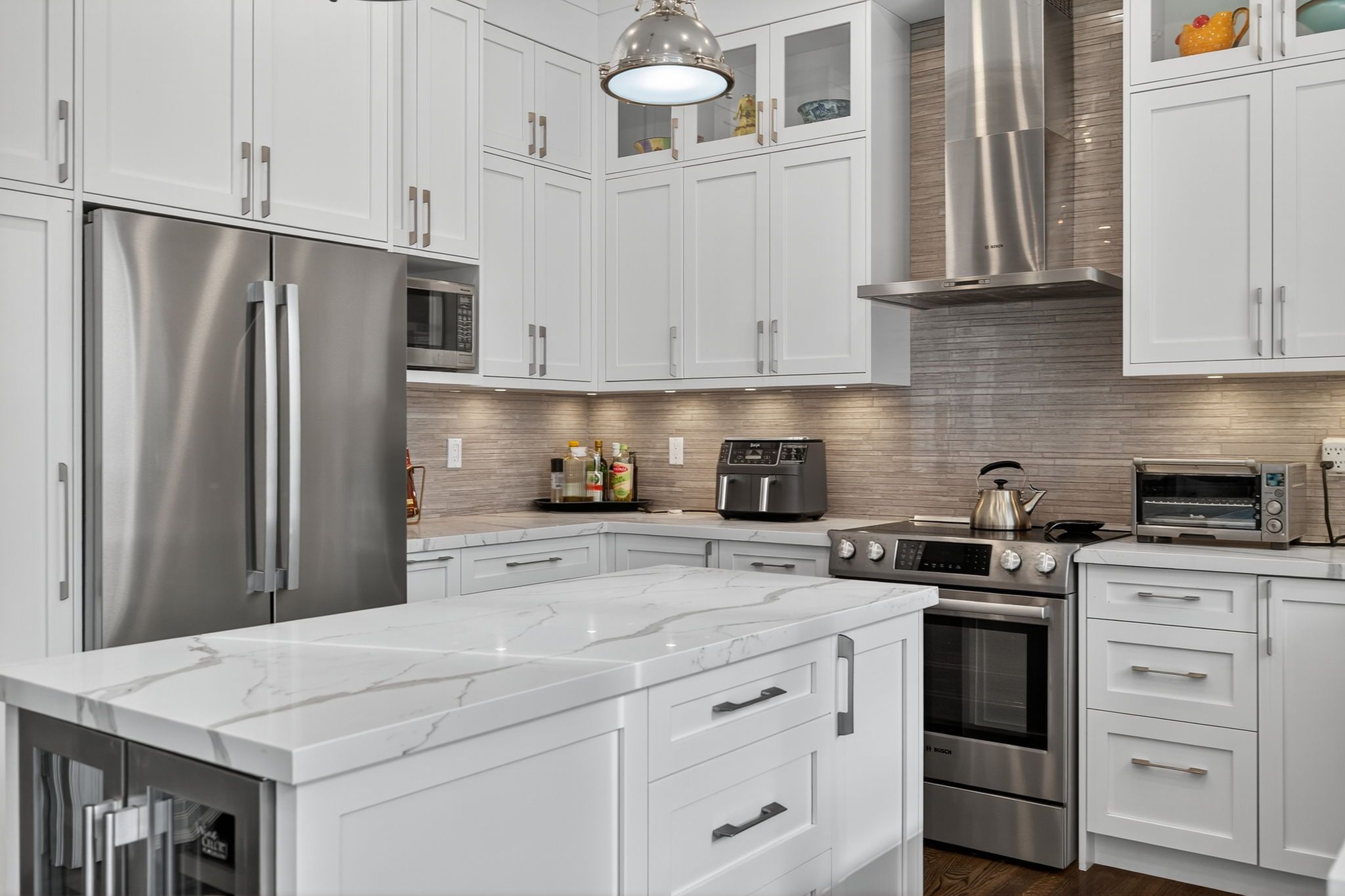 • Renovated gourmet kitchen with breakfast area and garden deck access.