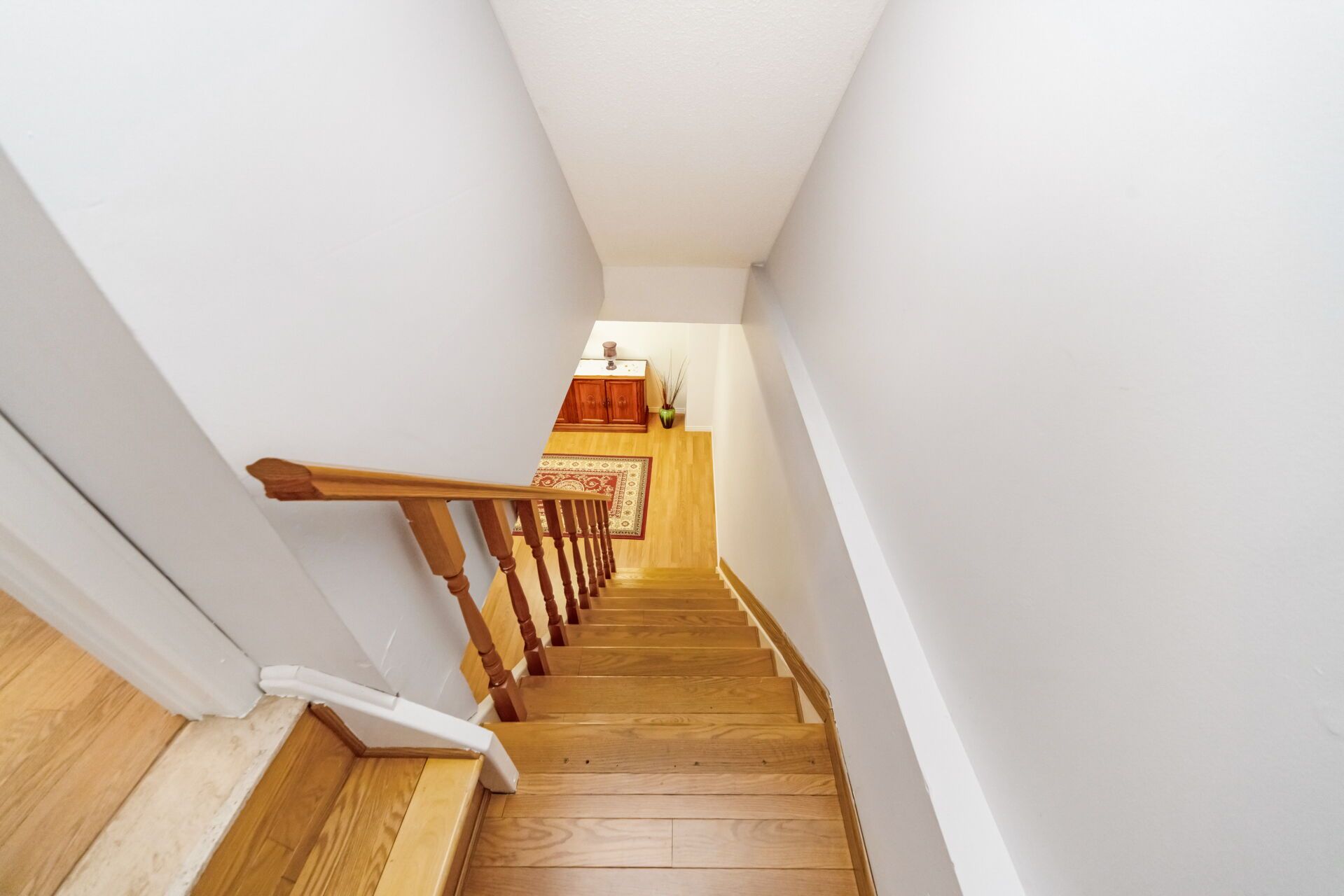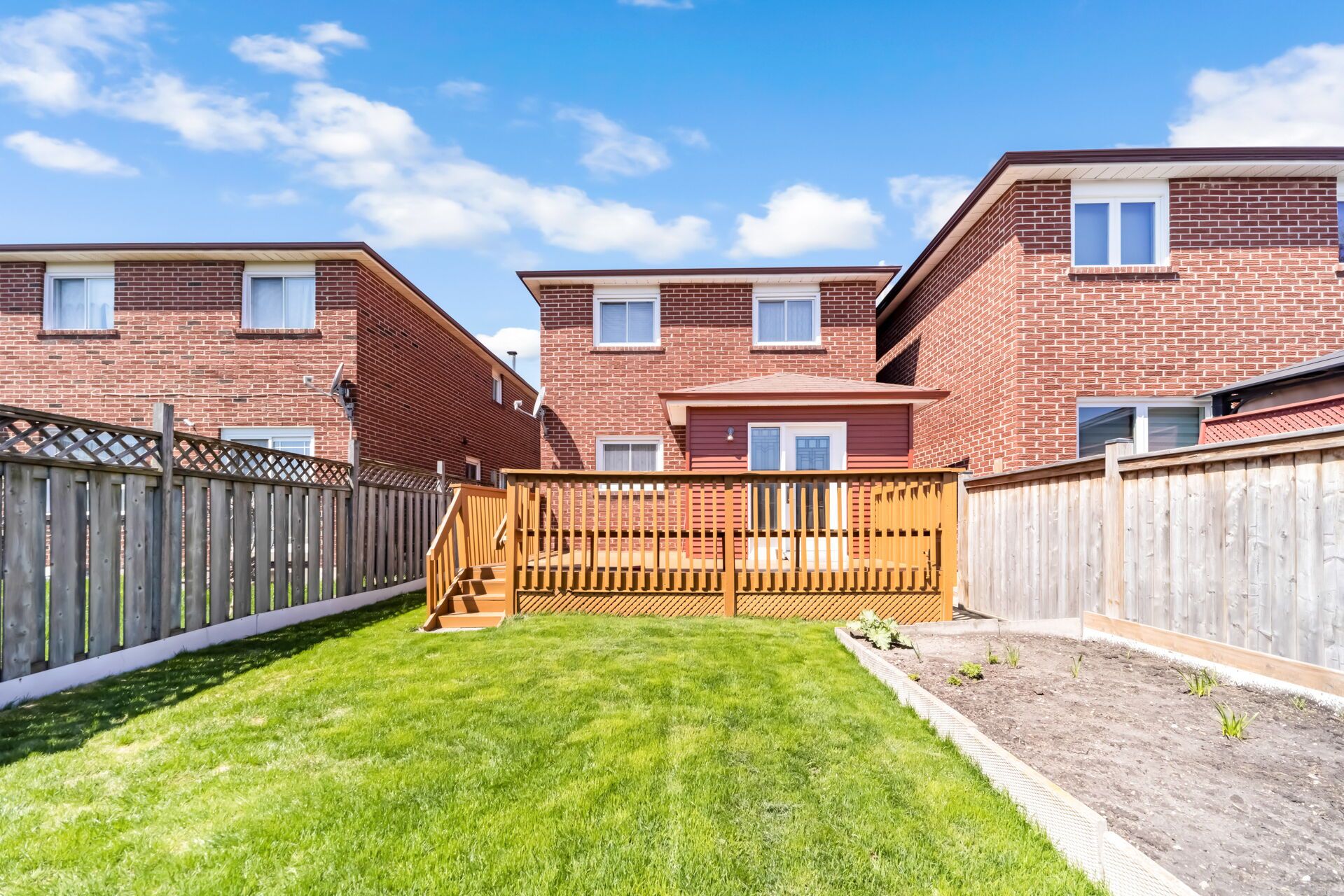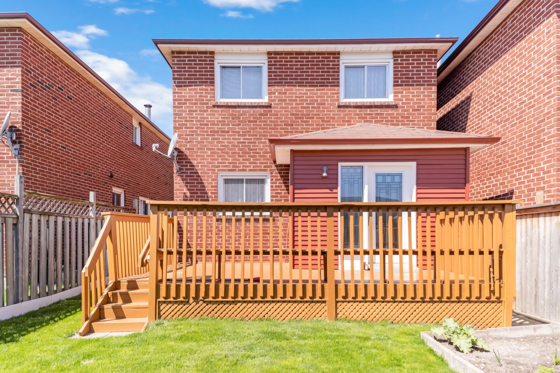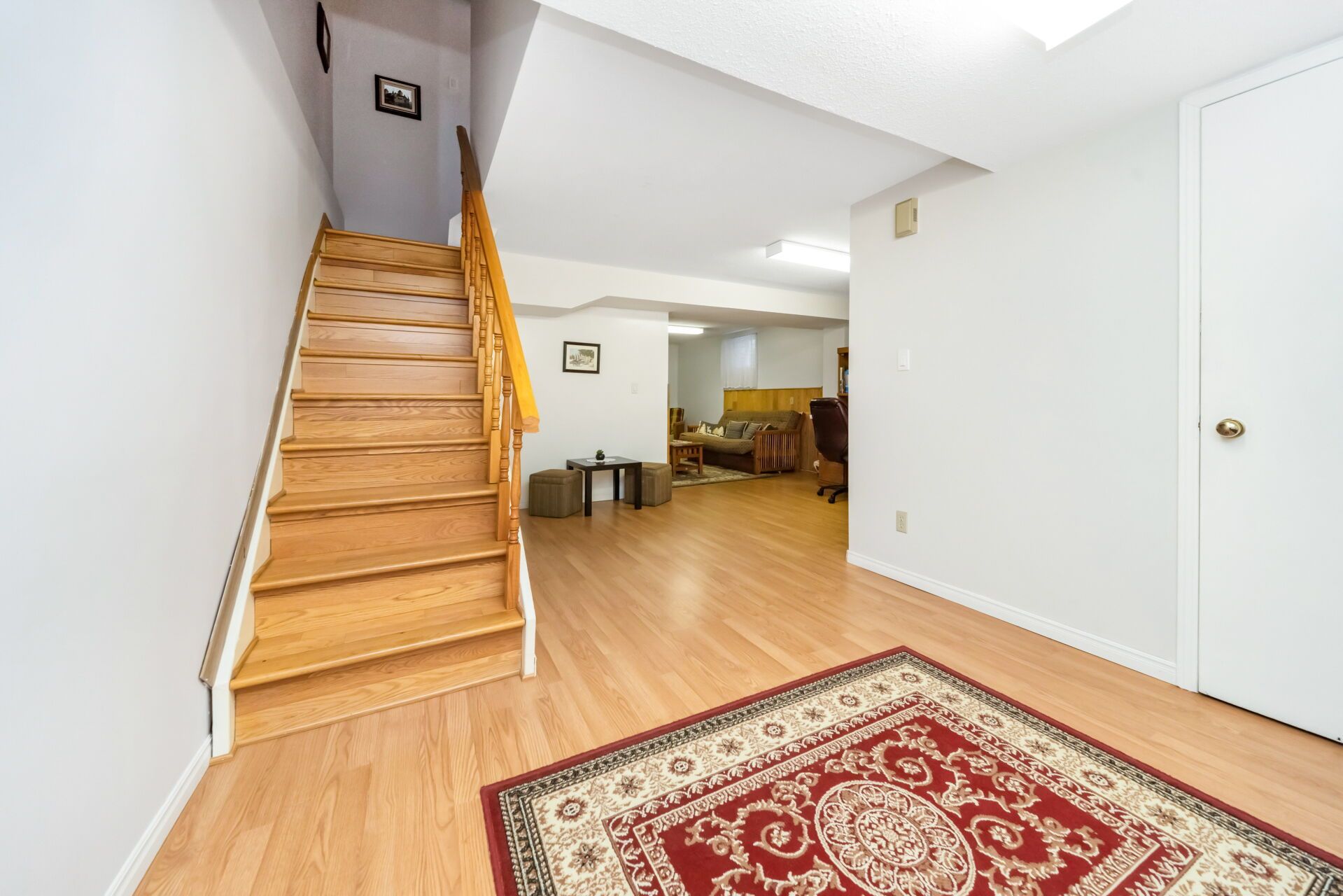 Charming 2-storey link detached home with functional living space. The main floor offers an open living/dining area, hardwood floor throughout, a bright kitchen with laminate flooring and walk-out to the backyard deck, and a convenient powder room. Upstairs features a spacious primary bedroom with walk-in closet, two additional bedrooms, and a full 4-piece bath. The finished basement adds a den, recreation room, and laundry. Roof replaced approximately 3-4 years ago. Enjoy a private backyard complete with a wonderful deck.